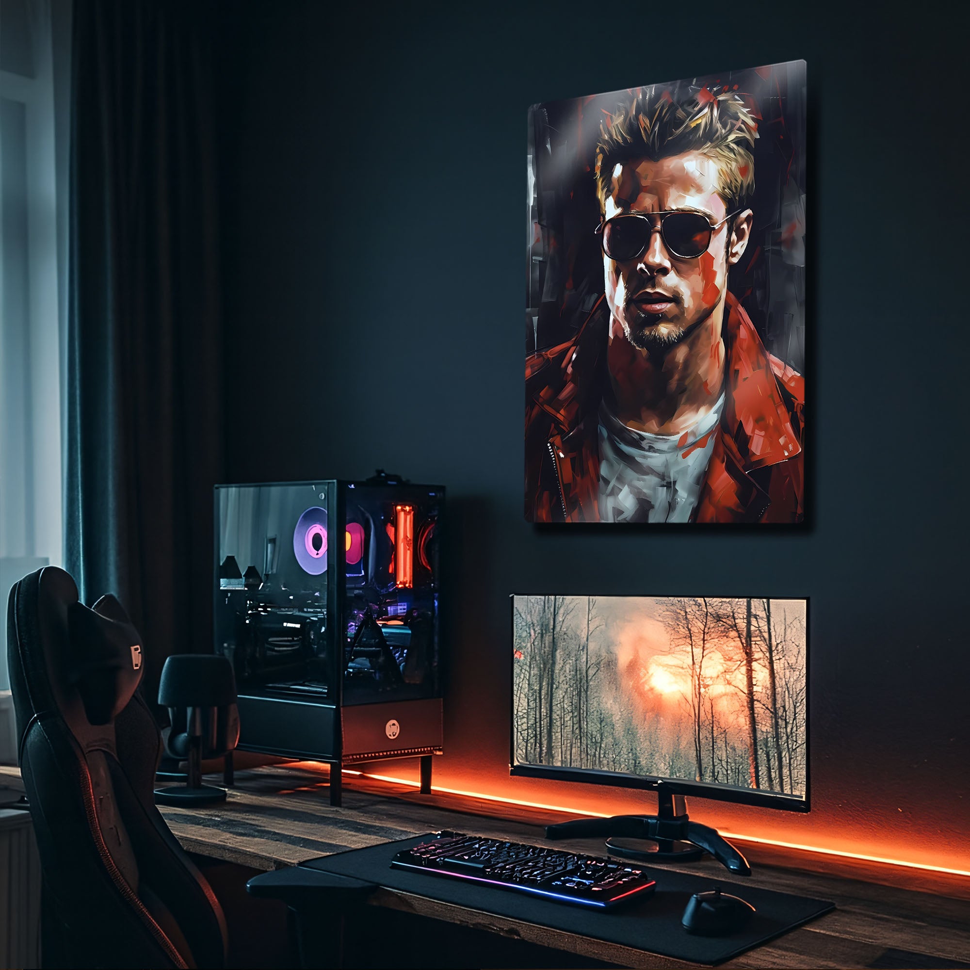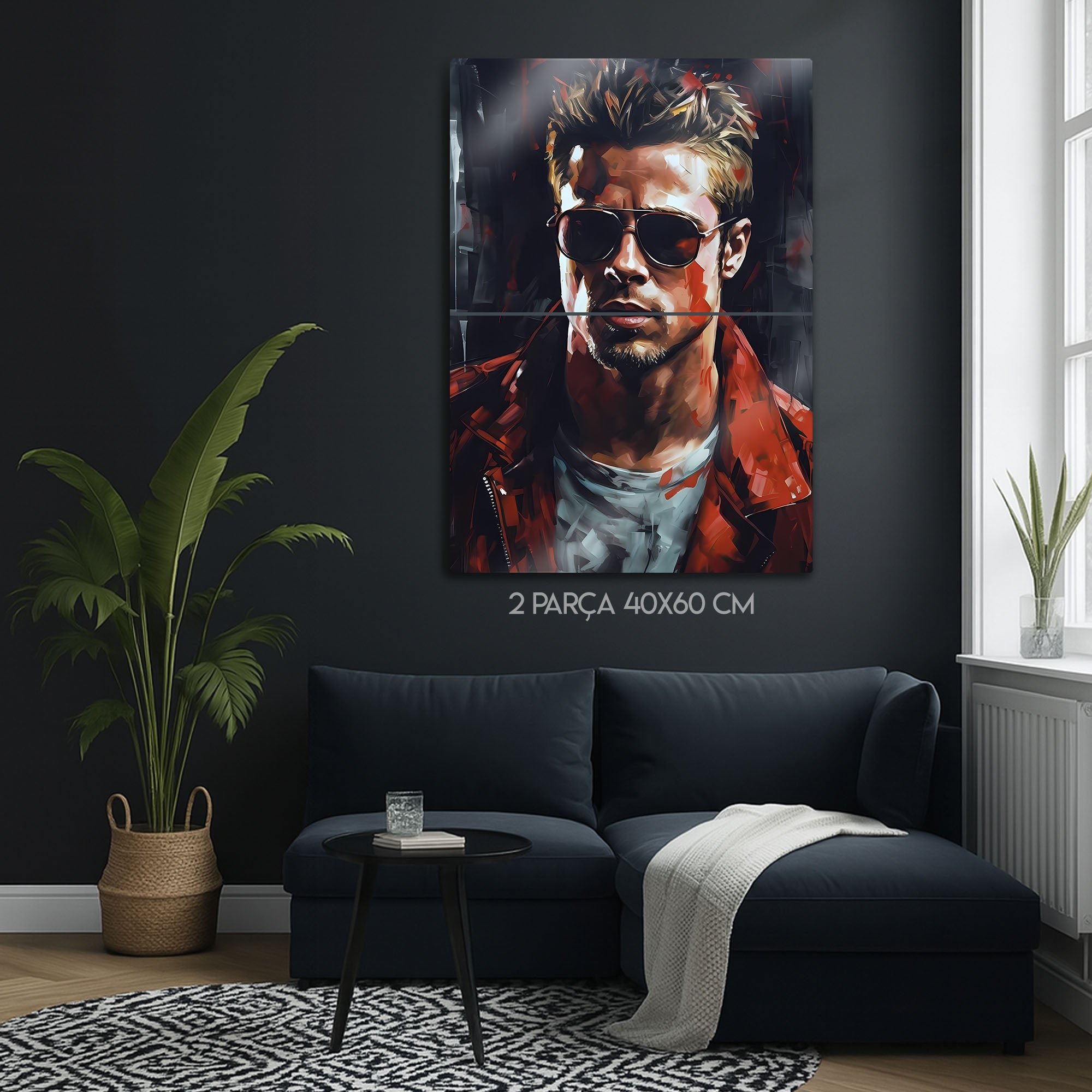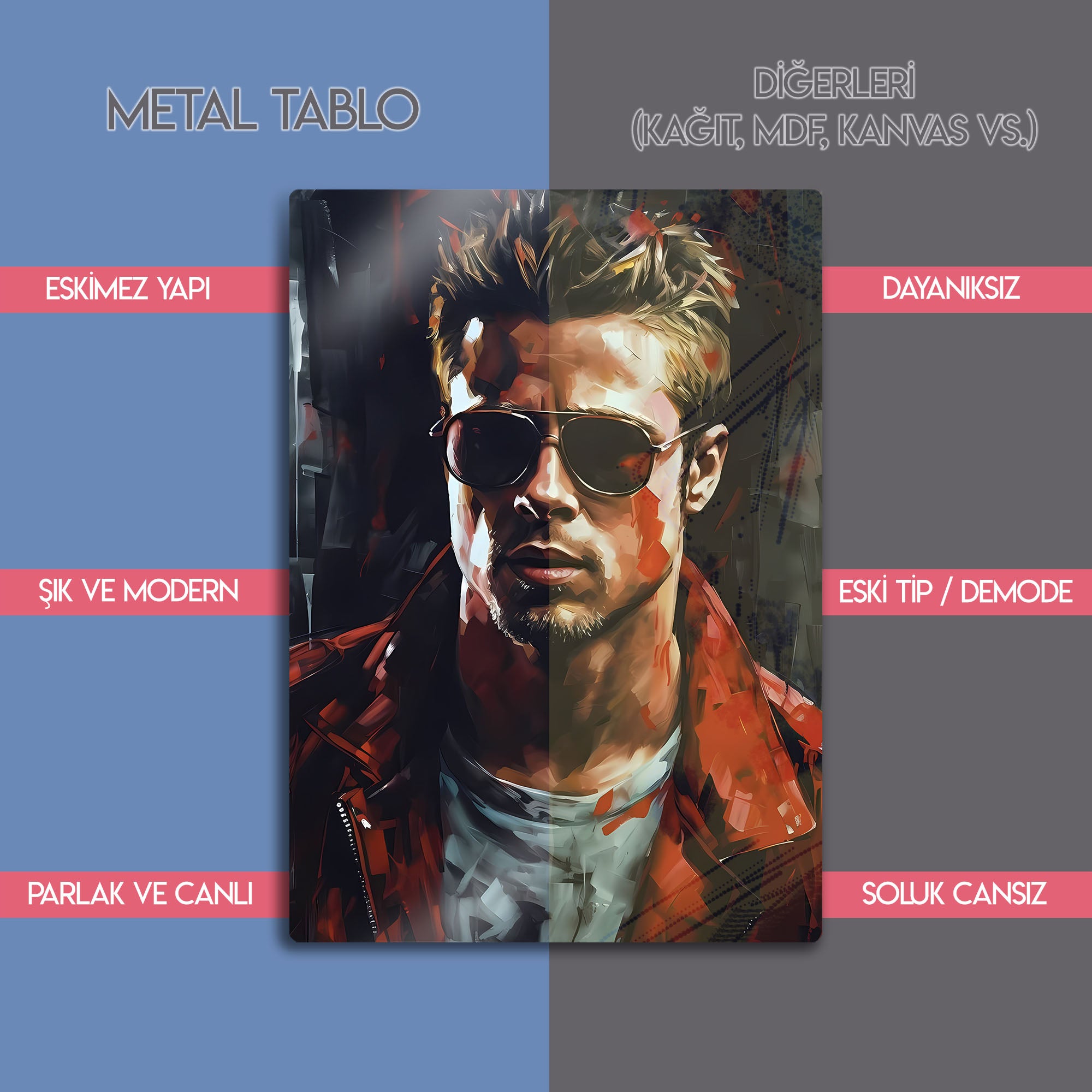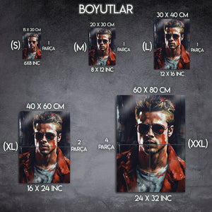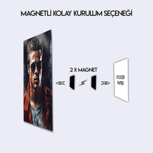 Kült film Fight Club hayranları için özel olarak tasarlanmış bu Tyler Durden metal tablo, unutulmaz karakterin asi ruhunu duvarlarınıza taşıyor. Brad Pitt’in ikonik performansından ilham alınarak yapılan tasarım, modern, dinamik ve renkli stili ile dikkat çekiyor.
