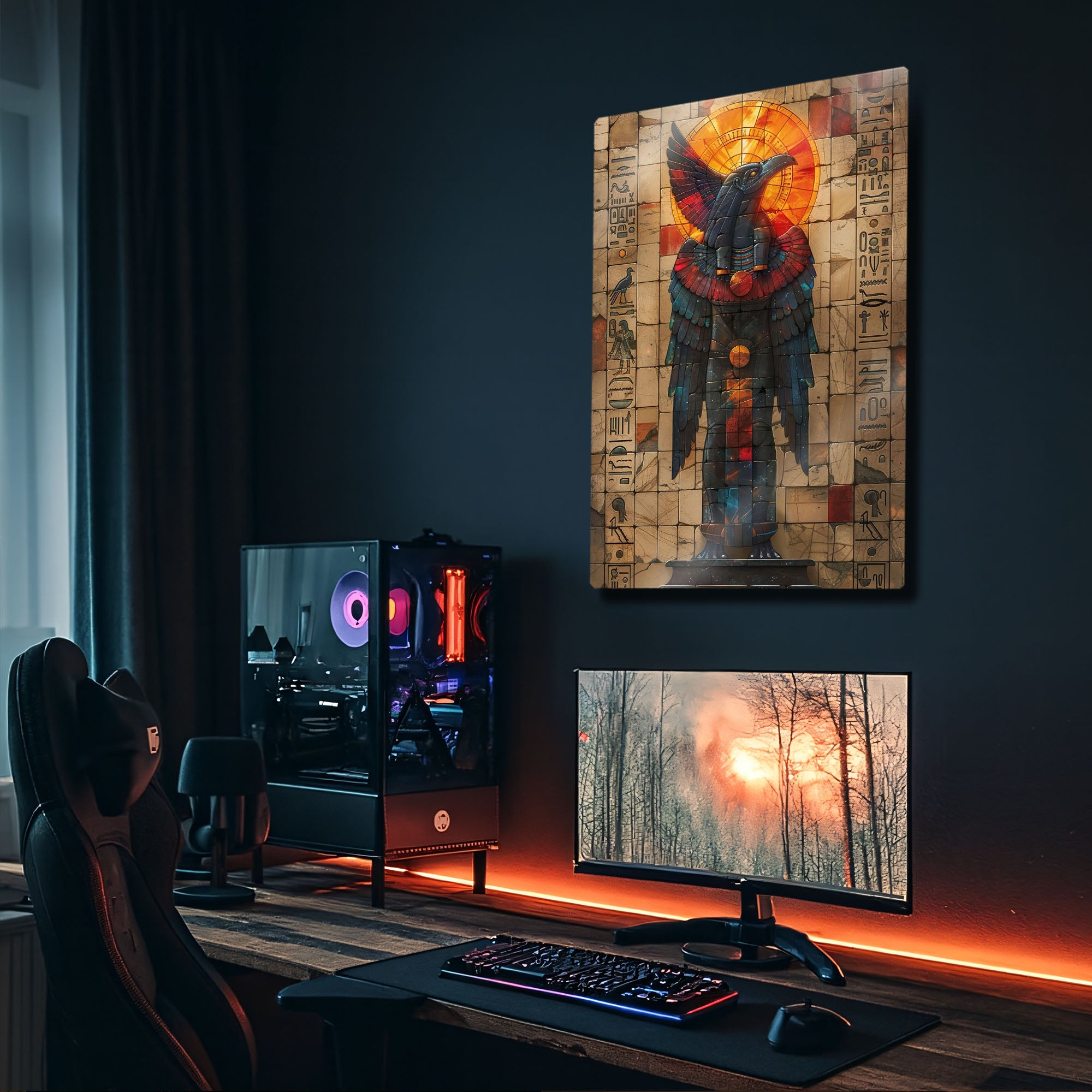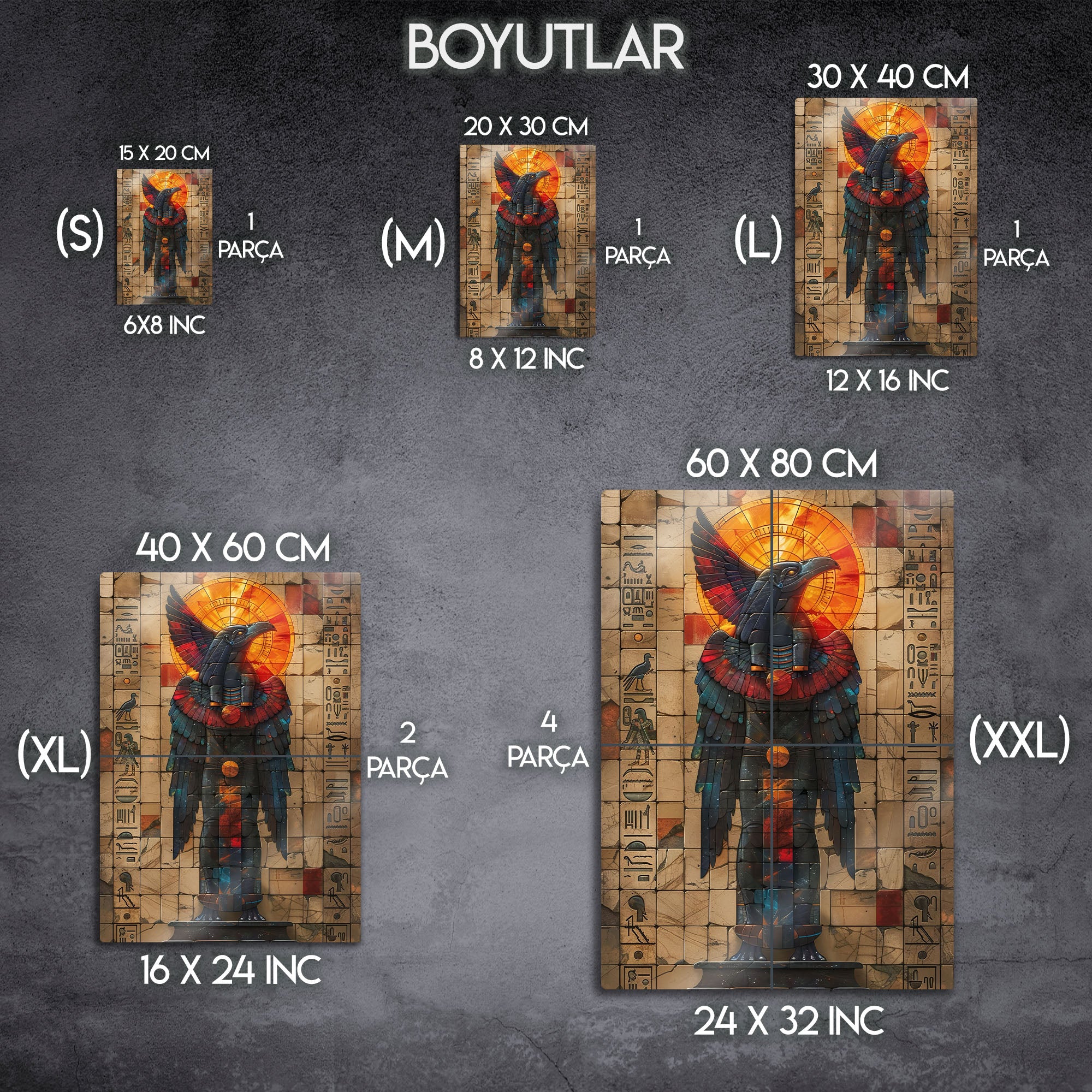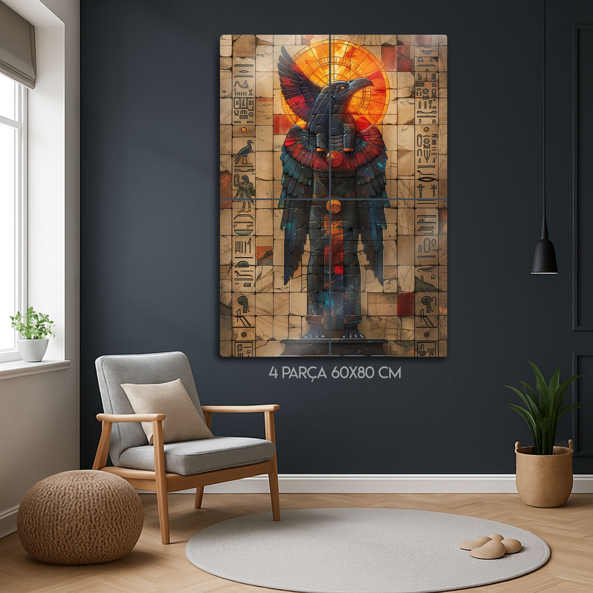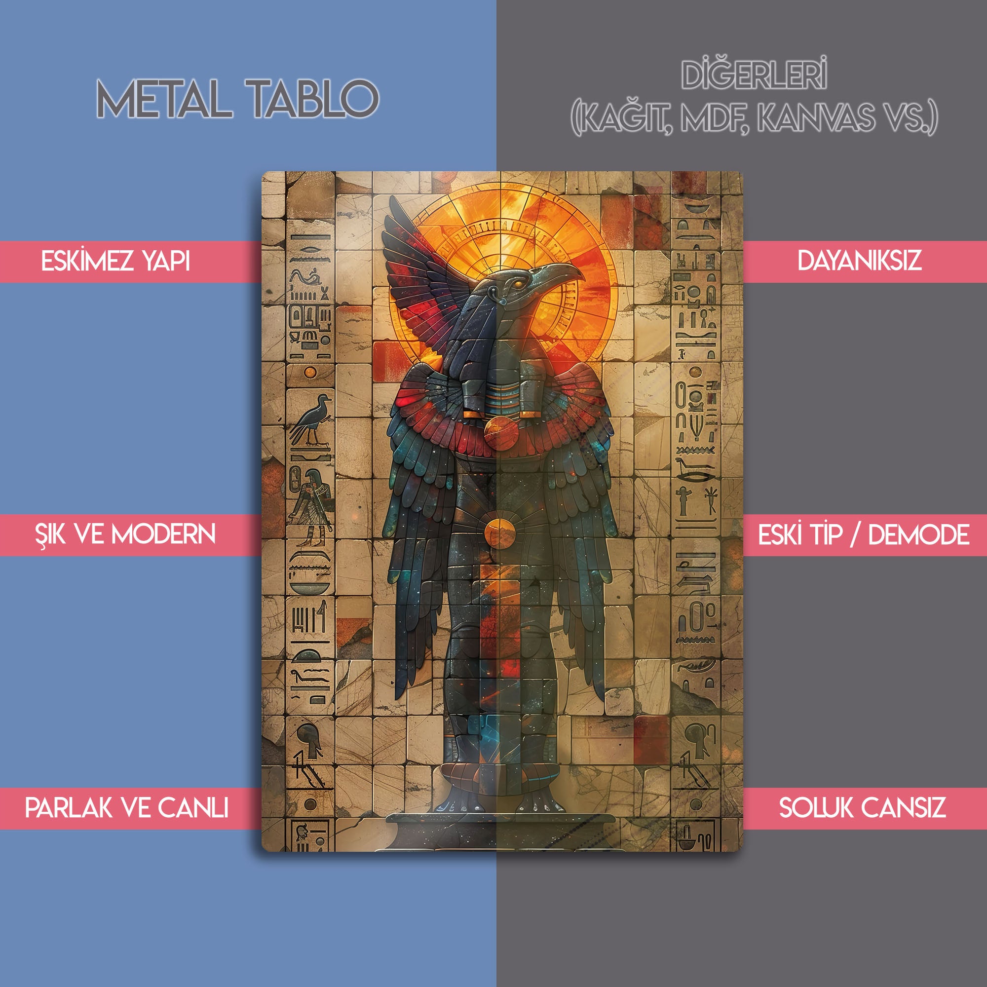 Antik Mısır’ın büyüleyici atmosferini yansıtan bu metal tablo, Horus’un kutsal kuş formuyla hazırlanmış etkileyici bir tasarıma sahiptir. Güneşi ve ilahi gücü simgeleyen parlak detaylar, mistik bir enerji sunar.