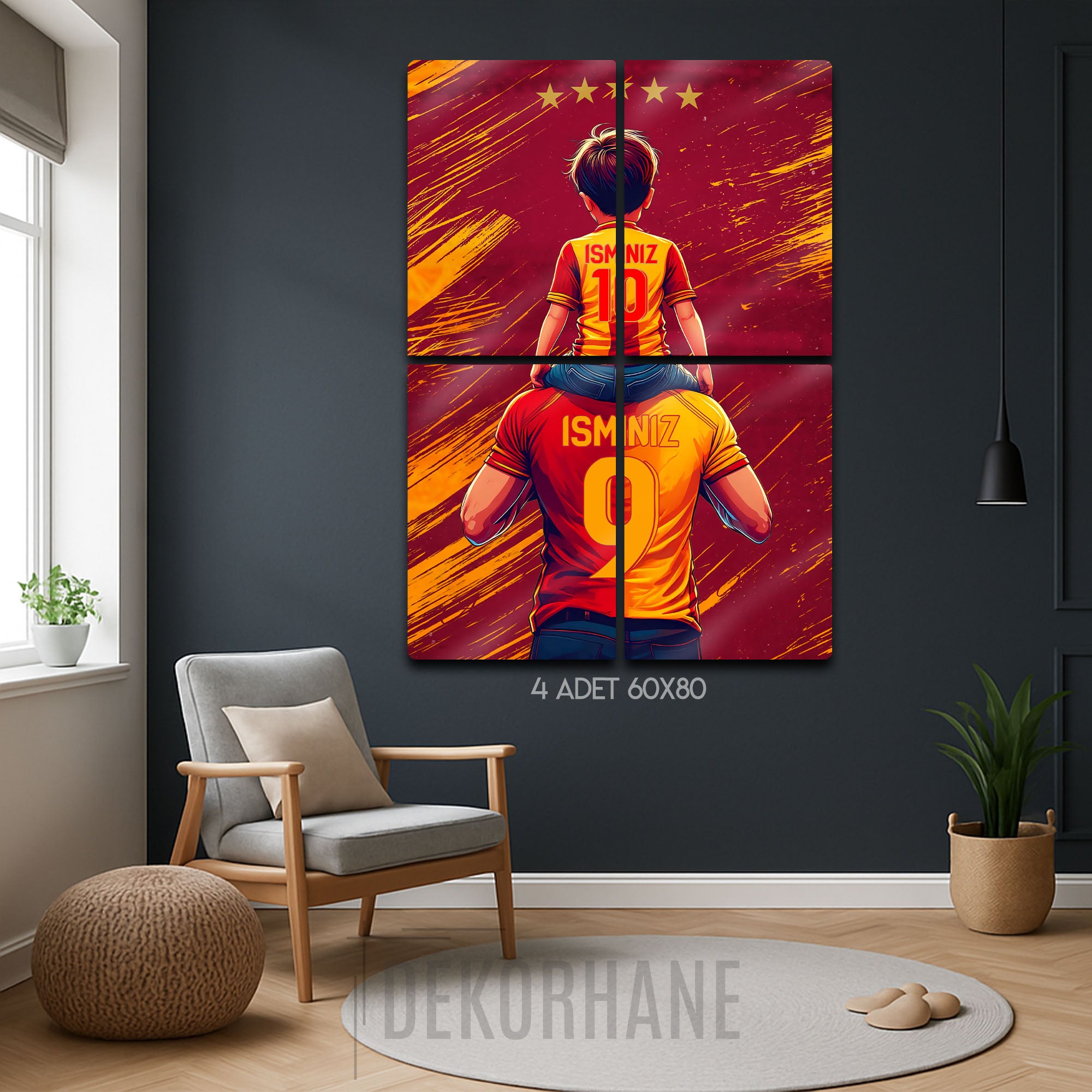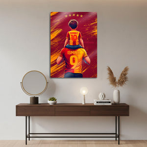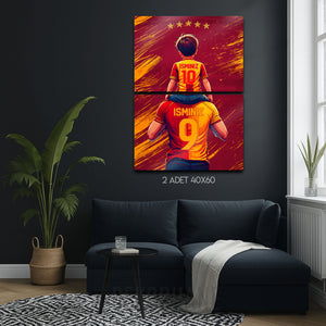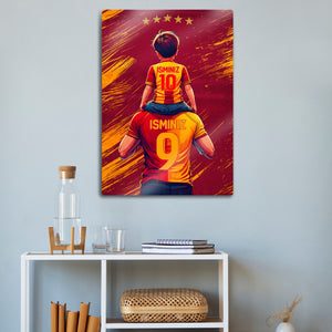 Tablo üzerindeki "İSMİNİZ" alanlarına, hem baba hem de çocuk formasına dilediğiniz isimleri ve numaraları yazdırarak bu eşsiz tasarımı tamamen kendinize özel hale getirebilirsiniz. Bu kişiselleştirme, tabloyu sadece size ait kılmakla kalmaz, aynı zamanda onu unutulmaz bir hediye seçeneğine dönüştürür.