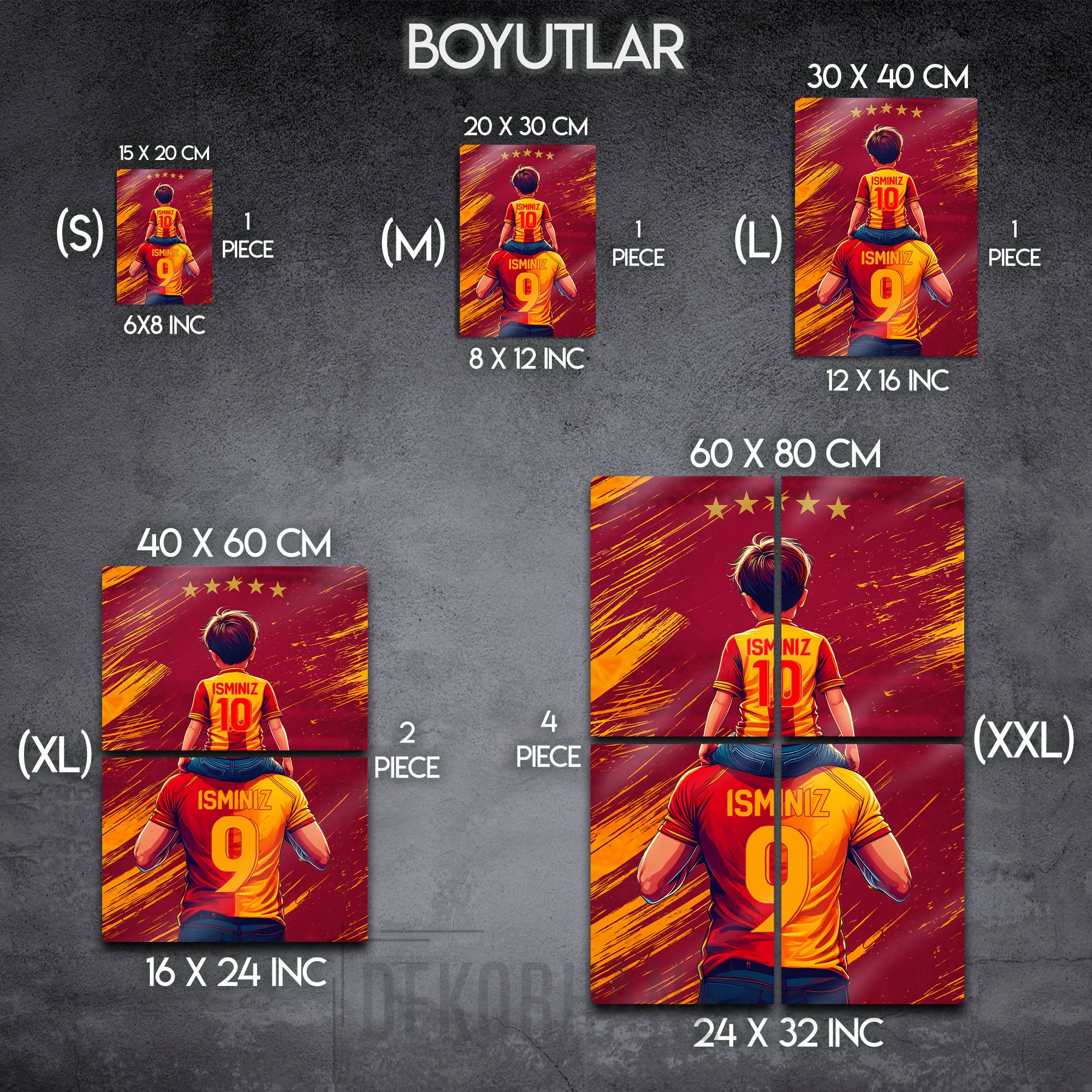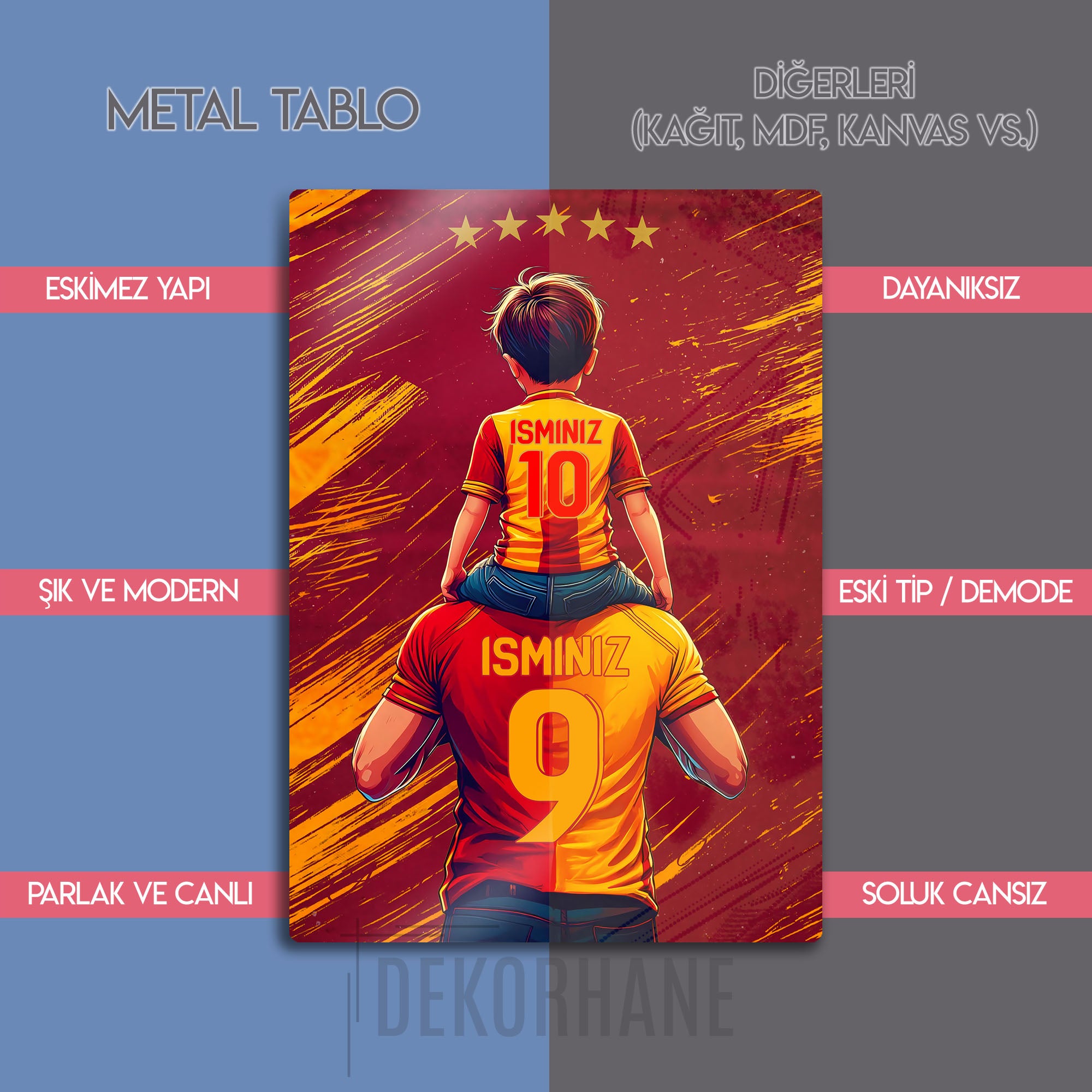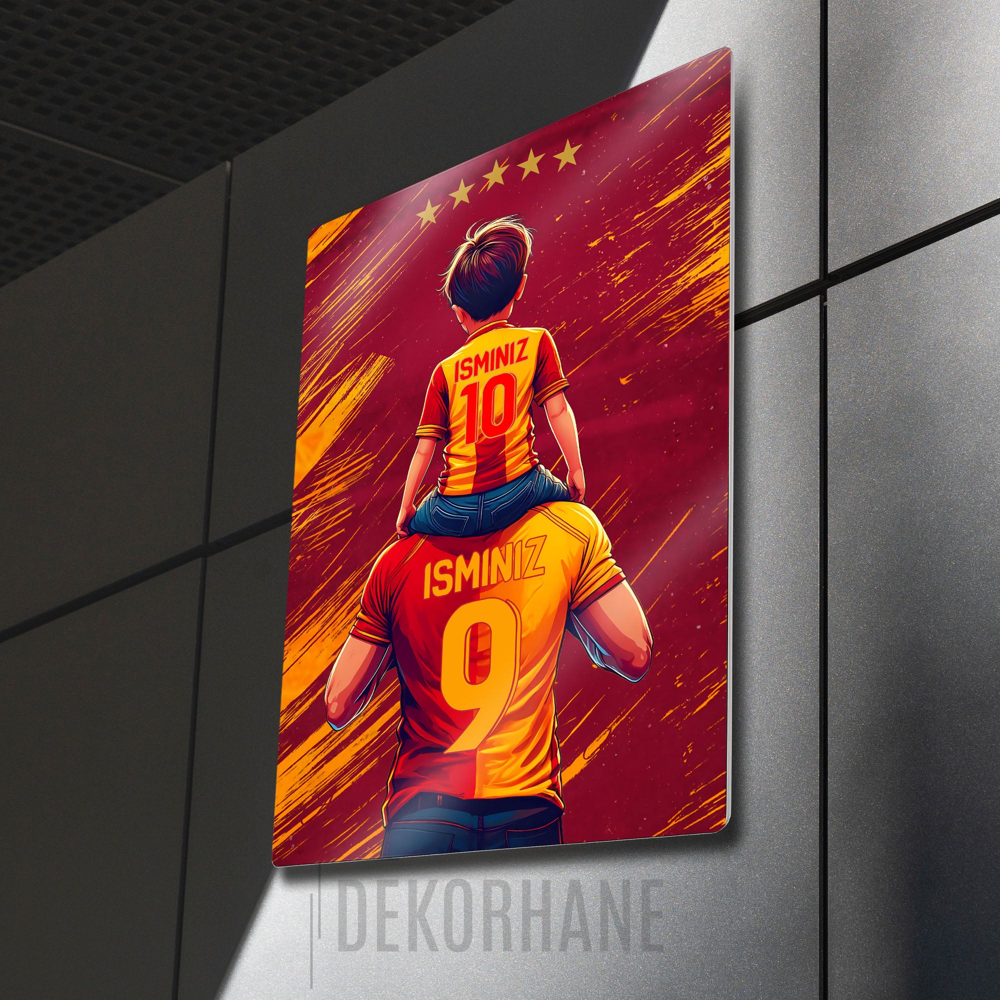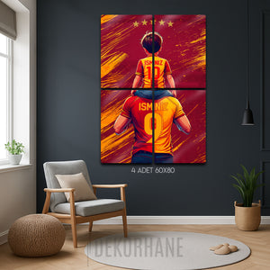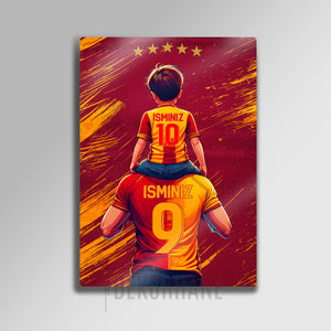 Sarı kırmızı taraftar sevginizi ve babanızla ya da oğlunuzla paylaştığınız o eşsiz bağı, Dekorhane.com'un bu özel tasarım metal tablosuyla evinize taşıyın. Bir babanın omuzlarında geleceğe umutla bakan minik bir taraftarın bu duygu dolu anı, şimdi sizin isimlerinizle can buluyor.