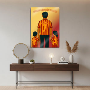 Tablo üzerindeki "ADINIZ" alanlarına, hem babanın hem de çocukların formasına dilediğiniz isimleri ve sizin için anlamlı olan numaraları yazdırarak bu tasarımı tamamen kendinize özel hale getirebilirsiniz. Bu kişiselleştirme, tabloyu sadece size ait kılmakla kalmaz, aynı zamanda onu paha biçilmez bir hediye seçeneğine dönüştürür.