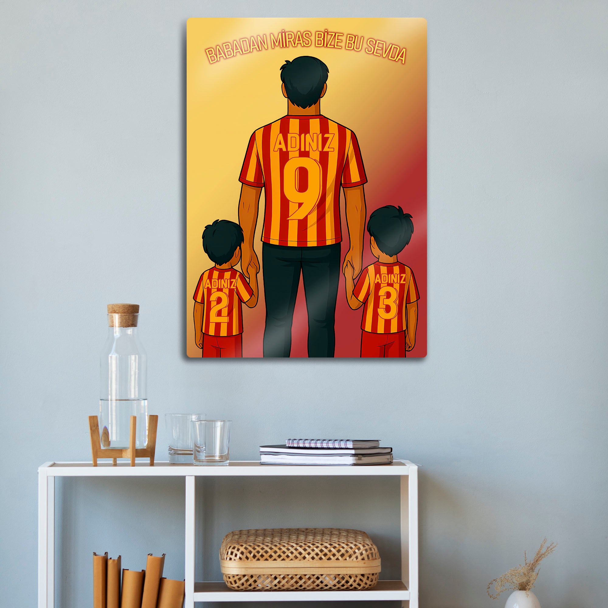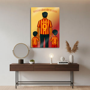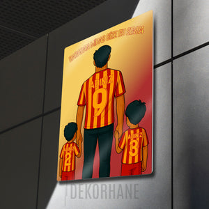 Tablo üzerindeki "ADINIZ" alanlarına, hem babanın hem de iki çocuğun formasına dilediğiniz isimleri ve sizin için anlamlı olan numaraları yazdırarak bu tasarımı tamamen kendinize özel hale getirebilirsiniz. Bu kişiselleştirme, tabloyu sadece size ait kılmakla kalmaz, aynı zamanda onu paha biçilmez bir hediye seçeneğine dönüştürür.