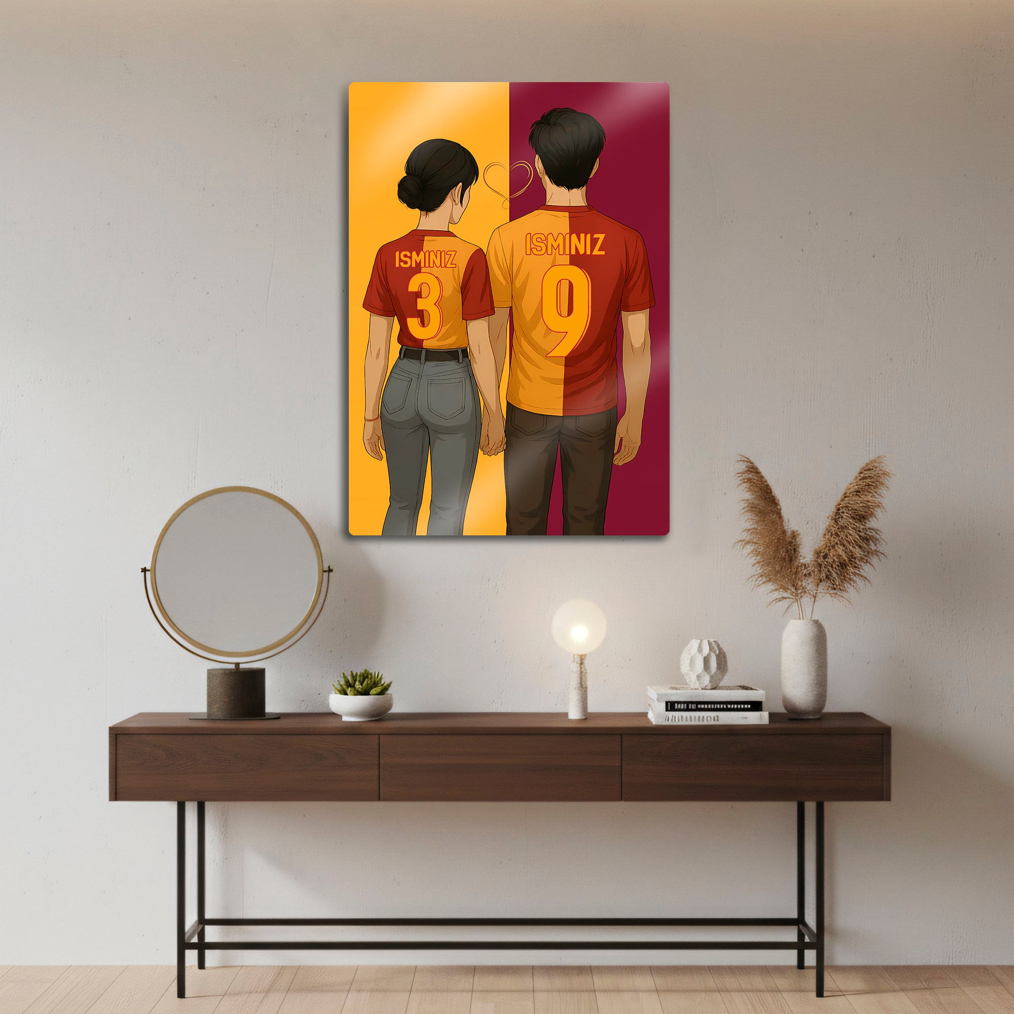 Tablo üzerindeki "İSMİNİZ" alanlarına kendi isimlerinizi, forma numaralarına ise sizin için anlamlı olan rakamları (tanışma tarihiniz, özel bir gün vb.) yazdırarak bu tasarımı tamamen size ait, eşsiz bir anıya dönüştürebilirsiniz.
