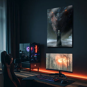 Game of Thrones evreninin en unutulmaz sahnelerinden biri olan Daenerys Targaryen ve ejderhası Drogon şimdi yüksek kaliteli metal tablo ile duvarlarınızı süslüyor. Ejderhanın görkemli bakışı ve Daenerys’in güçlü silüeti, Westeros’un büyülü atmosferini evinize taşıyor.