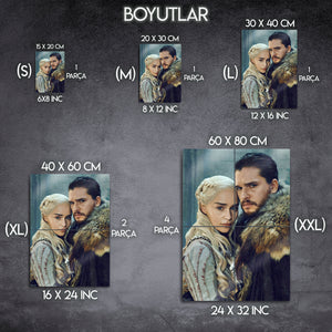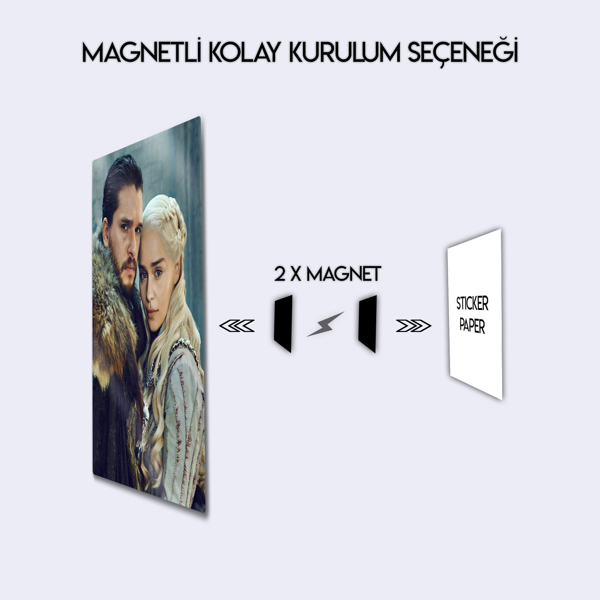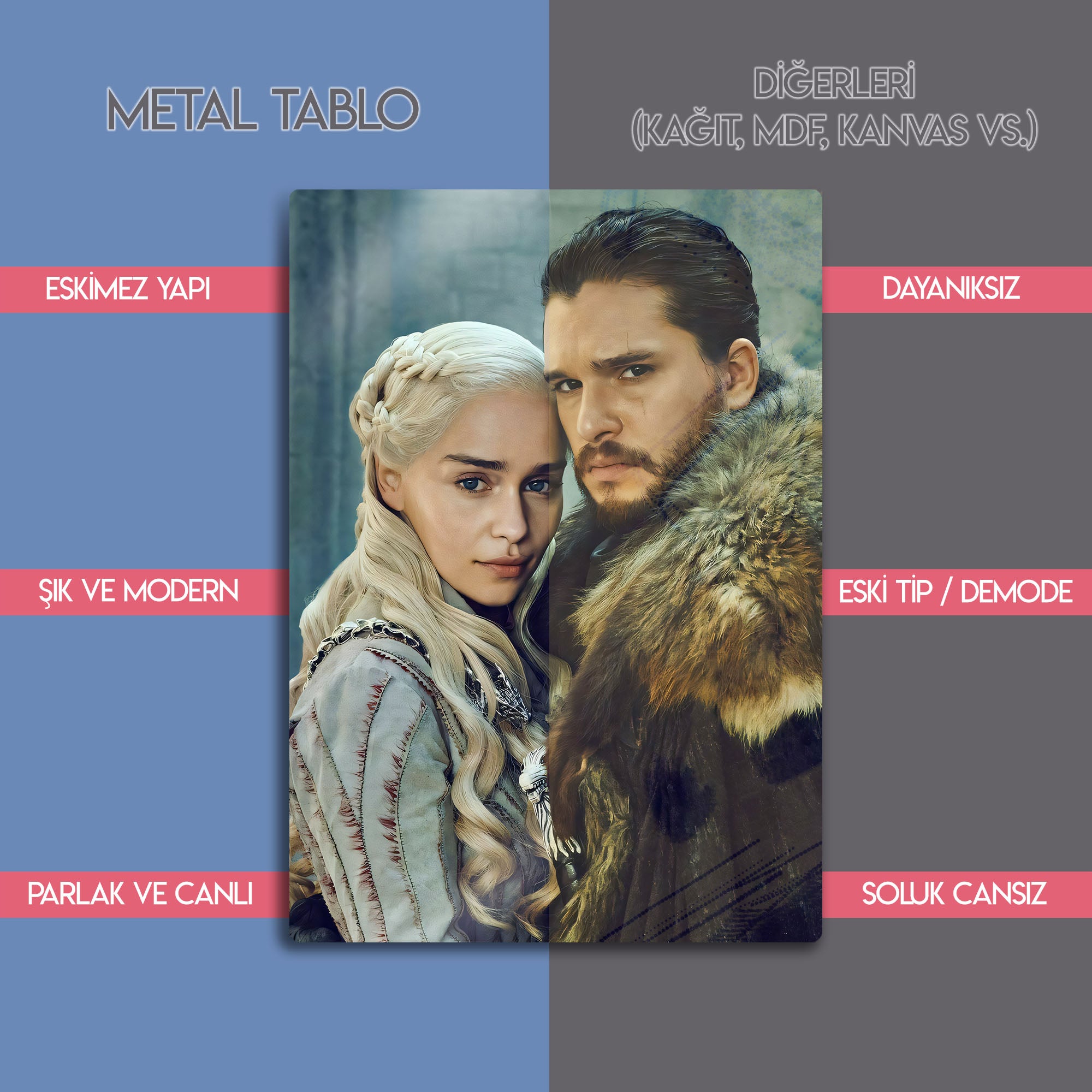 Efsanevi dizi Game of Thrones hayranları için özel tasarlanmış bu metal tablo, Jon Snow ve Daenerys Targaryen’in unutulmaz görselliğini evinize taşıyor. İkonik bakışları ve dramatik kontrastıyla bu tasarım, dizi koleksiyoncuları ve fantastik evren hayranları için eşsiz bir dekor parçasıdır.