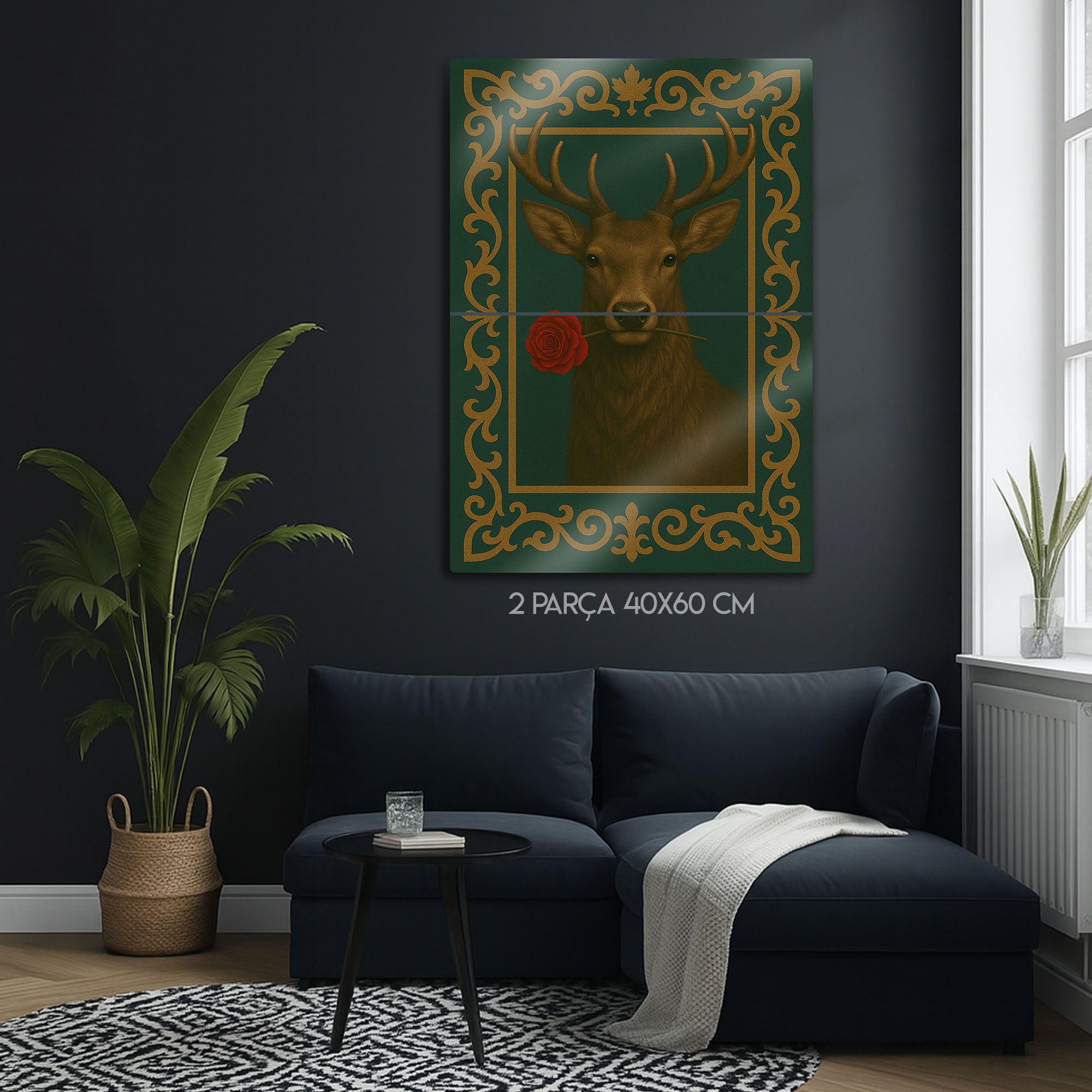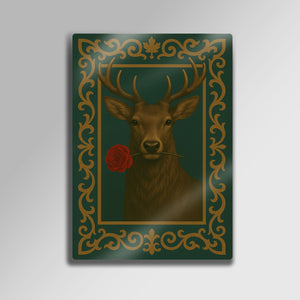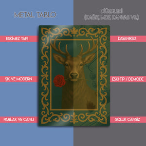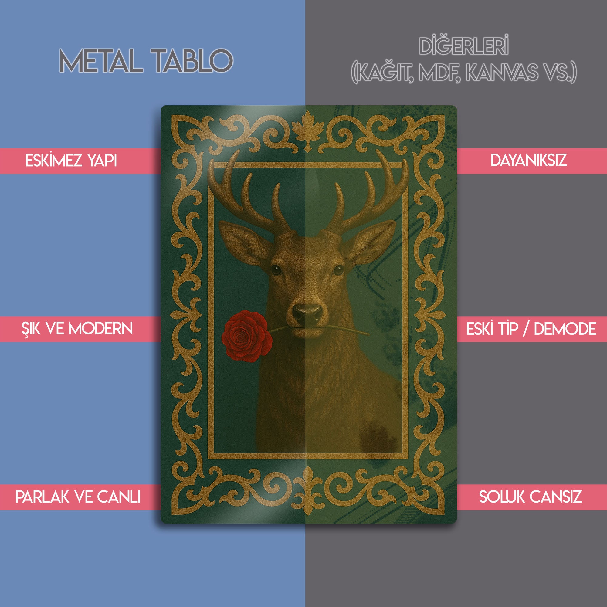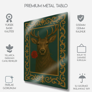 Bu özel tasarım geyik ve gül metal tablo, doğanın zarafetini ve romantizmini evinize taşıyor. Ağzında kırmızı gül tutan asil geyik figürü, güç ve romantizmin birleşimini simgelerken, altın süslemeli çerçeve tasarımı tabloya klasik ve şık bir dokunuş katıyor.