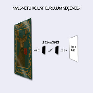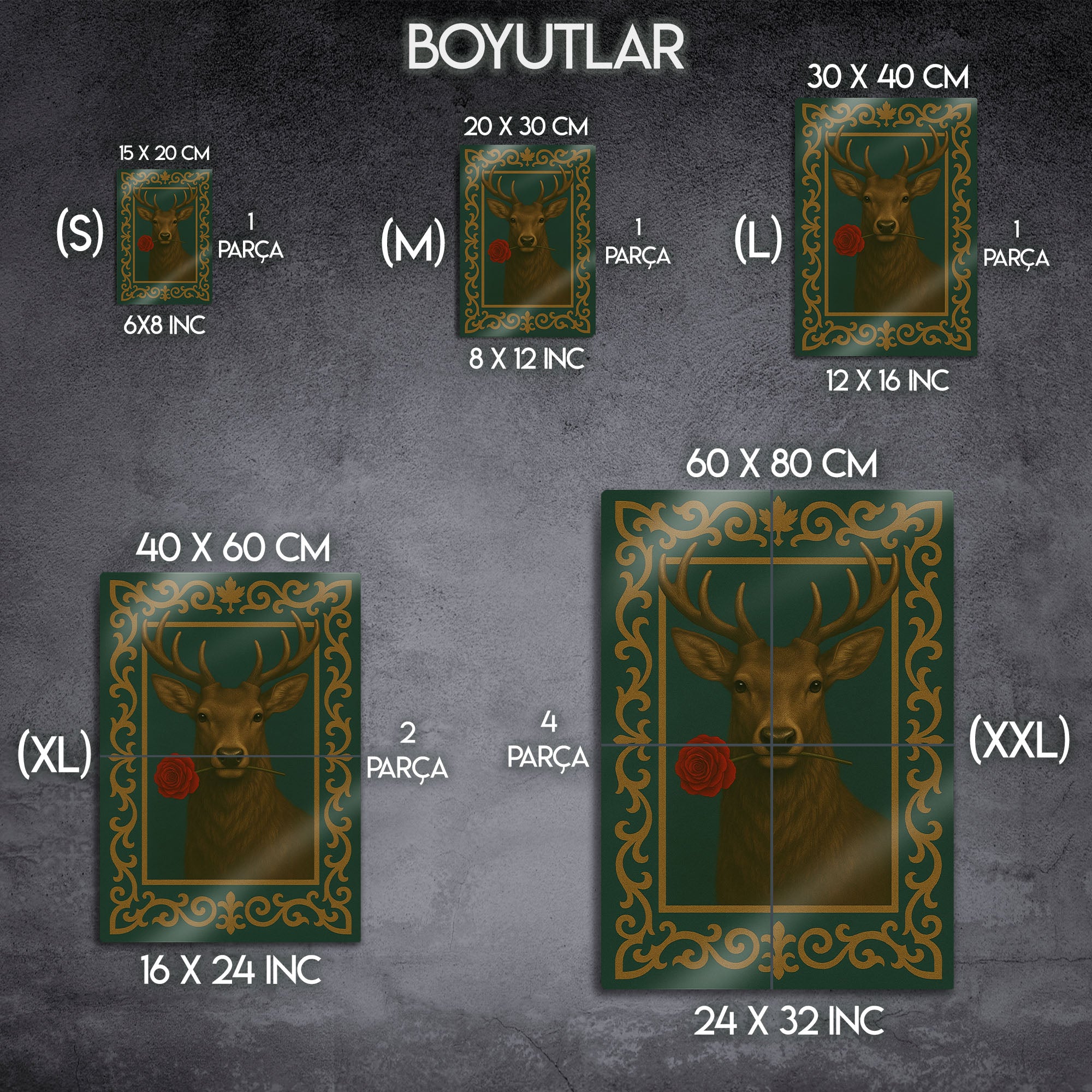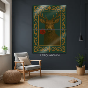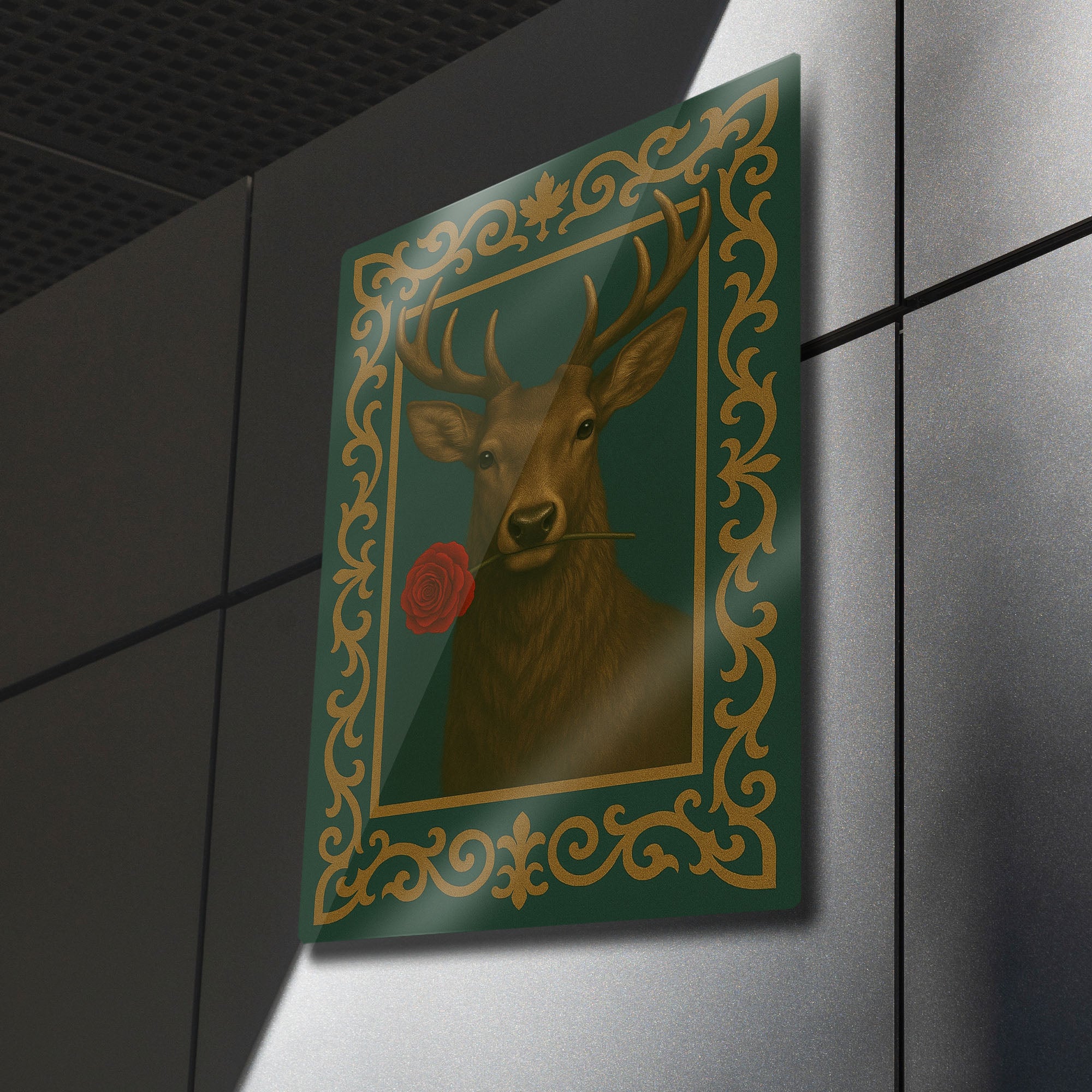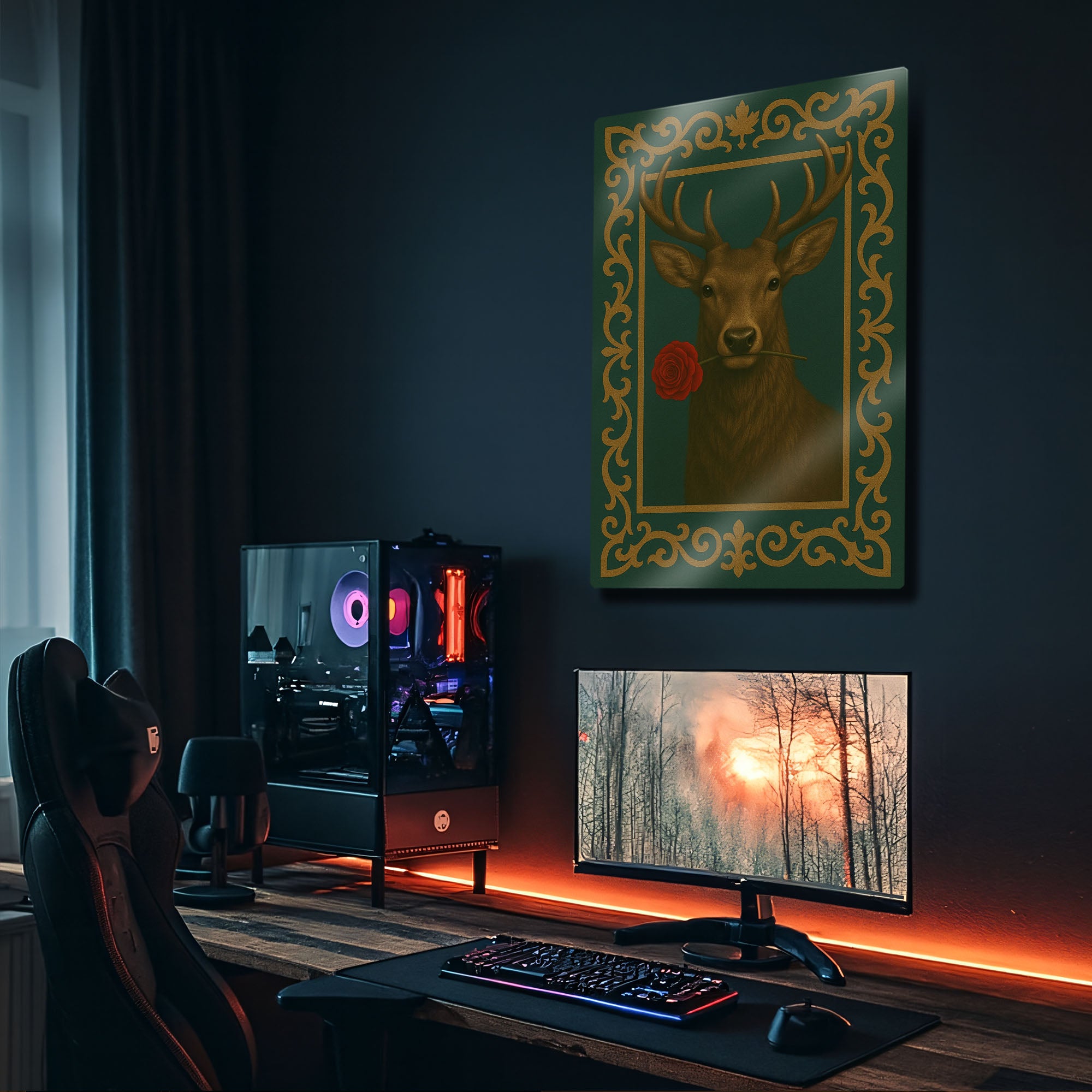 Bu özel tasarım geyik ve gül metal tablo, doğanın zarafetini ve romantizmini evinize taşıyor. Ağzında kırmızı gül tutan asil geyik figürü, güç ve romantizmin birleşimini simgelerken, altın süslemeli çerçeve tasarımı tabloya klasik ve şık bir dokunuş katıyor.