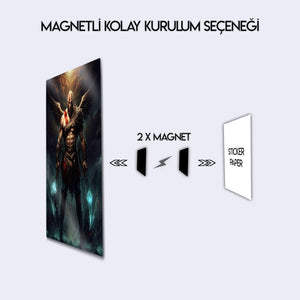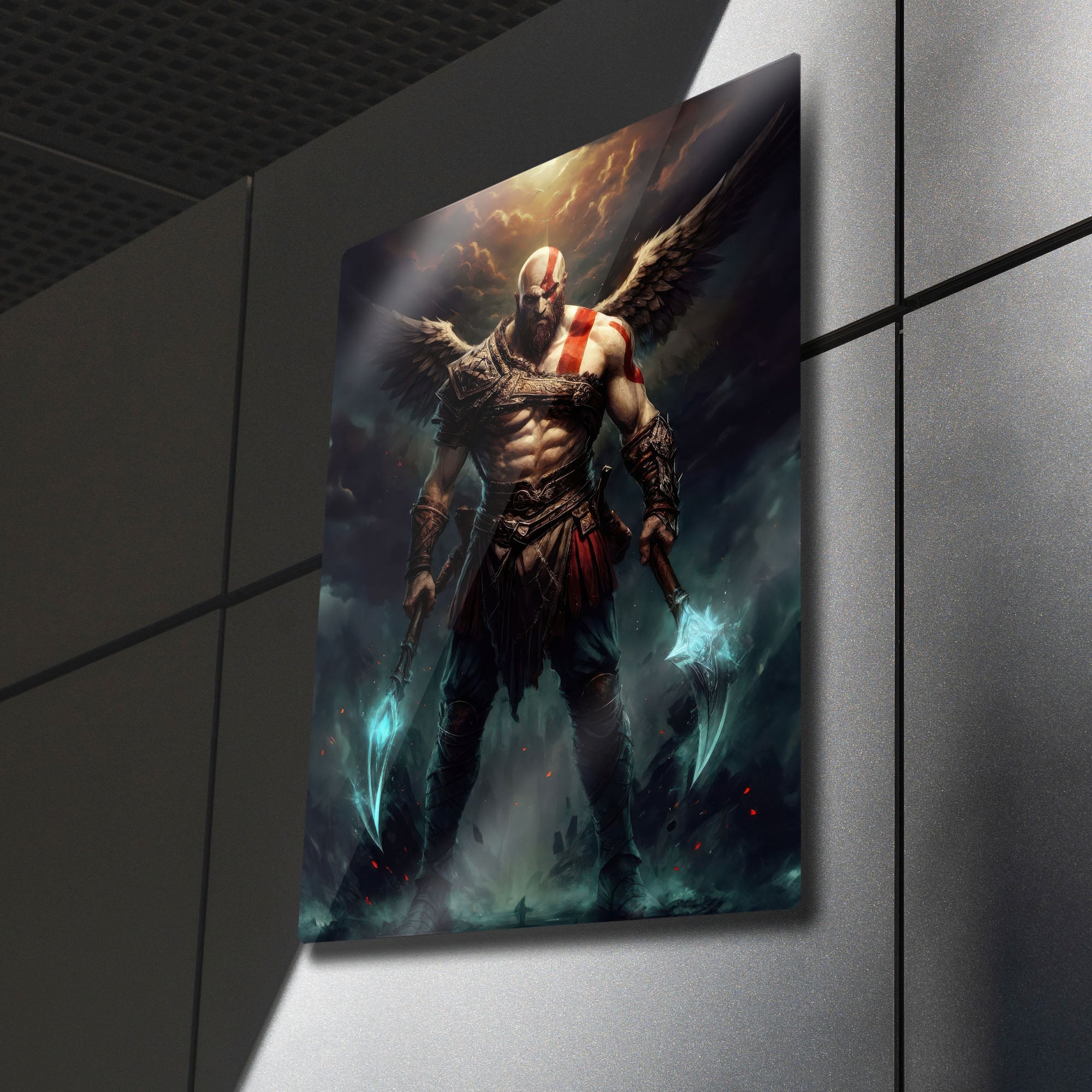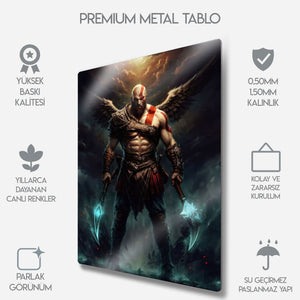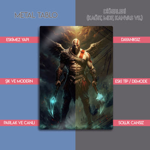 Efsanevi God of War oyun serisinin unutulmaz karakteri Kratos, güçlü tasarımıyla bu özel metal tabloda hayat buluyor. Detaylı işlenmiş yüksek çözünürlüklü baskısı ile oyun tutkunlarının koleksiyonlarına değer katan bu tablo, odanıza epik bir atmosfer kazandırır.