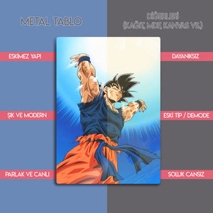 Yüksek kaliteli metal baskı sayesinde uzun ömürlü kullanım sunan bu tablo, Dragon Ball hayranları, anime koleksiyoncuları ve otaku dekorasyonu sevenler için mükemmel bir seçimdir.