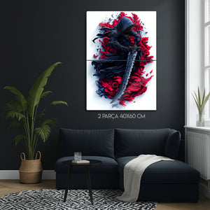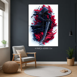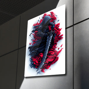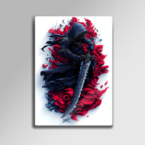 Gecenin ve gölgelerin efendisi, gizemli bir savaşçının o durdurulamaz gücünü ve karizmasını duvarlarınıza taşıyın! Bu olağanüstü metal tablo, yüzü kapüşonunun karanlığında gizlenmiş, elinde efsanevi bir kılıç tutan bir savaşçıyı, kırmızı ve siyahın soyut ve akışkan bir dansı içinde tasvir ediyor.