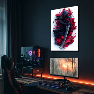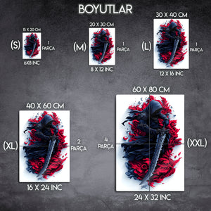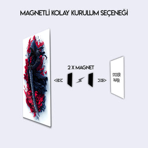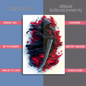 Bu eser, sadece bir fantezi karakteri portresi değil, aynı zamanda gücün, gizemin ve bilinmeyenin estetiğini kutlayan bir sanat eseridir. Kırmızının tutkusu ve siyahın asaleti, bu esere hem dinamik hem de son derece sofistike bir atmosfer katıyor. Metalin modern dokusu, bu sanatsal tasarımın her bir fırça darbesini ve üç boyutlu hissini mükemmel bir şekilde öne çıkarır.