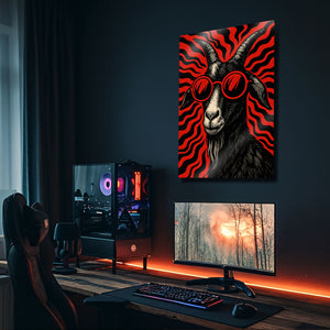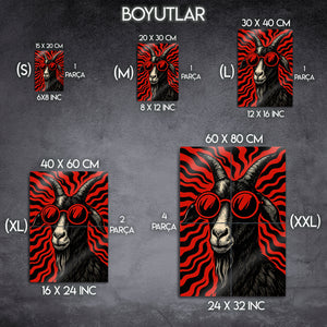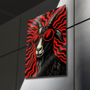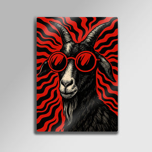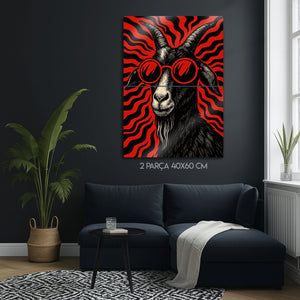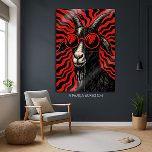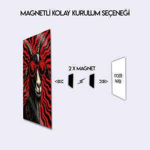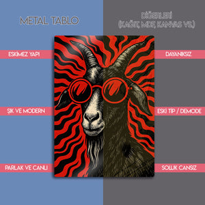 Sıradanlığa meydan okuyan bir stil ifadesi! Bu enerjik metal tablo, kırmızı gözlükleriyle umursamaz bir tavır sergileyen havalı bir keçiyi, hipnotize edici kırmızı ve siyah dalgaların önünde tasvir ediyor. Pop art ve rock poster estetiğini bir araya getiren bu eser, duvarlarınıza anında asi ve dinamik bir karakter katacak.