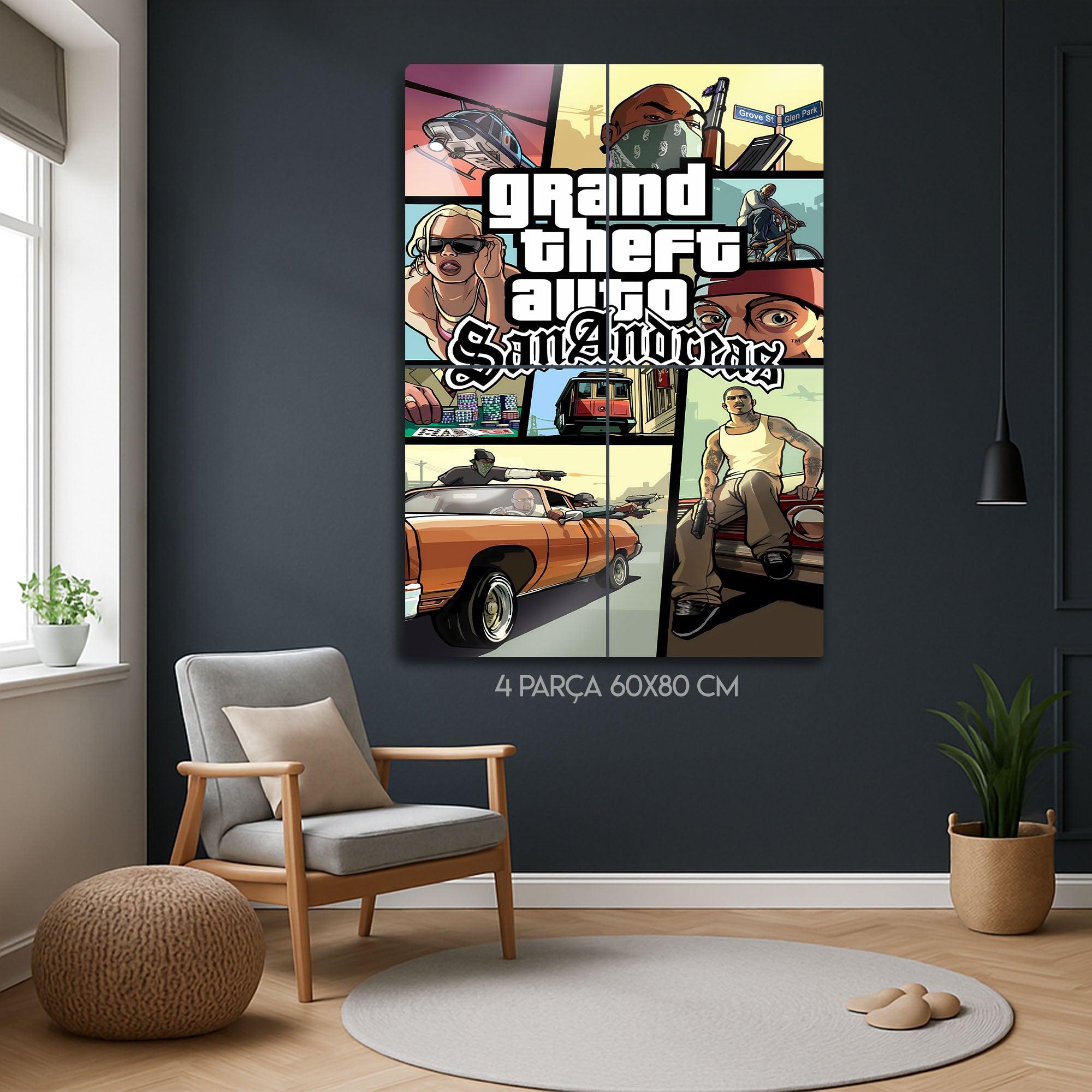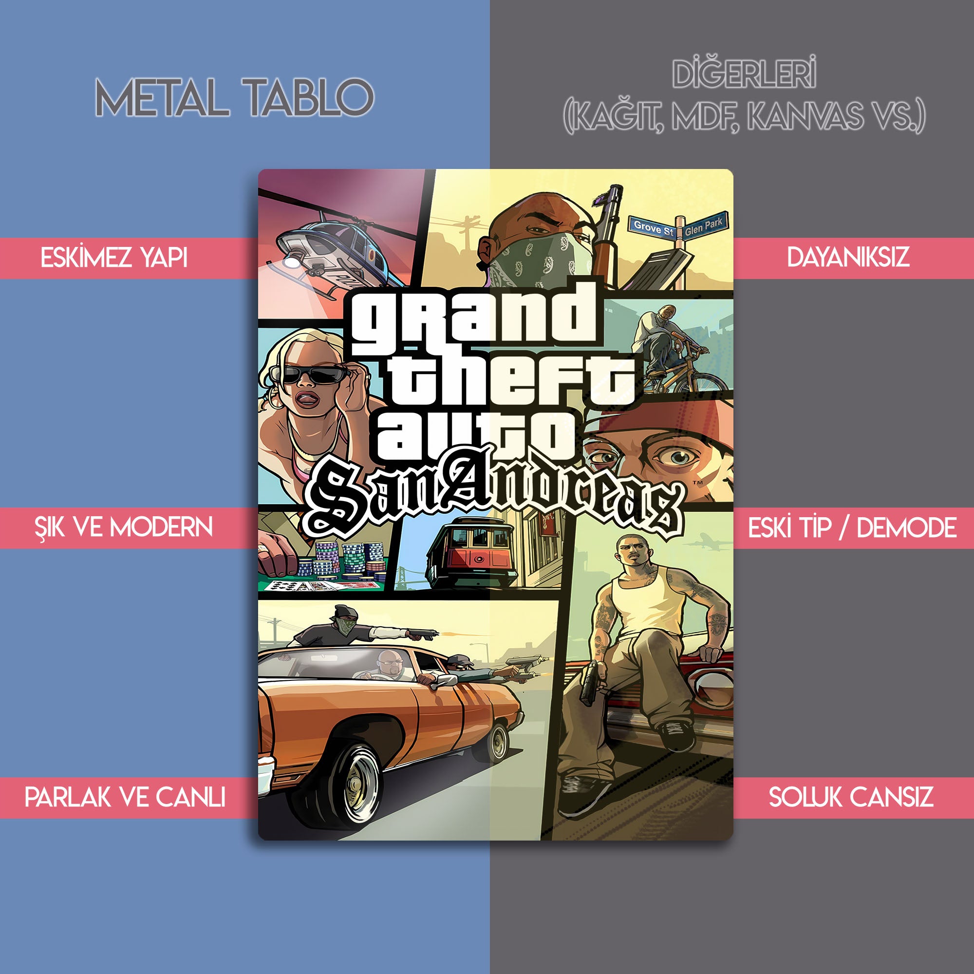 Efsanevi oyun serisinin unutulmaz klasiği Grand Theft Auto: San Andreas temalı bu özel metal tablo, oyun severler için eşsiz bir dekor seçeneğidir. Grove Street atmosferini yansıtan ikonik tasarımıyla hem oyun odalarına hem de modern ev dekoruna şıklık katar. Yüksek kaliteli baskısı ve dayanıklı metal yüzeyiyle uzun yıllar canlılığını korur.