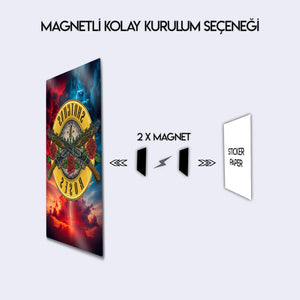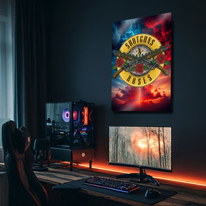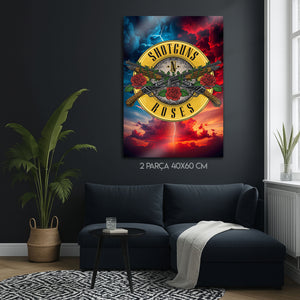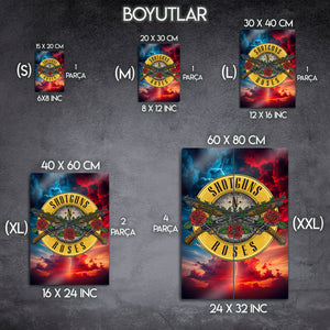 Bu eser, sadece bir müzik posteri değil, aynı zamanda grubun müziğindeki o "tehlikeli" ve "romantik" ikilemin, yani silahların ve güllerin bir manifestosudur. Ateş ve buz gibi çarpışan kırmızı ve mavi bulutlar, bu tasarıma epik ve unutulmaz bir atmosfer katıyor. Bu tablo, her Guns N' Roses hayranının ve rock müzik tutkununun koleksiyonunda olması gereken, güçlü bir "statement" parçasıdır.