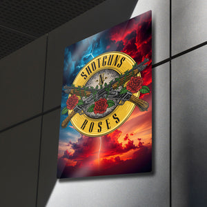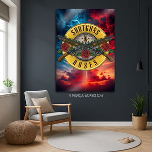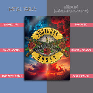 Rock'n'roll'un en asi, en tehlikeli ve en ikonik gruplarından Guns N' Roses'ın o sarsılmaz ruhunu duvarlarınıza taşıyın! Bu olağanüstü metal tablo, grubun efsanevi ismini, "Shotguns N' Roses" (Pompalı Tüfekler ve Güller) konseptiyle, grubun klasik logosunu andıran bir tasarım ve fırtınalı bir gökyüzü arka planıyla yeniden yorumluyor.
