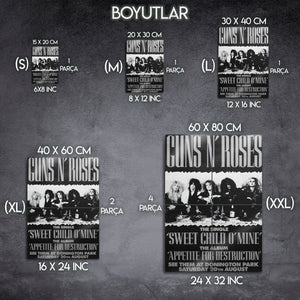 Efsanevi rock grubu Guns N’ Roses ve unutulmaz şarkısı Sweet Child O’ Mine temalı bu özel metal tablo, müzik ve rock kültürünü evinize taşıyor. Siyah beyaz tasarımıyla retro bir hava katan tablo, hem koleksiyonluk hem de dekoratif olarak öne çıkıyor. Dayanıklı metal yüzeyi sayesinde uzun ömürlüdür ve salon, genç odası, müzik stüdyosu veya bar dekorasyonu için mükemmel bir seçimdir. Rock müzik tutkunları için özel bir hediye alternatifi de sunar.