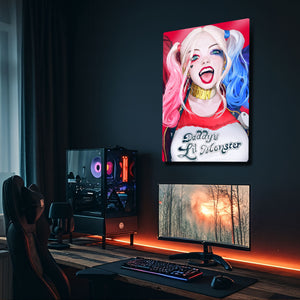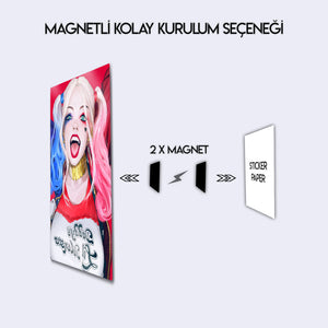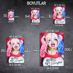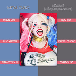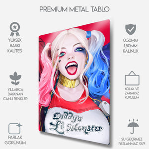 DC evreninin en sevilen anti-kahramanlarından Harley Quinn, enerjik ve çılgın kişiliğiyle bu özel metal tabloda hayat buluyor. Canlı pembe ve mavi saç tonları, ikonik "Daddy's Lil Monster" tişörtü ve dikkat çekici detaylarıyla Harley Quinn hayranları için mükemmel bir koleksiyon parçasıdır. Dayanıklı metal yüzeyi sayesinde uzun ömürlü kullanım sunar ve salon, ofis, genç odası veya kafe dekorasyonunda modern bir atmosfer yaratır. DC Comics ve Suicide Squad hayranları için eşsiz bir hediye alternatifi olarak da öne çıkar.