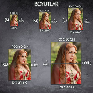 Televizyon tarihinin unutulmaz dizisi "Muhteşem Yüzyıl"ın efsanevi karakteri Hürrem Sultan, şimdi bu özel tasarım metal tablo ile evlerinize konuk oluyor. Meryem Uzerli'nin hayat verdiği Hürrem Sultan'ın ikonik duruşunu ve göz alıcı güzelliğini yansıtan bu portre, mekanınıza tarihi bir derinlik ve asil bir atmosfer katacak.