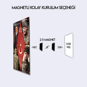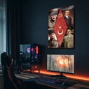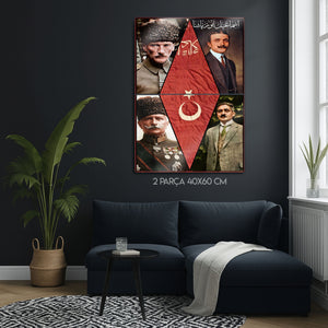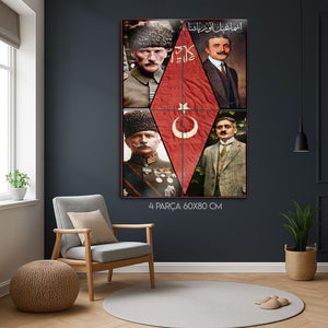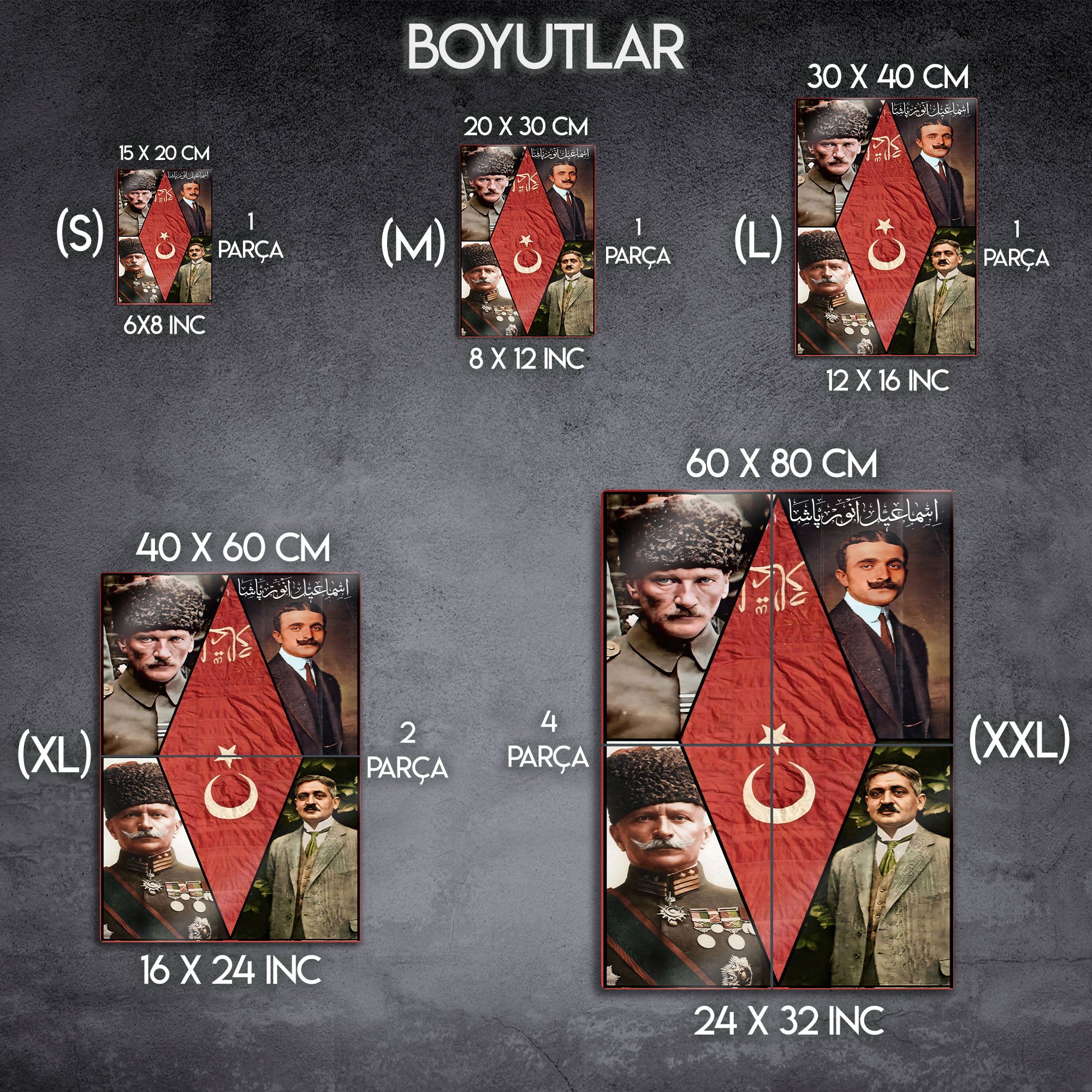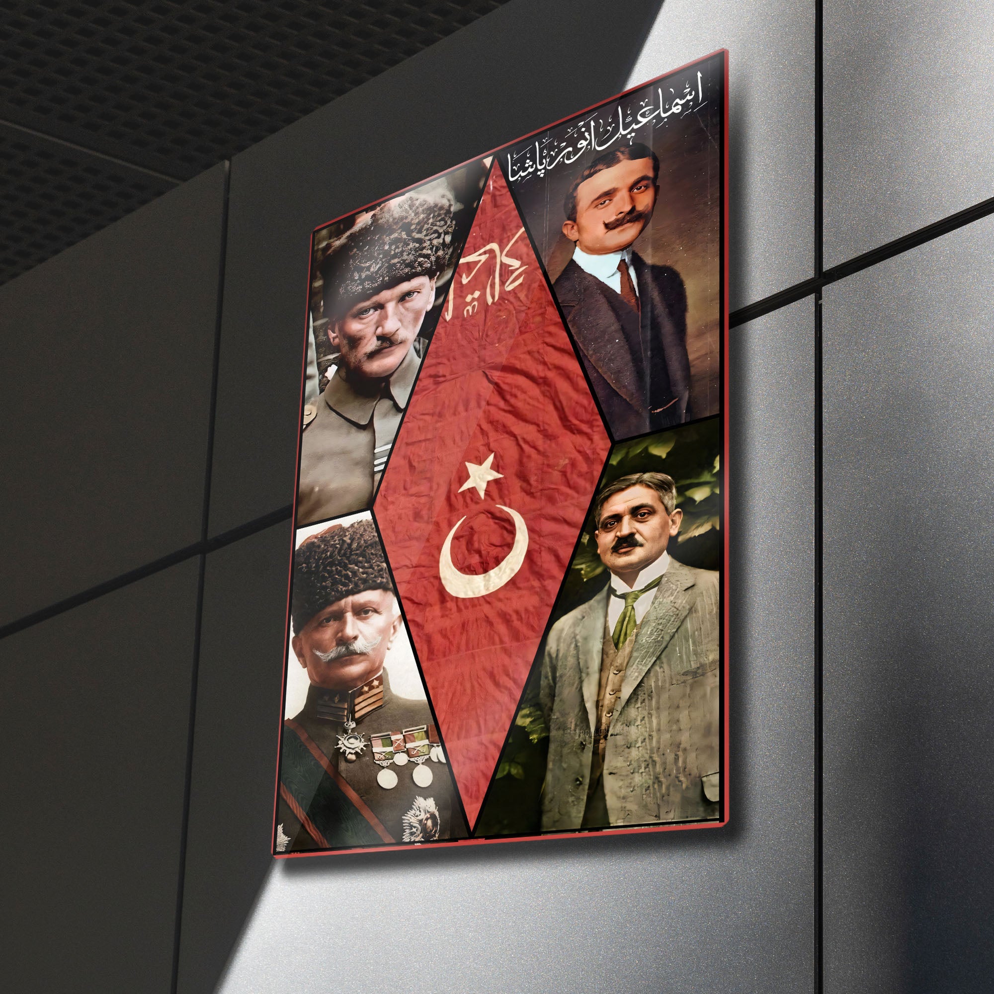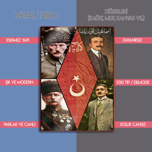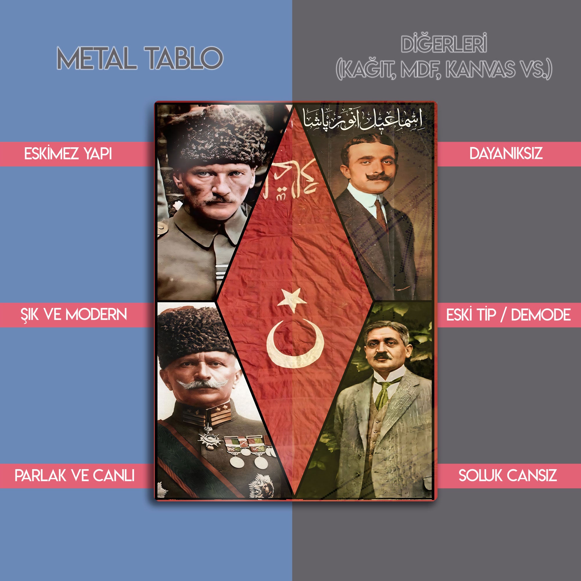 Türk tarihinin en kritik dönemlerinden birine liderlik eden, İmparatorluk'tan Cumhuriyet'e uzanan zorlu yolda iz bırakan tarihi şahsiyetler, bu özel tasarım kolaj metal tabloda bir araya geliyor. Mustafa Kemal Atatürk, İsmail Enver Paşa, Mehmed Talat Paşa ve dönemin diğer önemli komutanlarının özenle renklendirilmiş portreleri, merkezde yer alan tarihi Ay Yıldızlı sancak etrafında anlamlı bir bütünlük oluşturuyor.