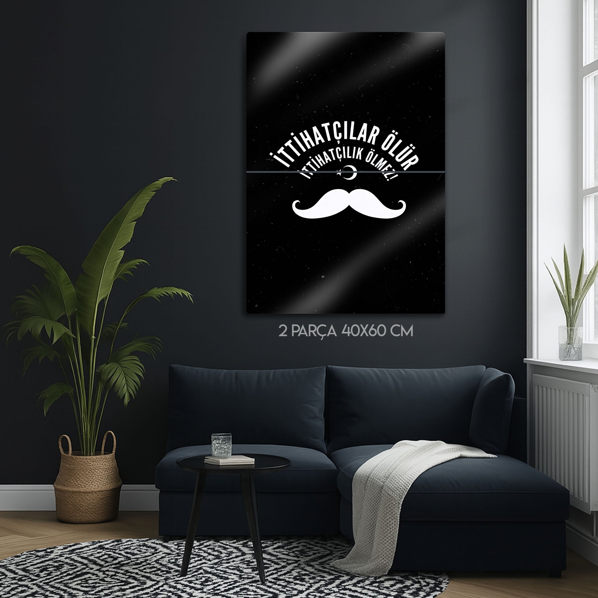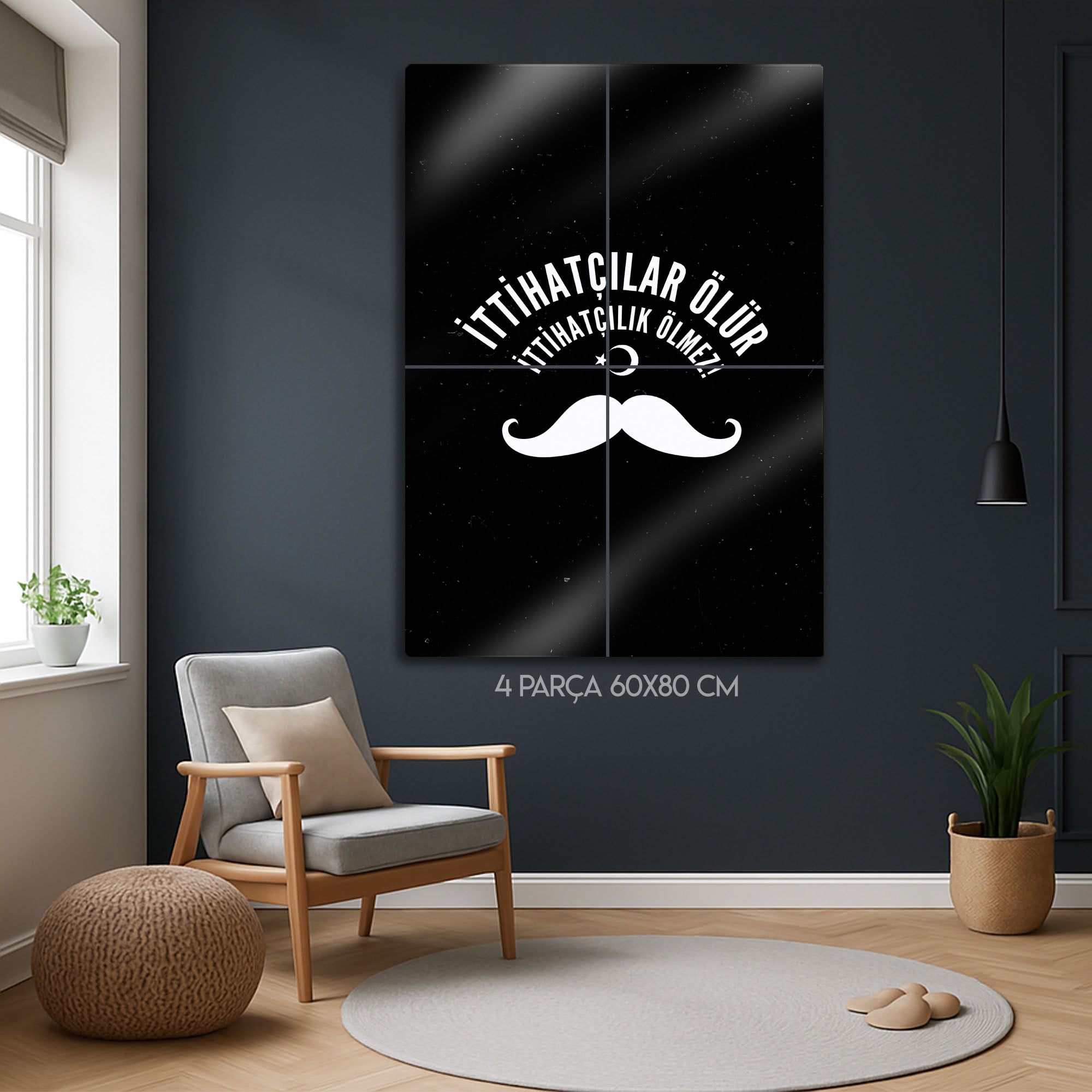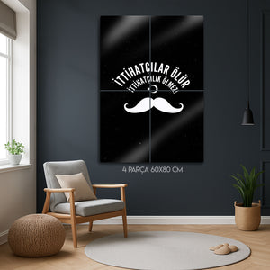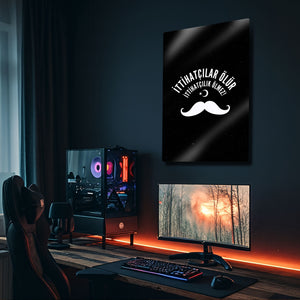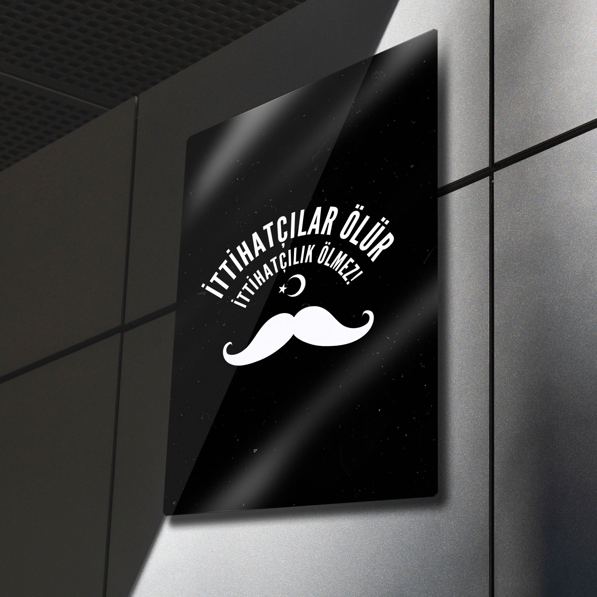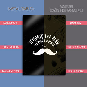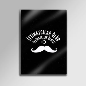 Türk tarihinin en çalkantılı ve belirleyici dönemlerinden birine damgasını vuran İttihat ve Terakki ruhunu, bu özel tasarım metal tablo ile yaşam alanınıza taşıyın. "İttihatçılar Ölür, İttihatçılık Ölmez!" sloganını merkezine alan bu güçlü tasarım, dönemin simgesi haline gelmiş ikonik bıyık figürü ve Ay Yıldız ile tamamlanmıştır.