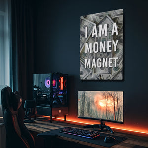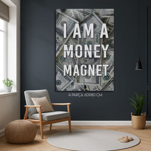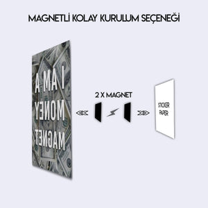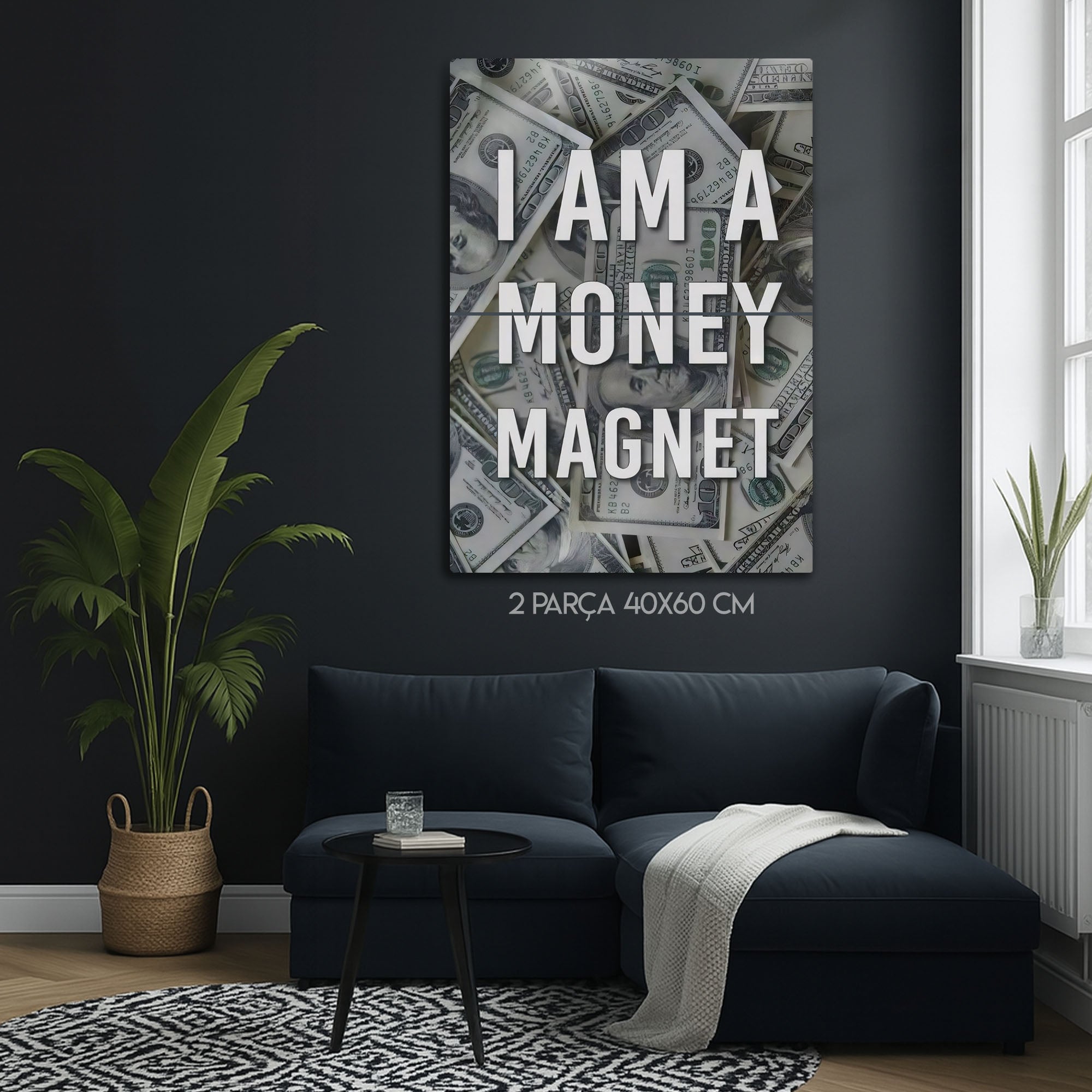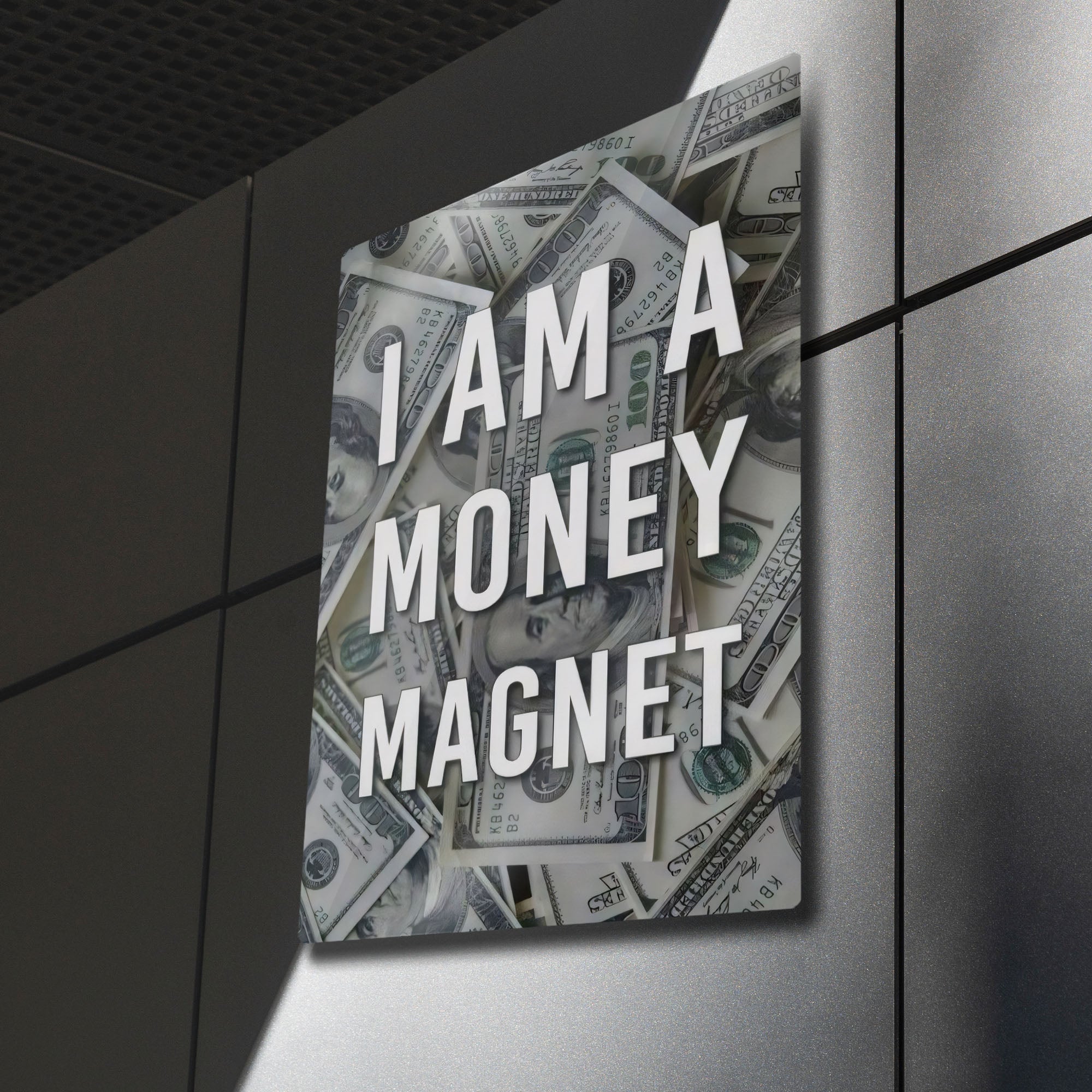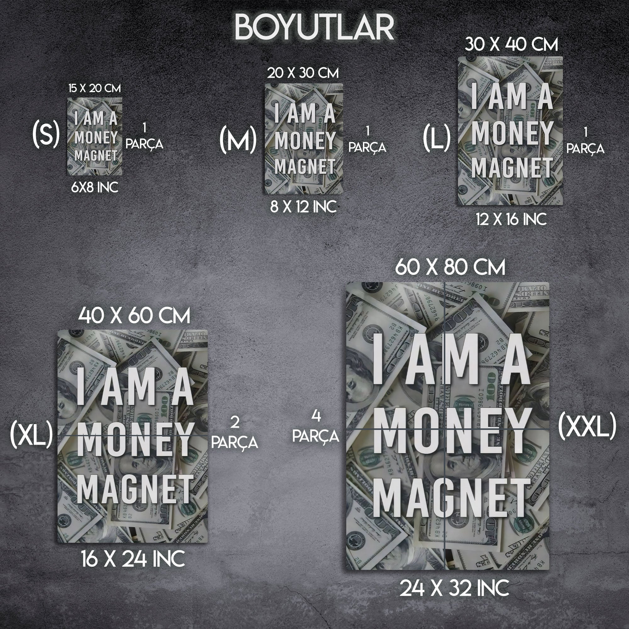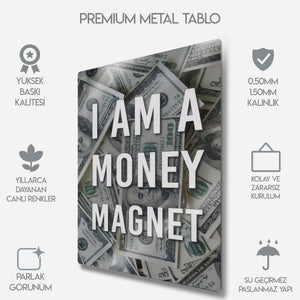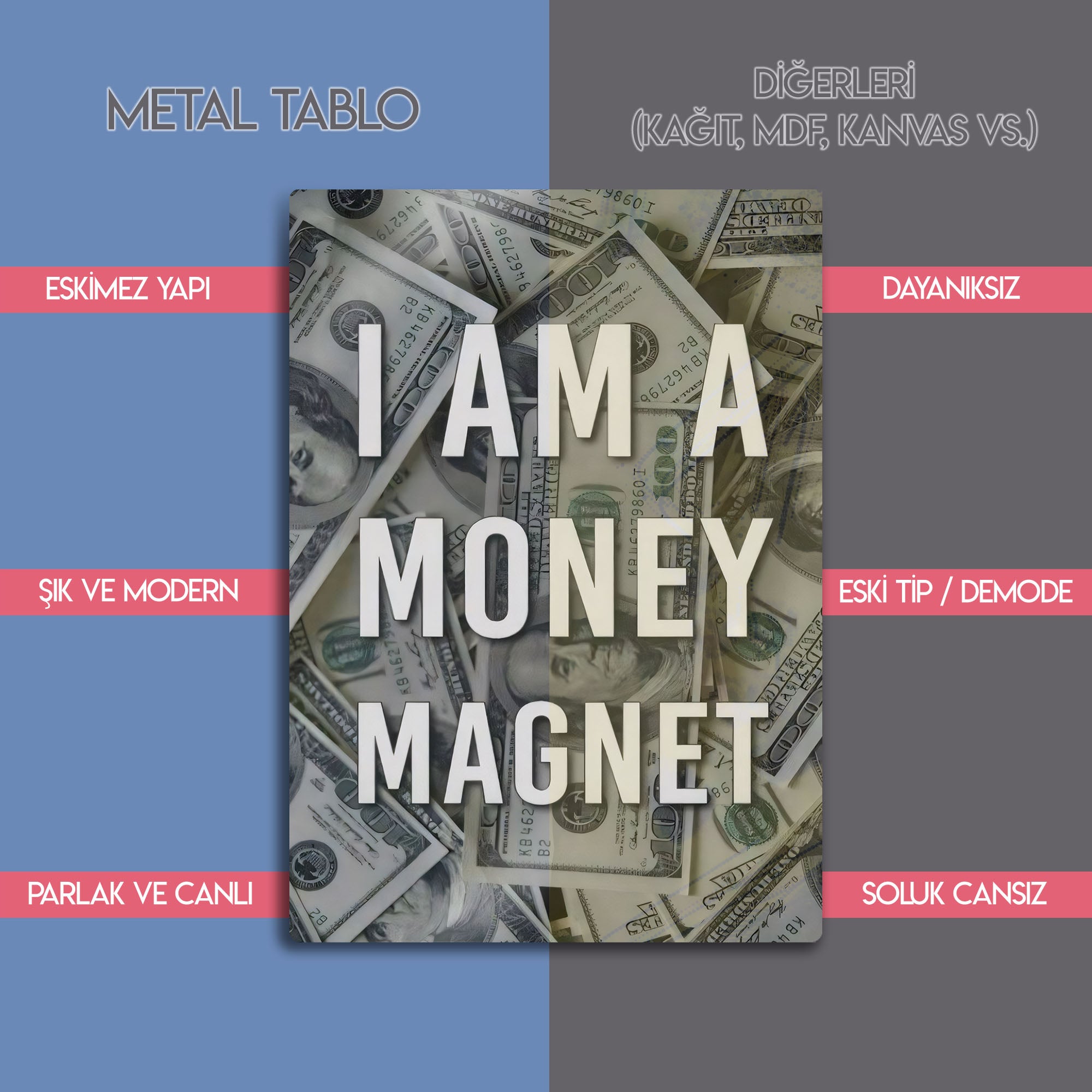Zenginlik zihniyetini benimseyin ve finansal hedeflerinize ulaşmak için kendinizi motive edin! Bu güçlü metal tablo, "I AM A MONEY MAGNET" (Ben Bir Para Mıknatısıyım) olumlamasını, bolluk ve bereketi simgeleyen dolar banknotları arka planı üzerinde net ve iddialı bir şekilde sunuyor.