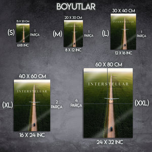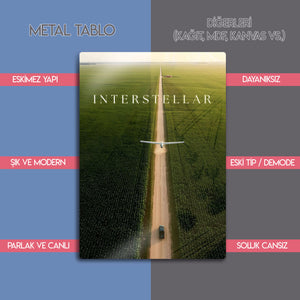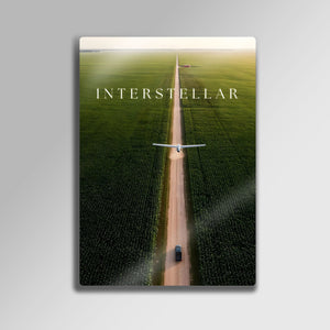 Christopher Nolan'ın sinema tarihine damga vuran başyapıtı Interstellar'ın o unutulmaz ve derin anlamlar taşıyan posteri, şimdi metalin modern ve dayanıklı dokusuyla duvarlarınızda hayat buluyor. Sonsuzluğa uzanan mısır tarlaları arasındaki yol, insanlığın bilinmeze doğru umut dolu yolculuğunu simgelerken, bu minimalist tasarım mekanınıza entelektüel ve sanatsal bir derinlik katacak.