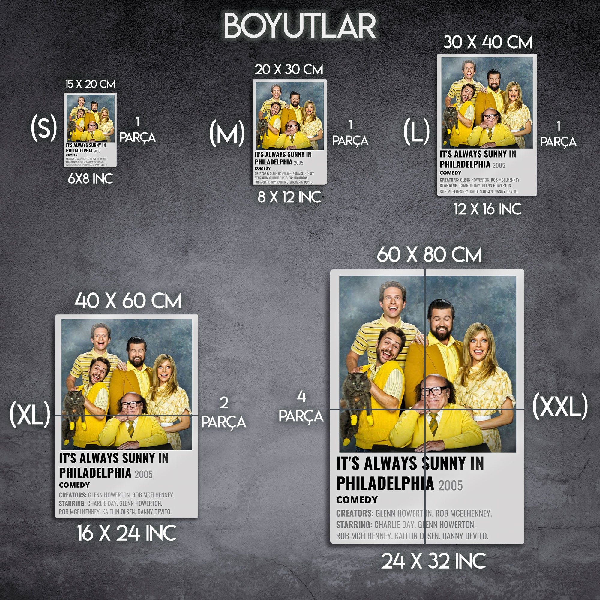 ''The Gang's All Here!'' Televizyonun en ahlaksız, en bencil ve en komik arkadaş grubunun o absürt dünyasını duvarlarınıza taşıyın! Bu özel tasarım metal tablo, "It's Always Sunny in Philadelphia"nın efsanevi "The Gang"ini (Dennis, Mac, Charlie, Dee ve Frank), 80'ler tarzı bir aile fotoğrafı pozuyla ve modern bir "polaroid" film afişi formatında sunuyor.