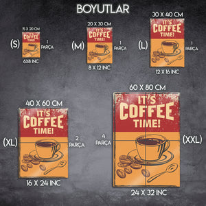 Günün en güzel anı geldi: Kahve Zamanı! Bu retro tasarımlı metal tablo ile kahve molalarınıza nostaljik bir dokunuş katın. Klasik Amerikan diner'larını ve eski kahve dükkanlarını anımsatan eskitme efektleri ve cesur tipografisiyle bu eser, mekanınıza anında sıcak ve samimi bir karakter kazandırır.
