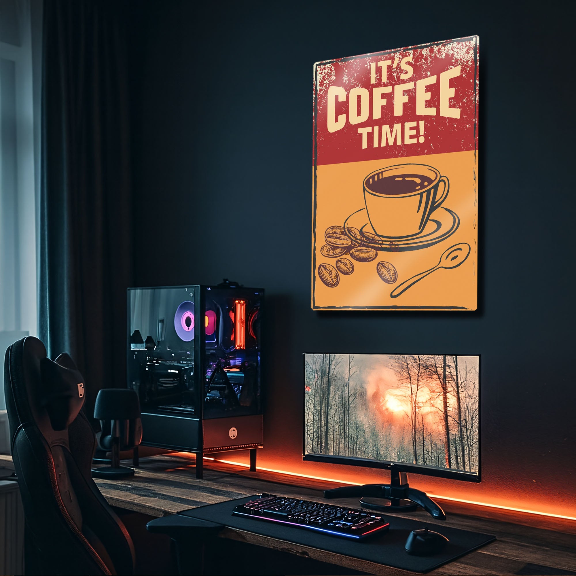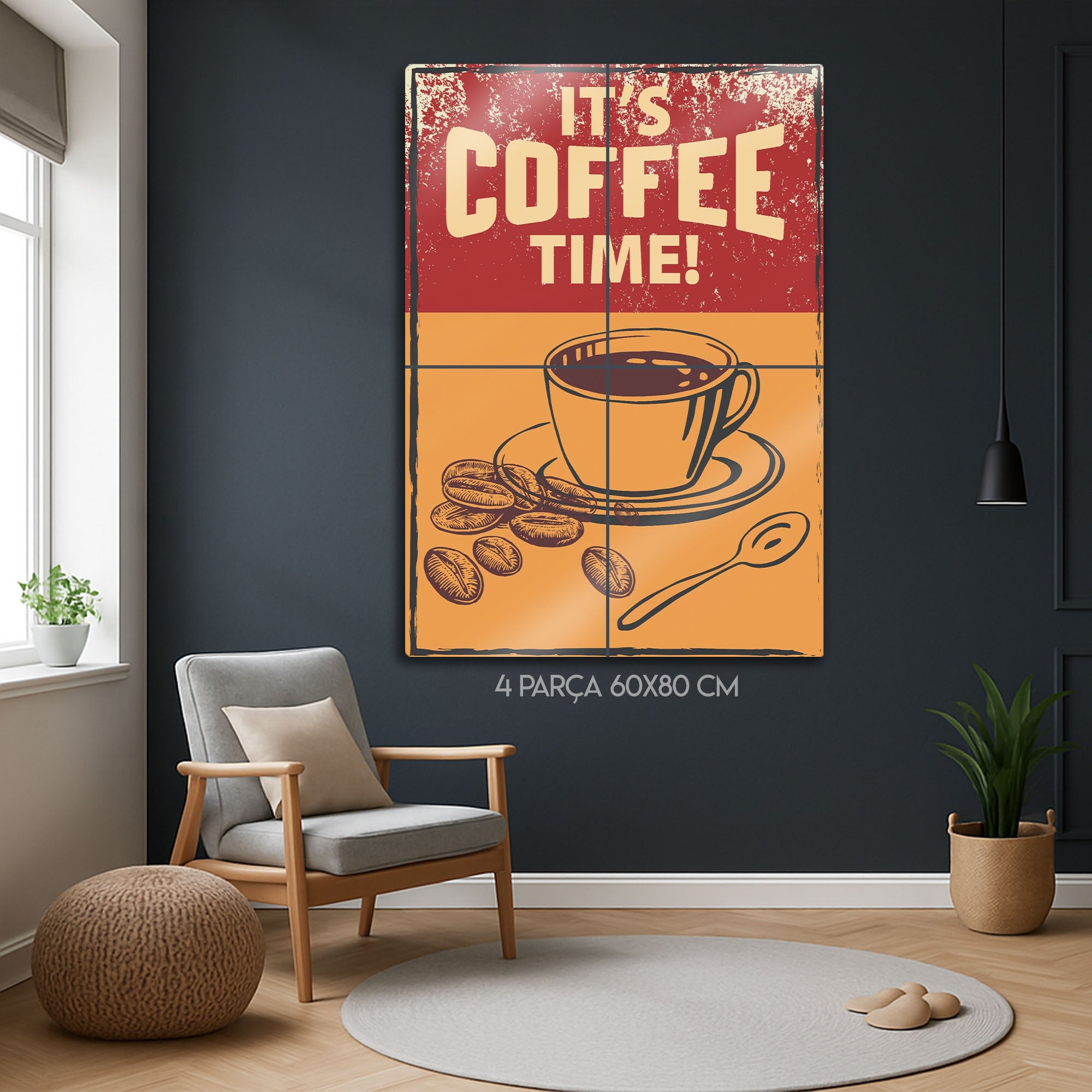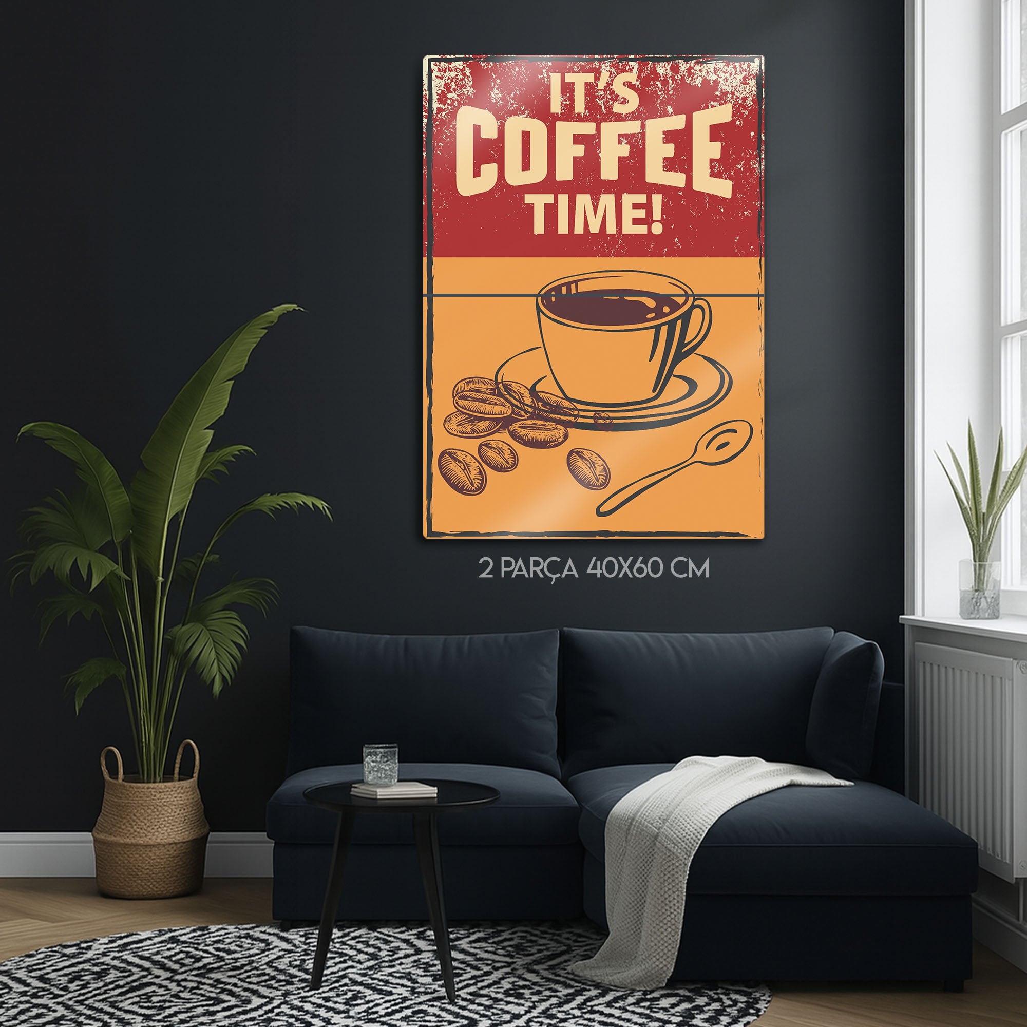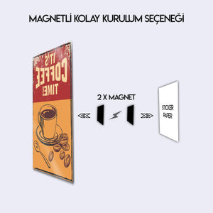 "It's Coffee Time!" sloganını, çekici bir kahve fincanı ve taze çekirdek illüstrasyonlarıyla birleştiren bu tablo, kahve tutkunları için vazgeçilmez bir dekorasyon parçasıdır. Metalin dayanıklılığı ile vintage estetiğin sıcaklığını bir araya getiren bu tasarım, mutfağınızın, kahve köşenizin, ofisinizin veya kafenizin duvarında harika görünecek.