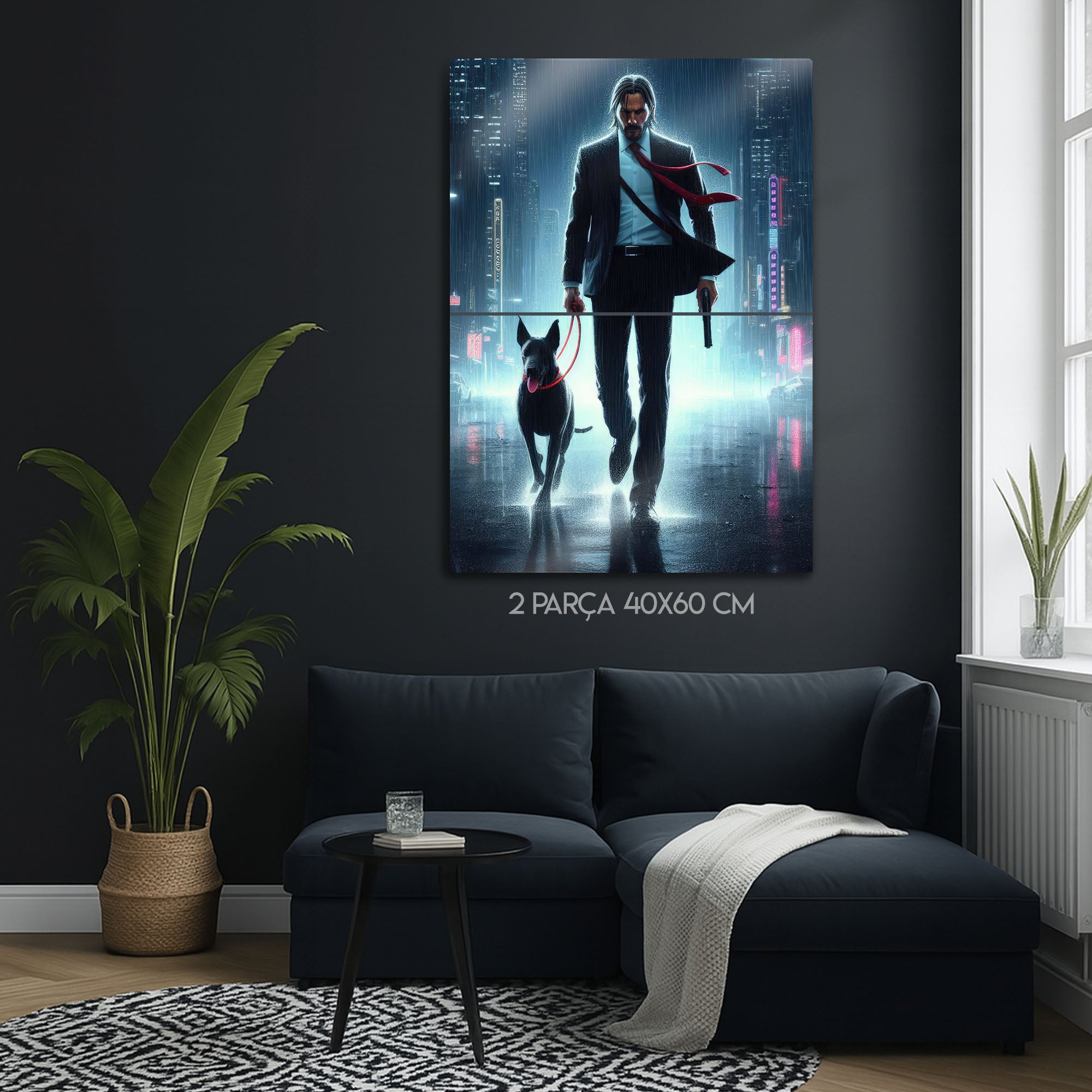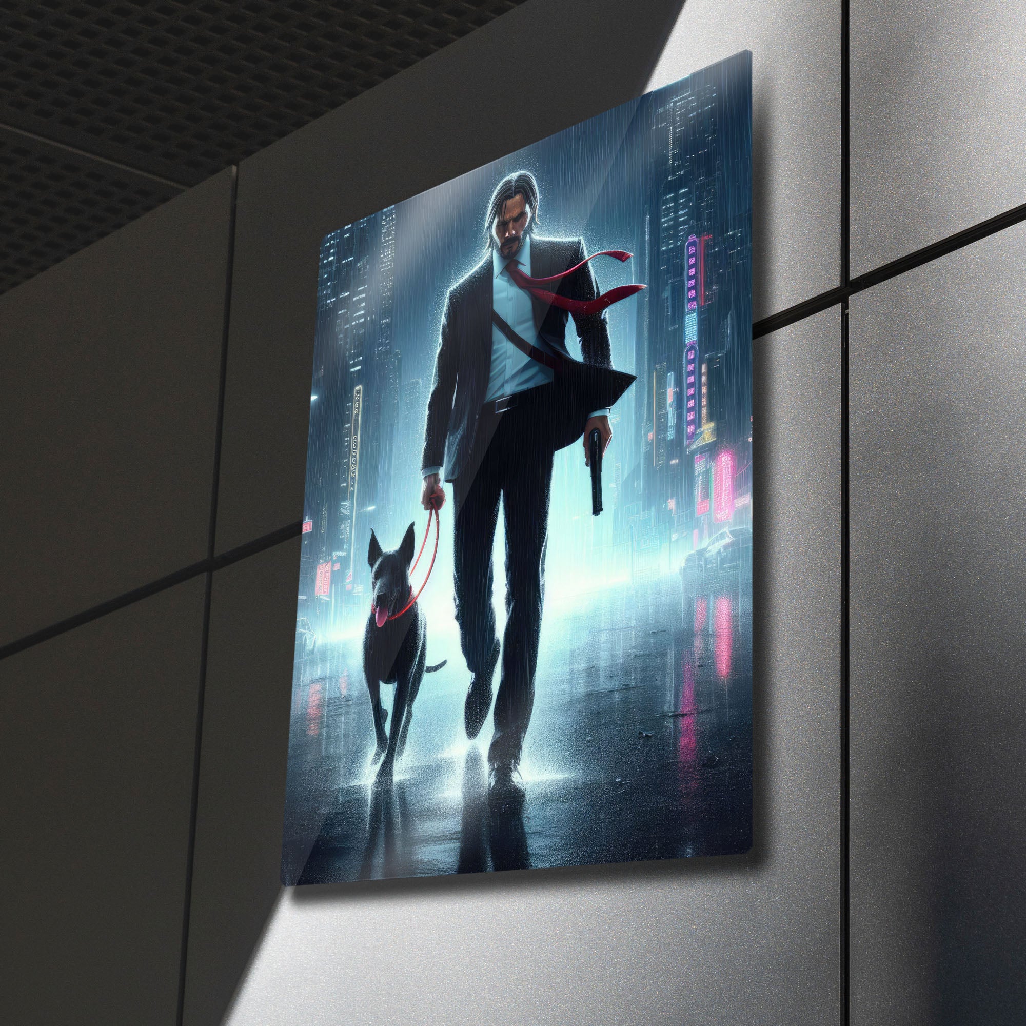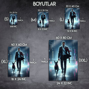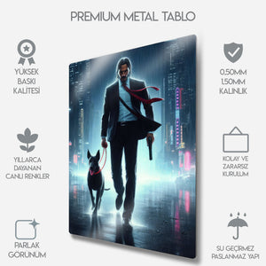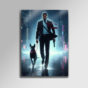 Aksiyon sinemasının efsanesi John Wick'in durdurulamaz kararlılığını ve eşsiz stilini duvarlarınıza yansıtın! Neon ışıklarla aydınlanan yağmurlu bir şehirde, sadık dostuyla birlikte yürüyen "Baba Yaga"nın bu sanatsal tasviri, yüksek kaliteli metal malzeme üzerine tüm detaylarıyla işlendi.