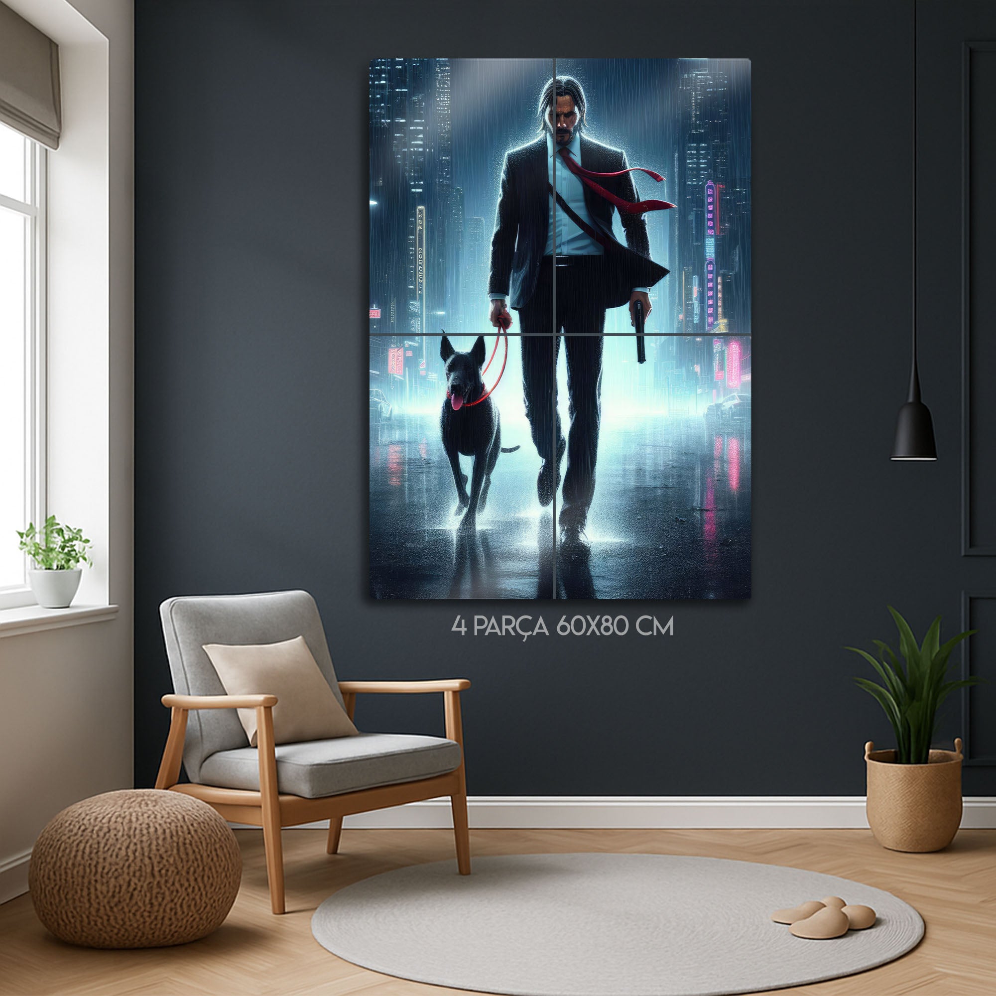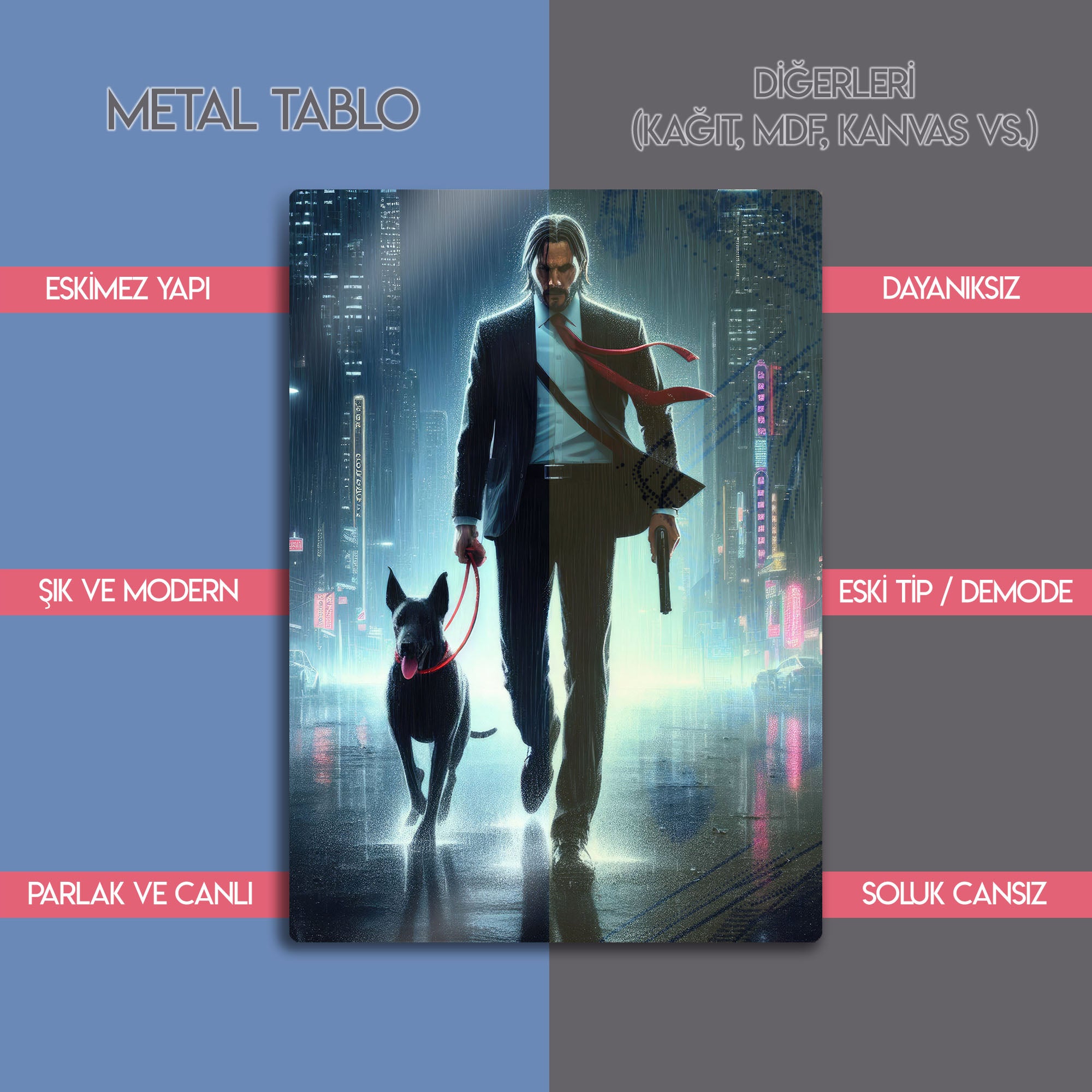 Bu sinematik metal tablo, John Wick evreninin o karanlık ve etkileyici atmosferini yaşam alanınıza taşıyor. Modern ve karizmatik duruşuyla ofis, salon, sinema odası veya erkeklere özel "man cave" alanları için vazgeçilmez bir dekorasyon parçası olacak. Canlı renkleri ve dayanıklı yapısı ile bu tablo, koleksiyonunuzun en özel parçası olmaya aday.