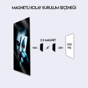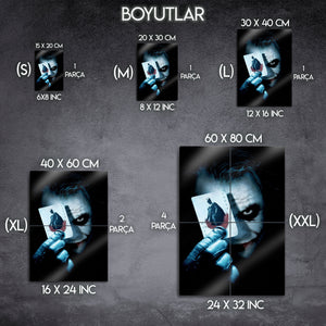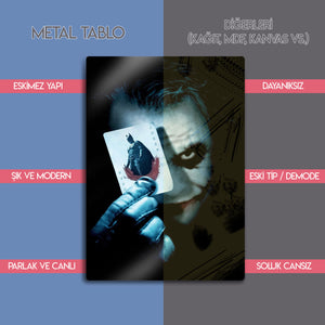Bu özel tasarım metal tablo, karanlık ve atmosferik tonları, keskin detayları ve karakterin ürkütücü bakışını metalin modern dokusuyla birleştirerek evinize veya ofisinize sofistike bir hava katıyor. Her bakışta sizi Gotham'ın derinliklerine çekecek bu sanat eseri, sinema severler ve koleksiyonerler için eşsiz bir parçadır.