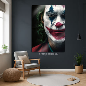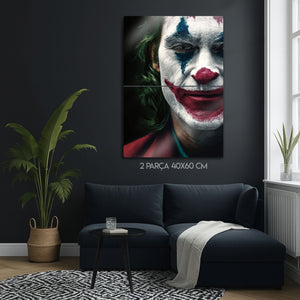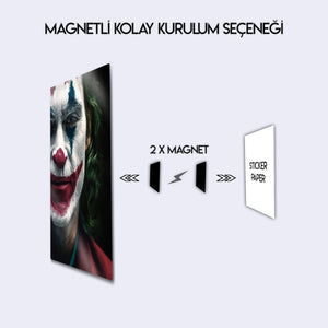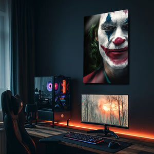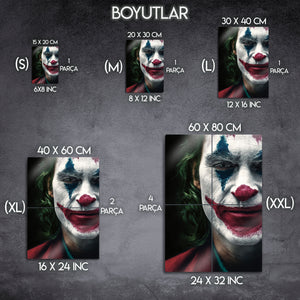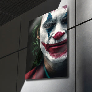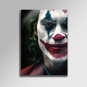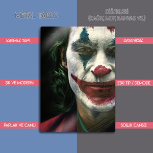 Joaquin Phoenix'e Oscar kazandıran, modern sinemanın en sarsıcı karakterlerinden Arthur Fleck'in (Joker) ruhuna yakından bir bakış... Bu etkileyici metal tablo, karakterin trajedisini, isyanını ve dönüşümünü tek bir portrede yoğunlaştırıyor. Makyajın altındaki hüznü ve deliliği yansıtan bu sanat eseri, yüksek çözünürlüklü baskı kalitesiyle metalin soğuk ve modern dokusunda hayat buluyor.