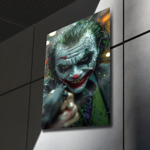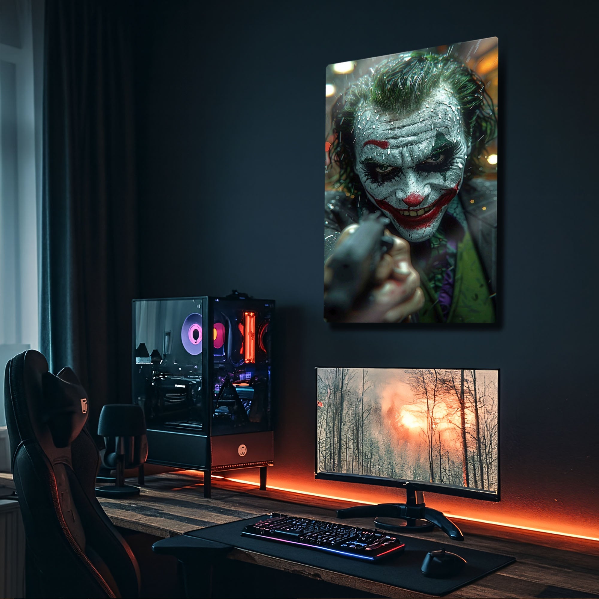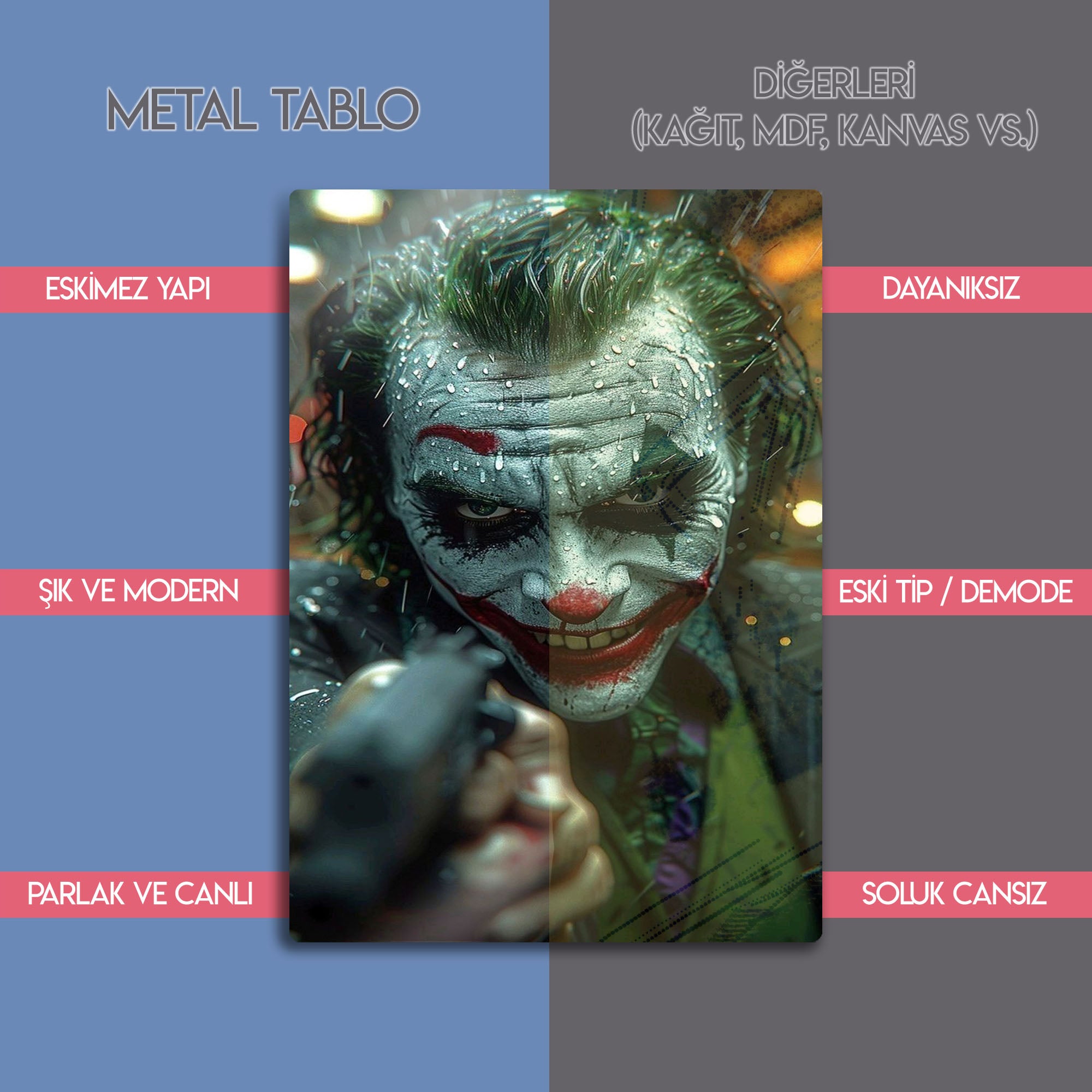 Kaosla yüzleşmeye hazır mısın? Bu hiper-realist metal tablo, Joker'in öngörülemez ve tehlikeli doğasını en çarpıcı haliyle yakalıyor. Yağmur damlalarının ıslattığı yüzündeki her çizgi, her çatlak ve gözlerindeki o deli bakış, yüksek çözünürlüklü baskı kalitesiyle metal yüzeyde adeta canlanıyor.