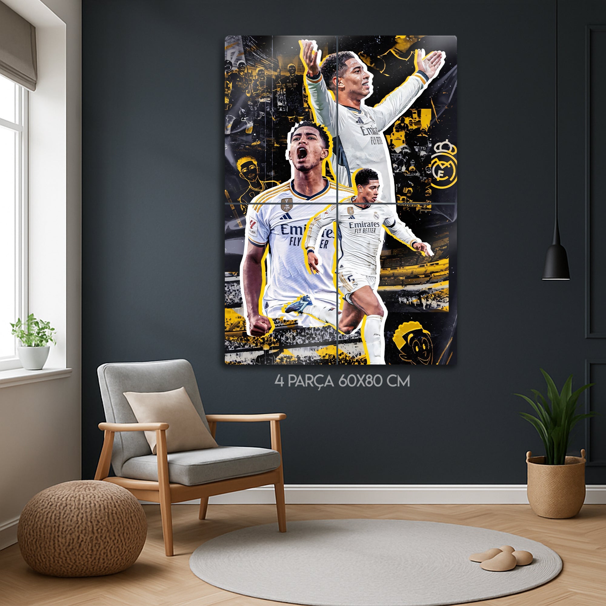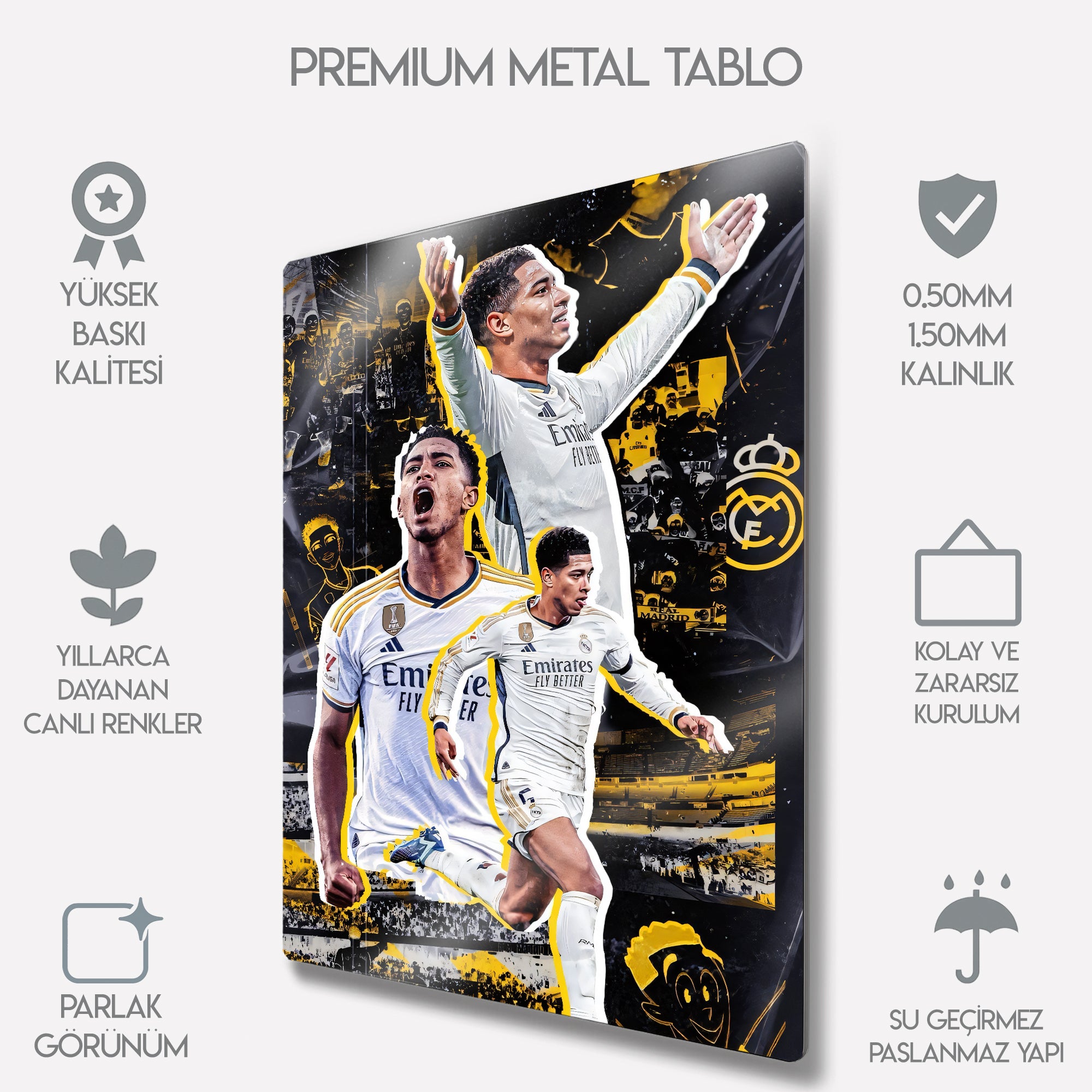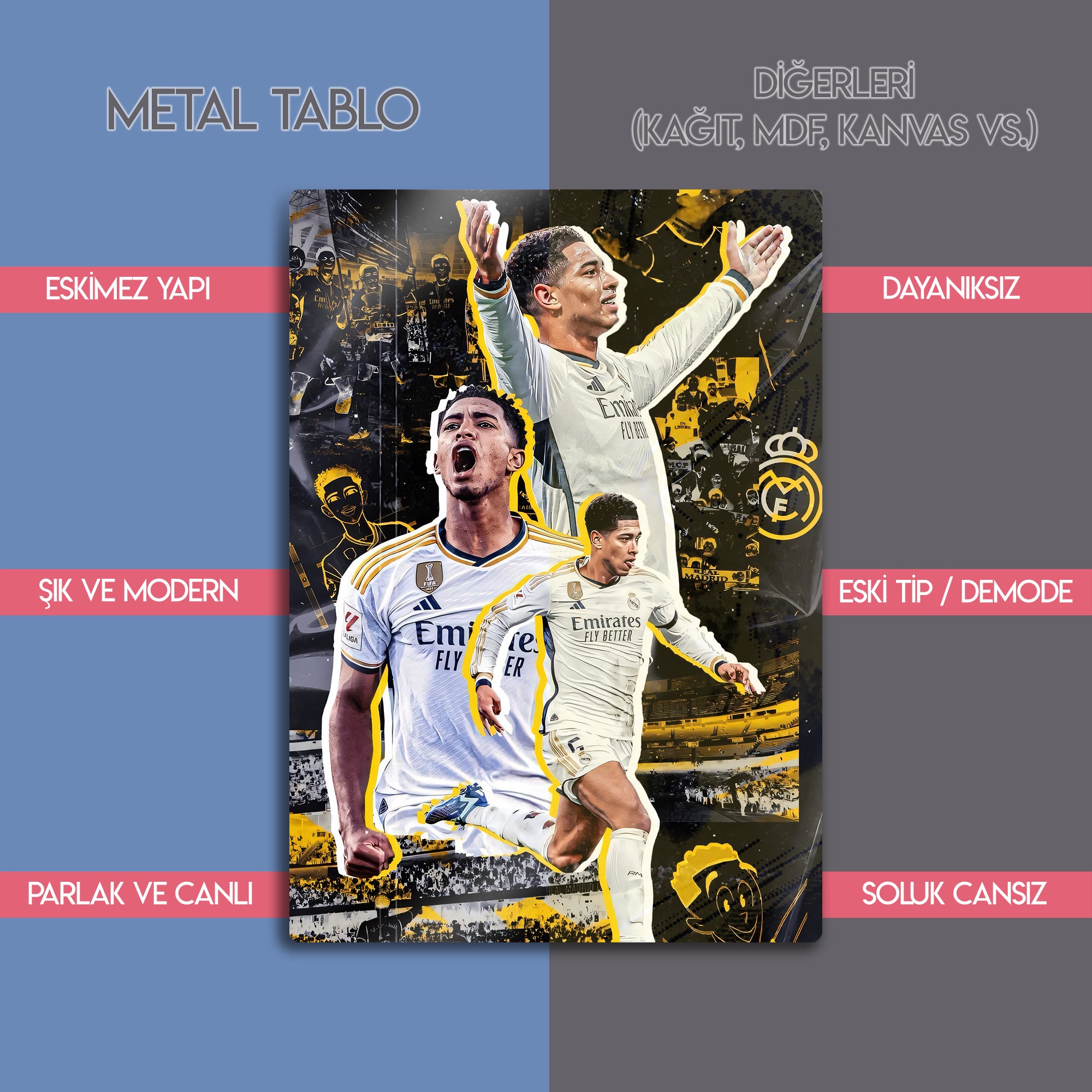 Futbol tutkunları için özel olarak tasarlanan bu metal tablo, Real Madrid’in genç yıldızı Jude Bellingham’ı farklı anlarıyla ölümsüzleştiriyor. Tribün atmosferi ve güçlü tasarım detaylarıyla birleşen bu tablo, hem koleksiyon ürünü hem de eşsiz bir duvar dekoru olarak öne çıkıyor.