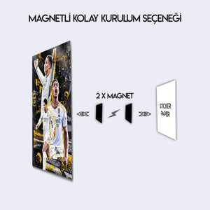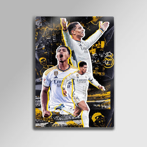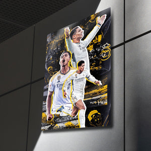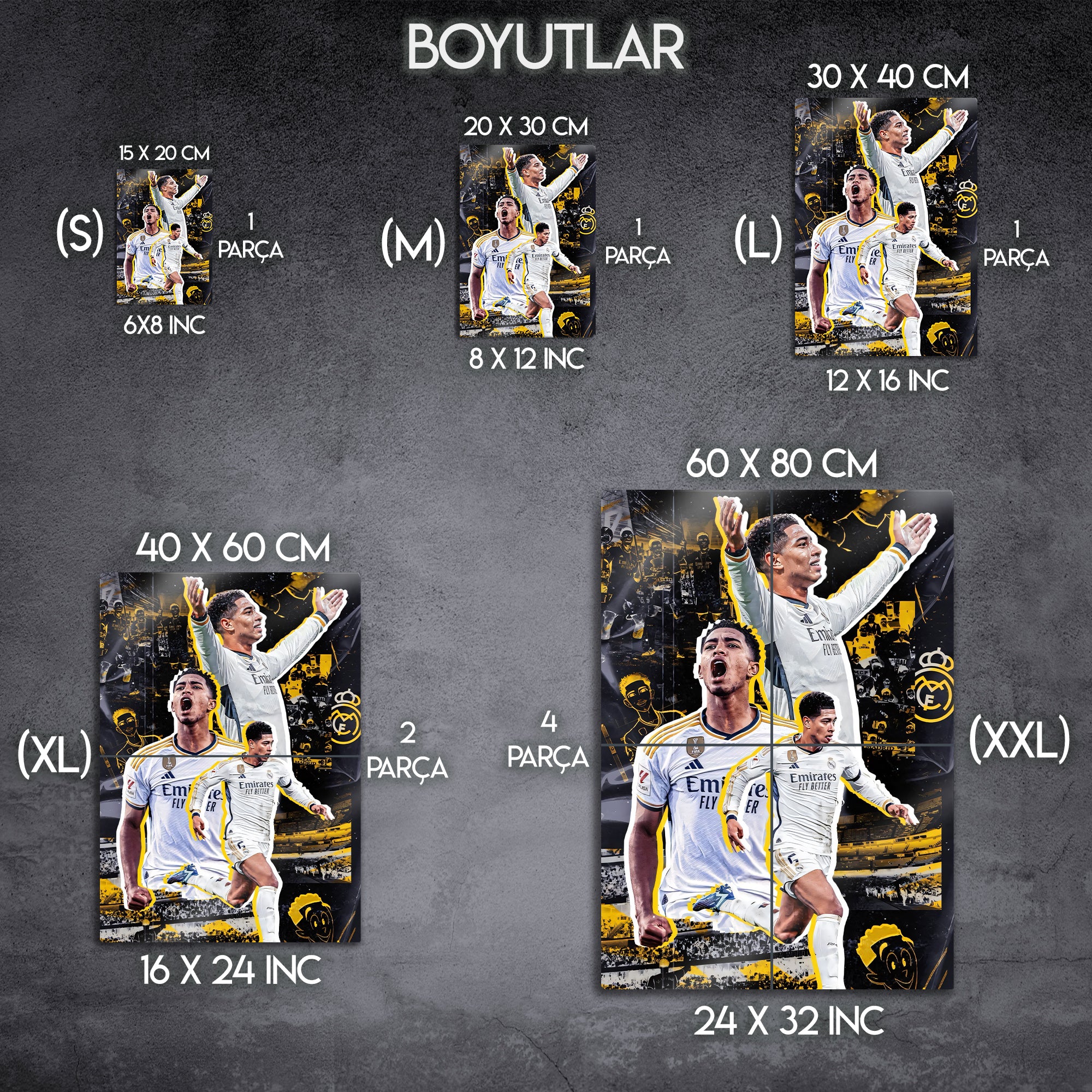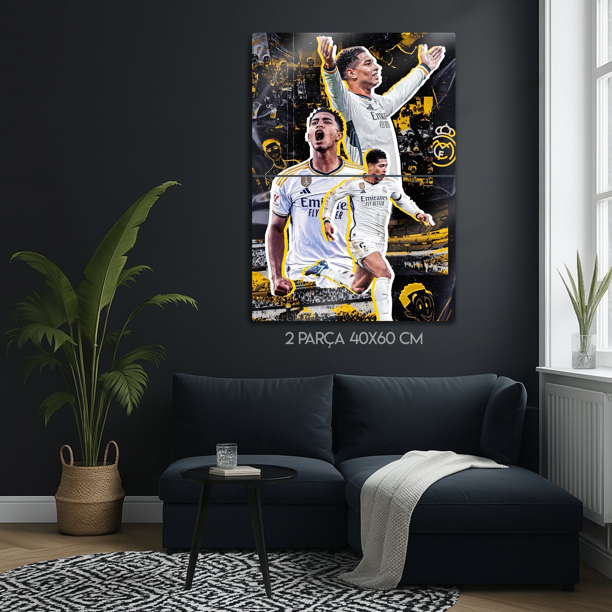 Futbol tutkunları için özel olarak tasarlanan bu metal tablo, Real Madrid’in genç yıldızı Jude Bellingham’ı farklı anlarıyla ölümsüzleştiriyor. Tribün atmosferi ve güçlü tasarım detaylarıyla birleşen bu tablo, hem koleksiyon ürünü hem de eşsiz bir duvar dekoru olarak öne çıkıyor.