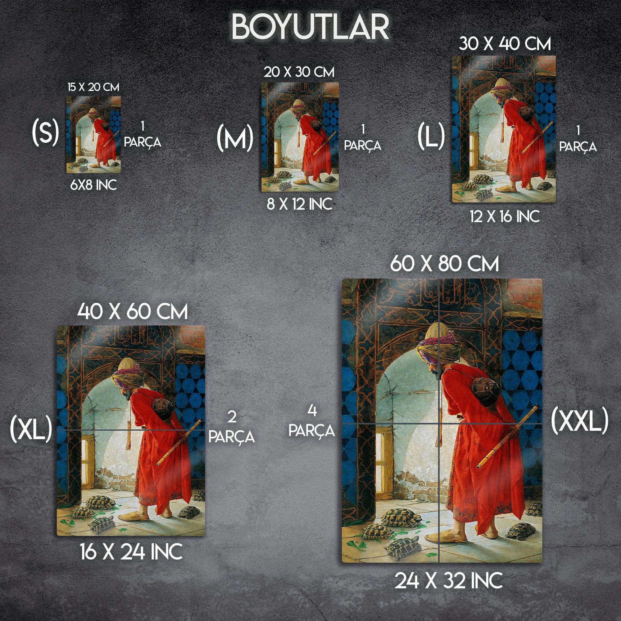 Türk resim sanatının en ikonik ve değerli eserlerinden biri olan Osman Hamdi Bey'in "Kaplumbağa Terbiyecisi" başyapıtını, modern bir yorumla duvarlarınıza taşıyın. Sabır, bilgelik ve zamanın yavaş akışını anlatan bu derinlikli ve alegorik eser, şimdi metalin kalıcı ve şık dokusuyla yeniden hayat buluyor.