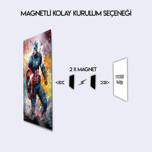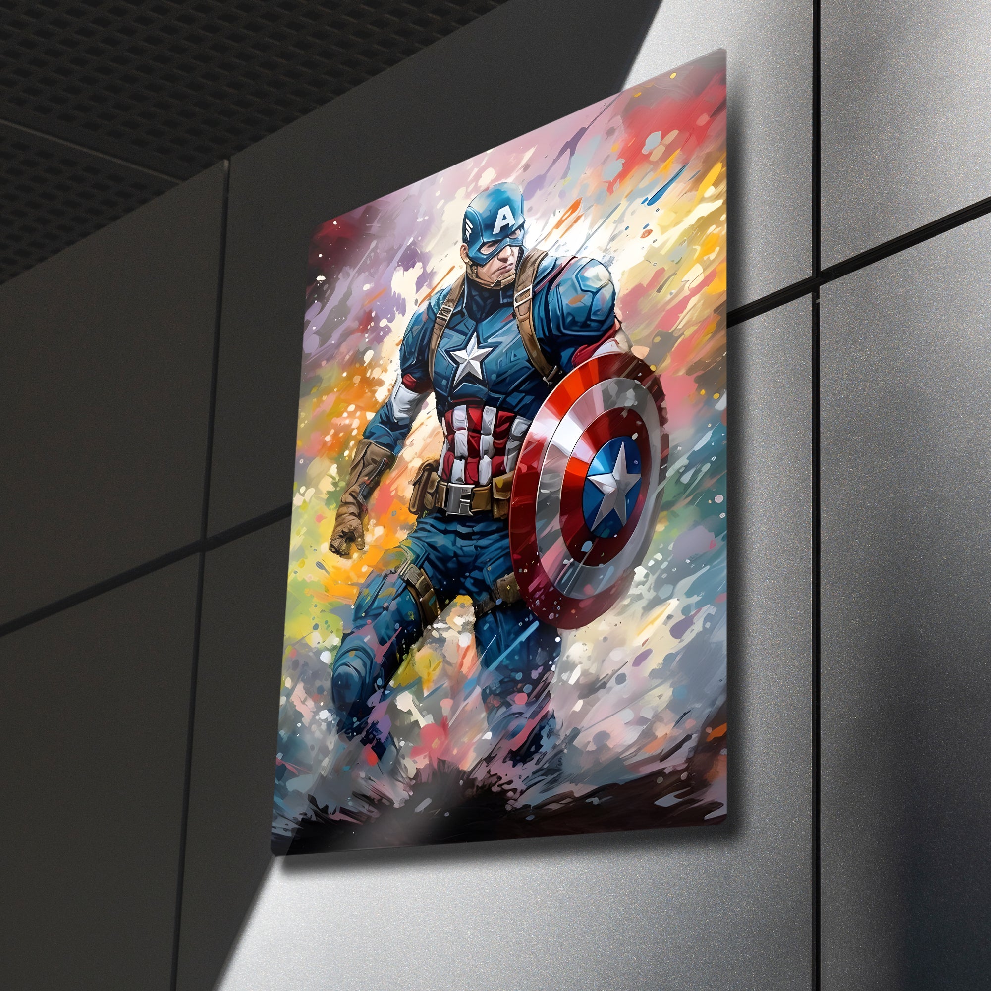 Marvel dünyasının en ikonik kahramanlarından Captain America, güçlü duruşu ve efsanevi kalkanıyla bu özel metal tabloda hayat buluyor. Renkli ve enerjik tasarımıyla hem koleksiyonunuza değer katacak hem de yaşam alanınıza modern bir hava katacak.