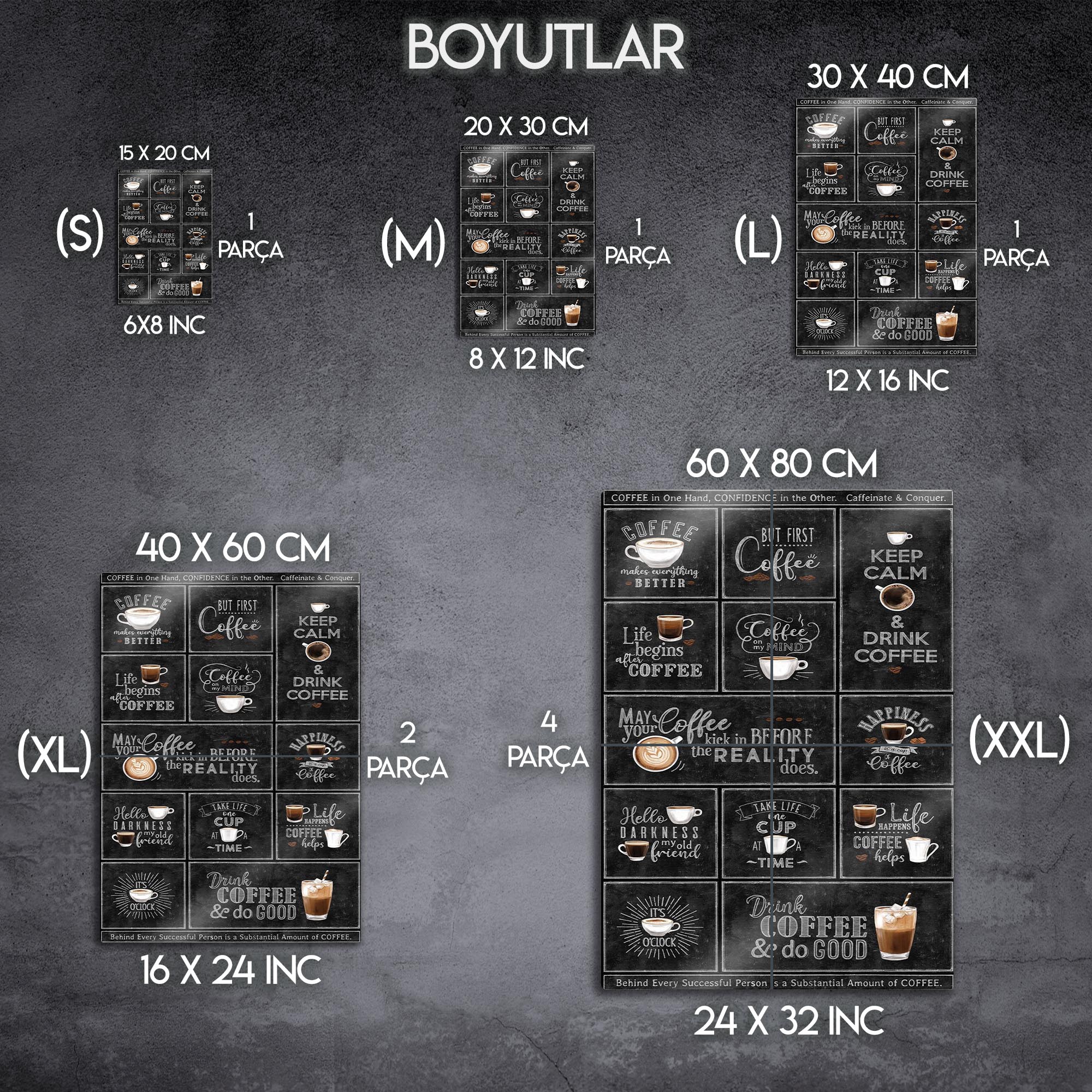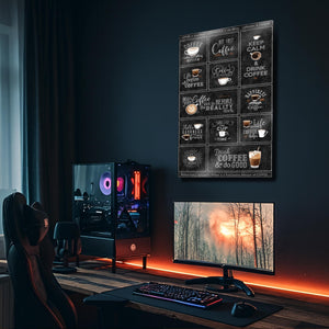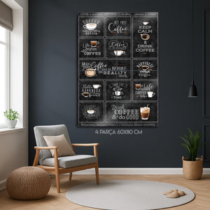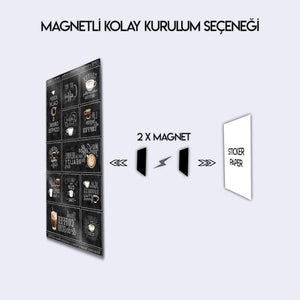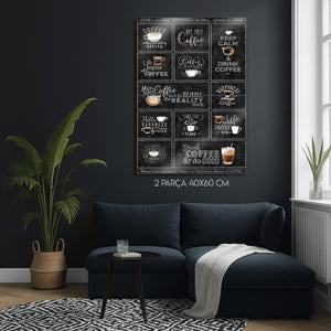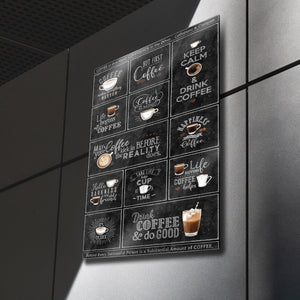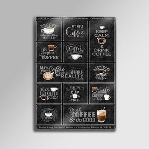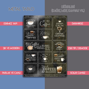 Kahveye olan tutkunuzu duvarlarınıza yansıtmanın en şık yolu! Bu eşsiz metal tablo, "But First, Coffee", "Keep Calm & Drink Coffee", "Life begins after Coffee" gibi en sevilen kahve sözlerini ve mottolarını, otantik bir kara tahta (chalkboard) tasarımıyla bir araya getiriyor. Her bir kutucuk, kahve severlerin ruhuna dokunan farklı bir mesaj ve illüstrasyon içeriyor.