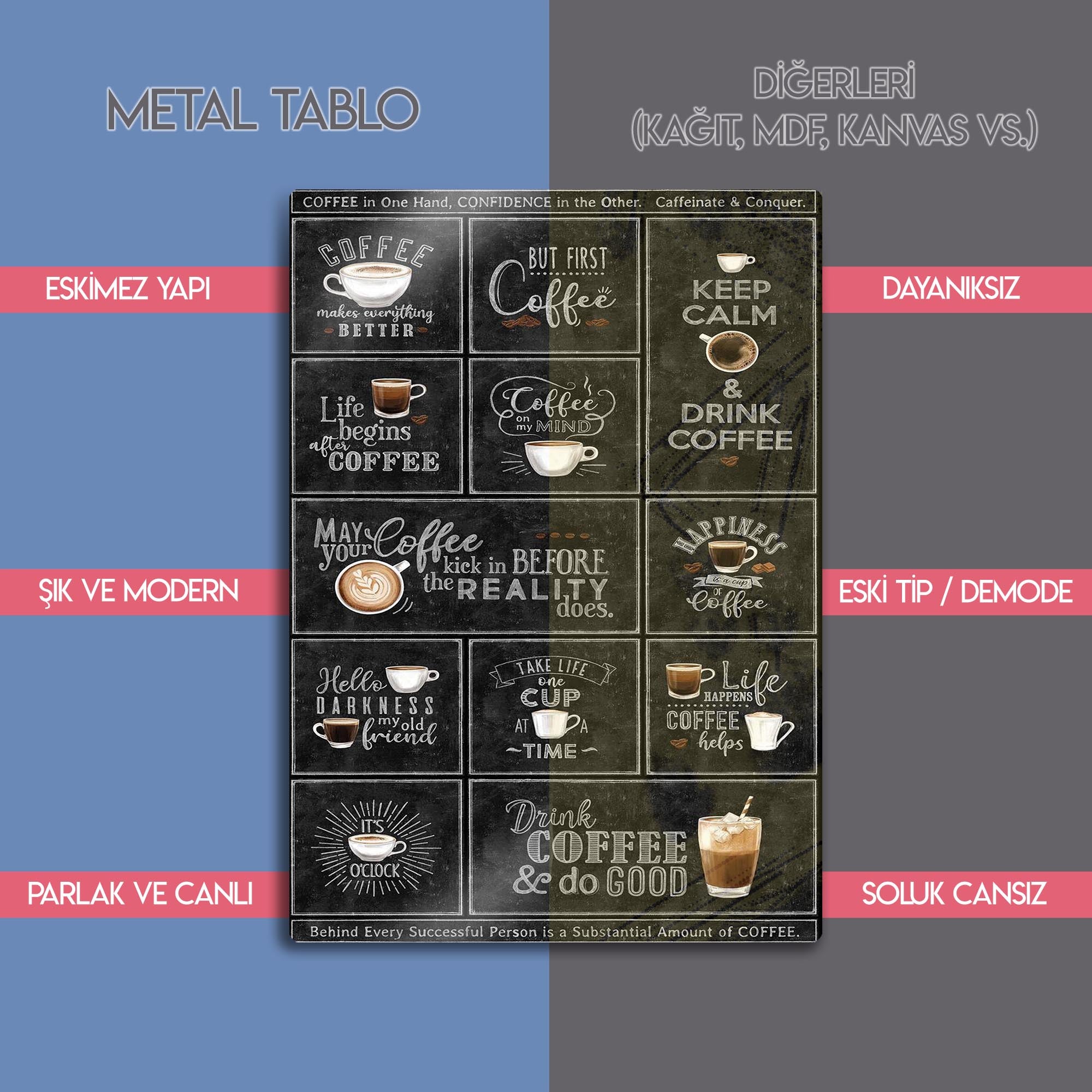 Vintage ve retro bir dokunuşa sahip bu kolaj, mutfağınızın, kahve köşenizin, ofisinizin veya kafenizin atmosferini anında ısıtacak ve karakter katacaktır. Yüksek kaliteli metal malzeme üzerine yapılan detaylı baskı, tebeşirle yazılmış hissini ve her bir fincanın cazibesini mükemmel bir şekilde yansıtır. Bu tablo, sadece bir dekorasyon objesi değil, aynı zamanda bir yaşam tarzı beyanıdır.