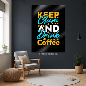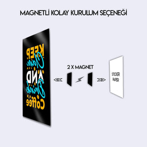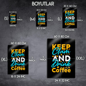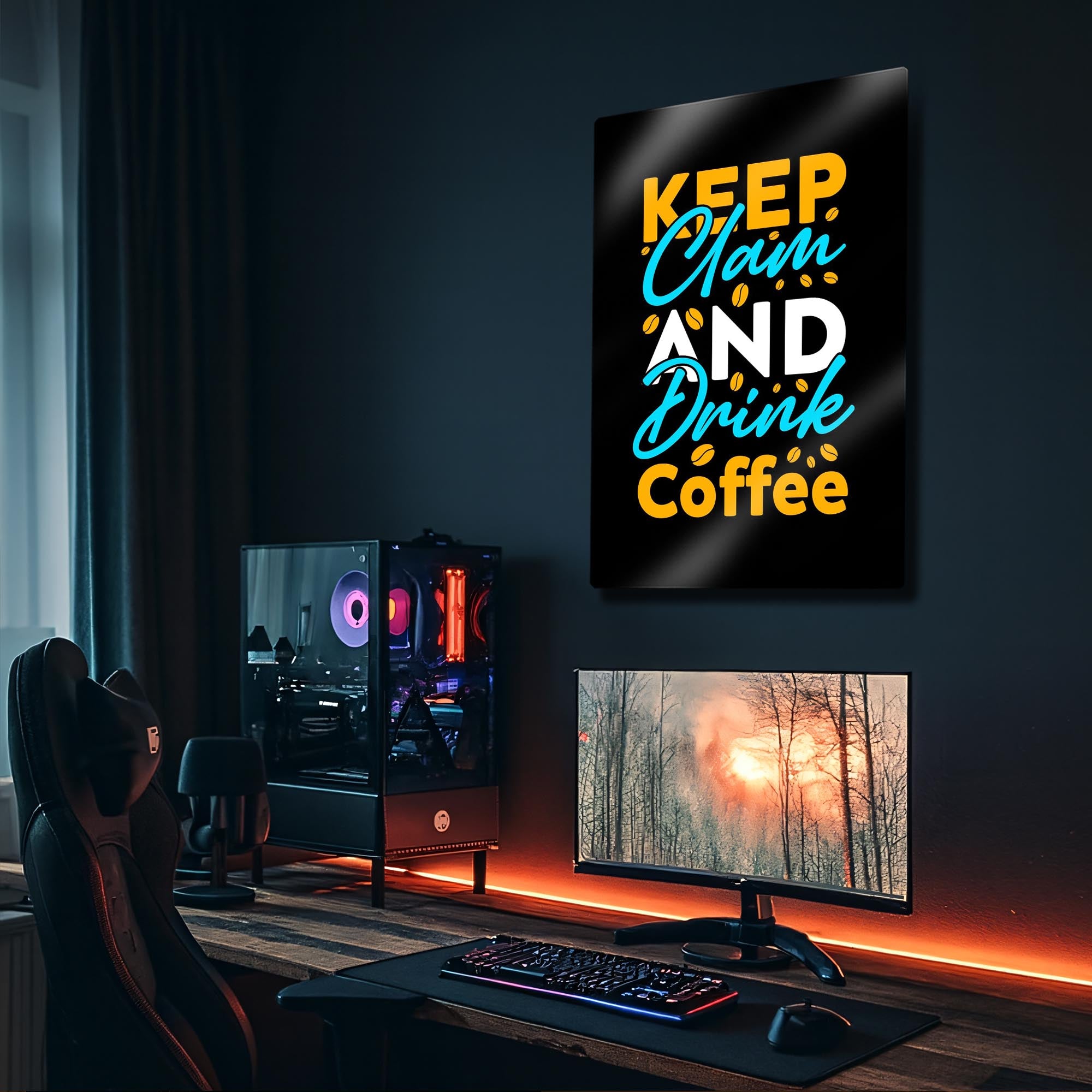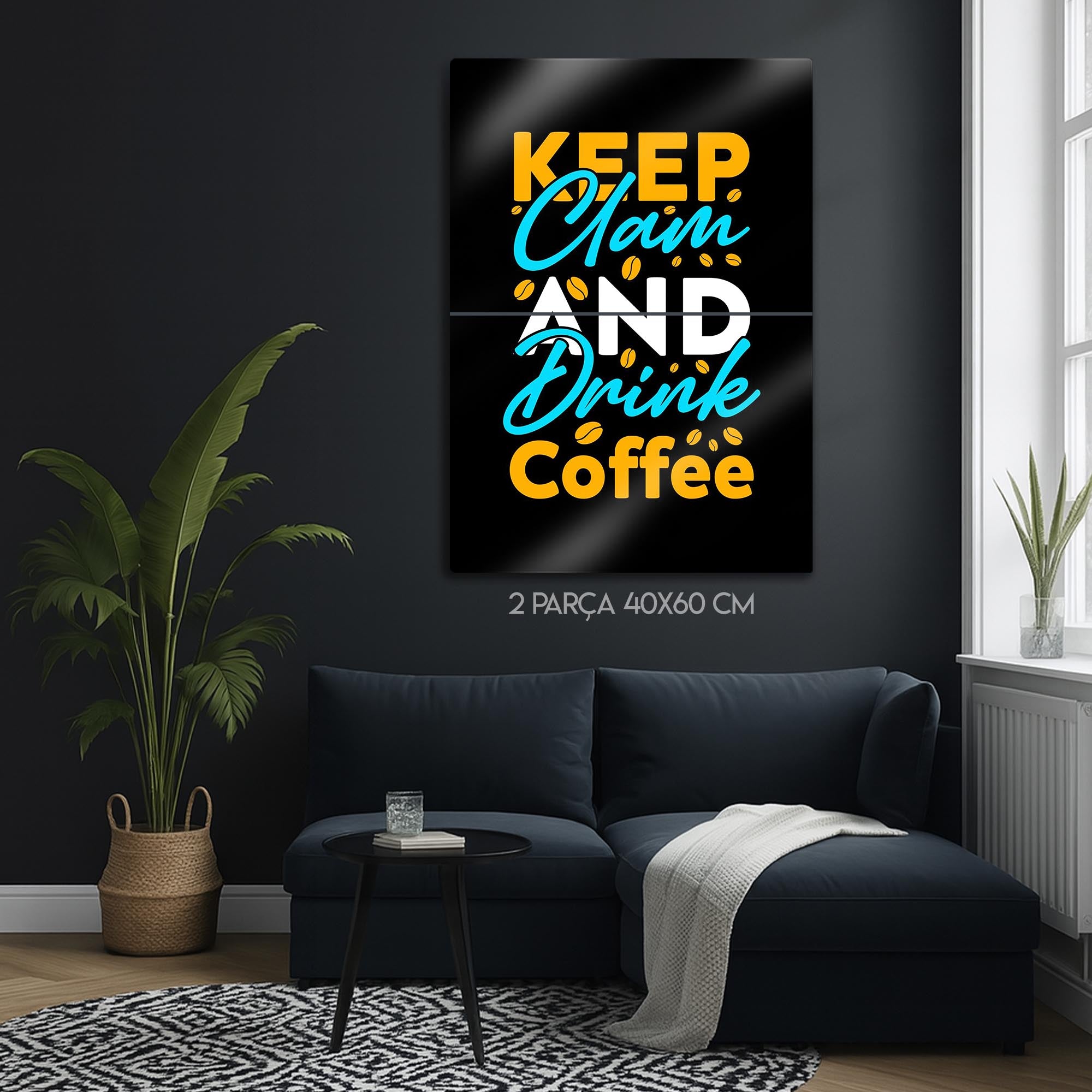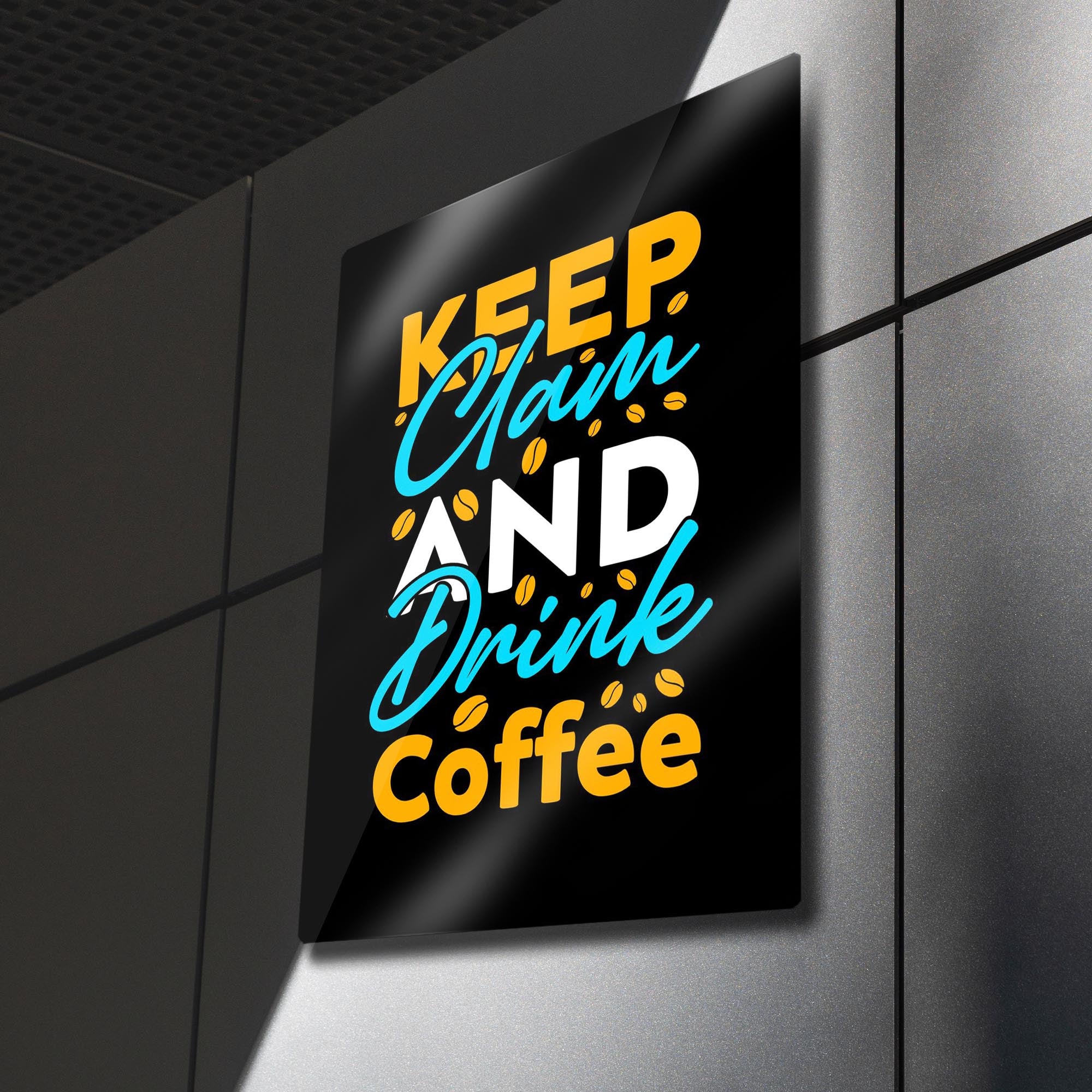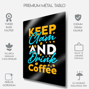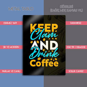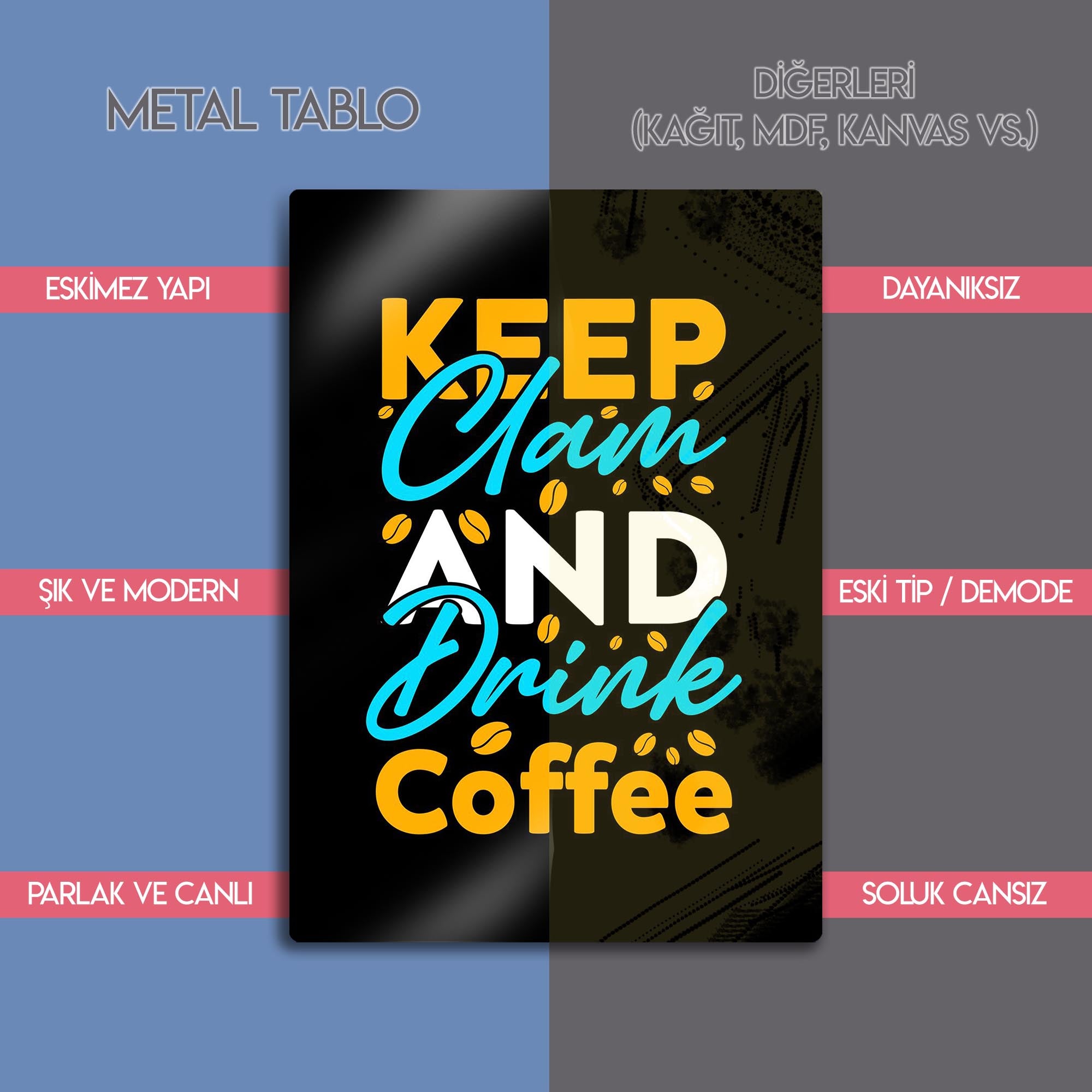 Günün mottosu: Sakin ol ve kahve iç! Kahve tutkunlarının yaşam felsefesini duvarlara taşıyan bu enerjik metal tablo ile güne motivasyonla başlayın. "Keep Calm and Drink Coffee" sözünü modern ve dinamik bir tipografiyle birleştiren bu tasarım, her mekana anında neşe ve stil katacak.