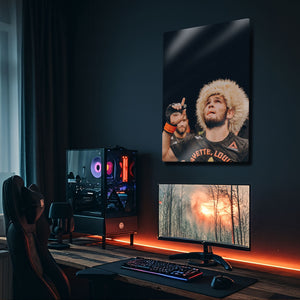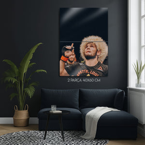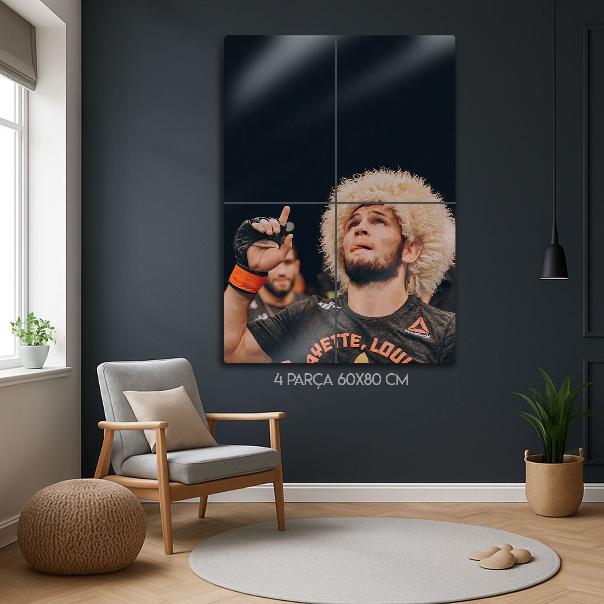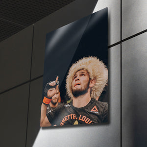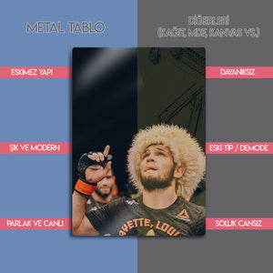 Yenilmez şampiyon, UFC efsanesi Khabib "The Eagle" Nurmagomedov'un gücünü, inancını ve sarsılmaz iradesini duvarlarınıza taşıyın! Bu özel tasarım metal tablo, Khabib'in ikonik papahasıyla (Dağıstan kalpağı) ringe çıktığı ve zafer sonrası gökyüzünü işaret ettiği o unutulmaz anlardan birini ölümsüzleştiriyor.