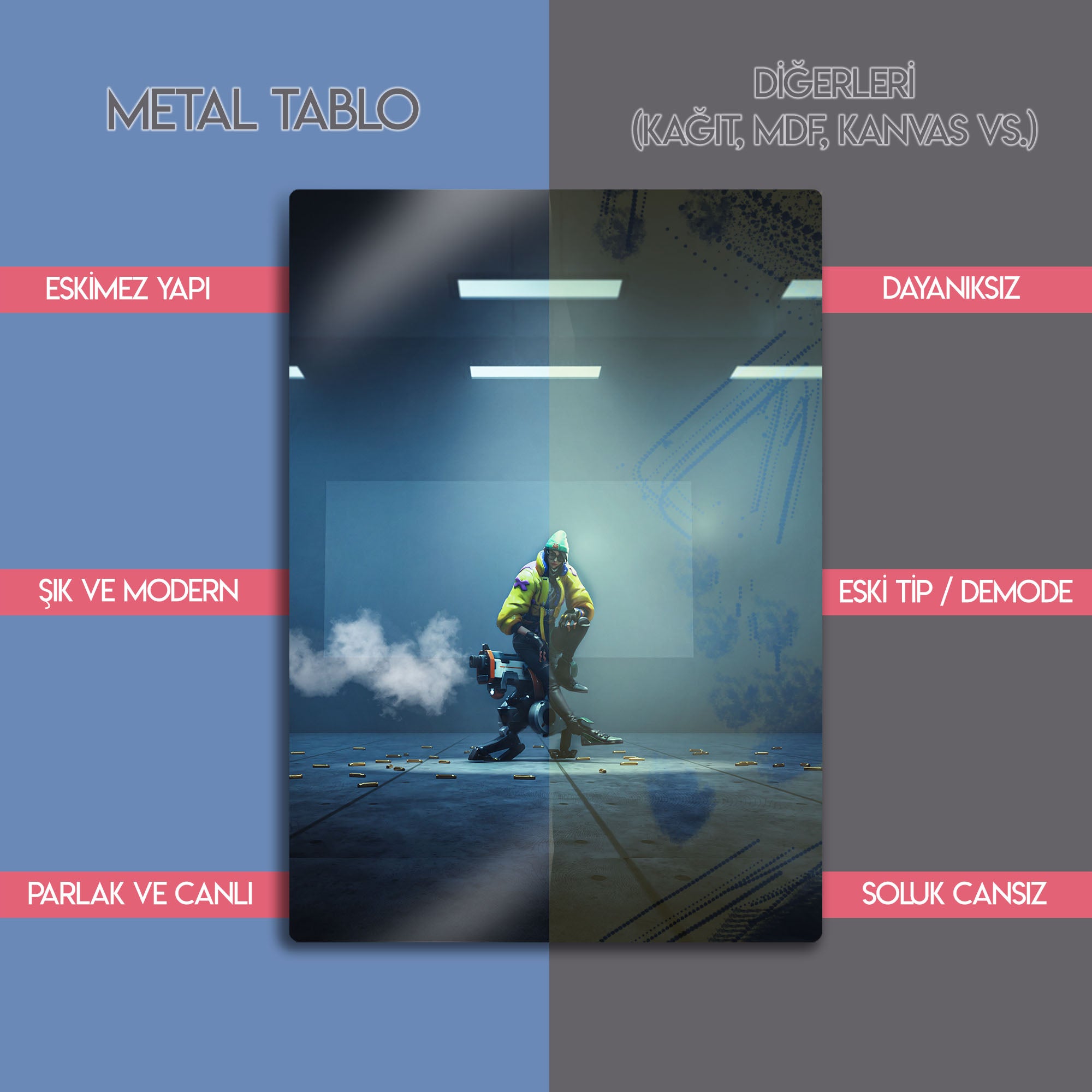Bu eser, her Valorant ve FPS oyunu hayranının koleksiyonunda olması gereken, hem karakterin zekasını hem de oyunun rekabetçi ruhunu yansıtan bir parçadır. Metalin modern ve pürüzsüz yüzeyi, bu sanatsal tasarımın her bir detayını, atmosferik aydınlatmayı ve karakterin o "cool" tavrını mükemmel bir şekilde öne çıkarır.