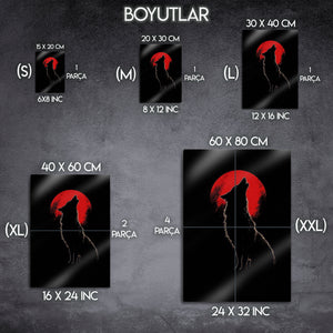 Gecenin sessizliğini bozan o vahşi çağrıyı duvarlarınıza taşıyın. Bu minimalist ve güçlü metal tablo, kan kırmızısı bir dolunayın önünde uluyan bir kurdun etkileyici silüetini tasvir ediyor. Japon sumi-e fırça sanatını andıran estetiğiyle bu eser, basitliğin içindeki derin gücü ve doğanın ham çağrısını mükemmel bir şekilde yansıtıyor.