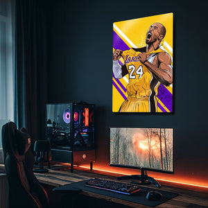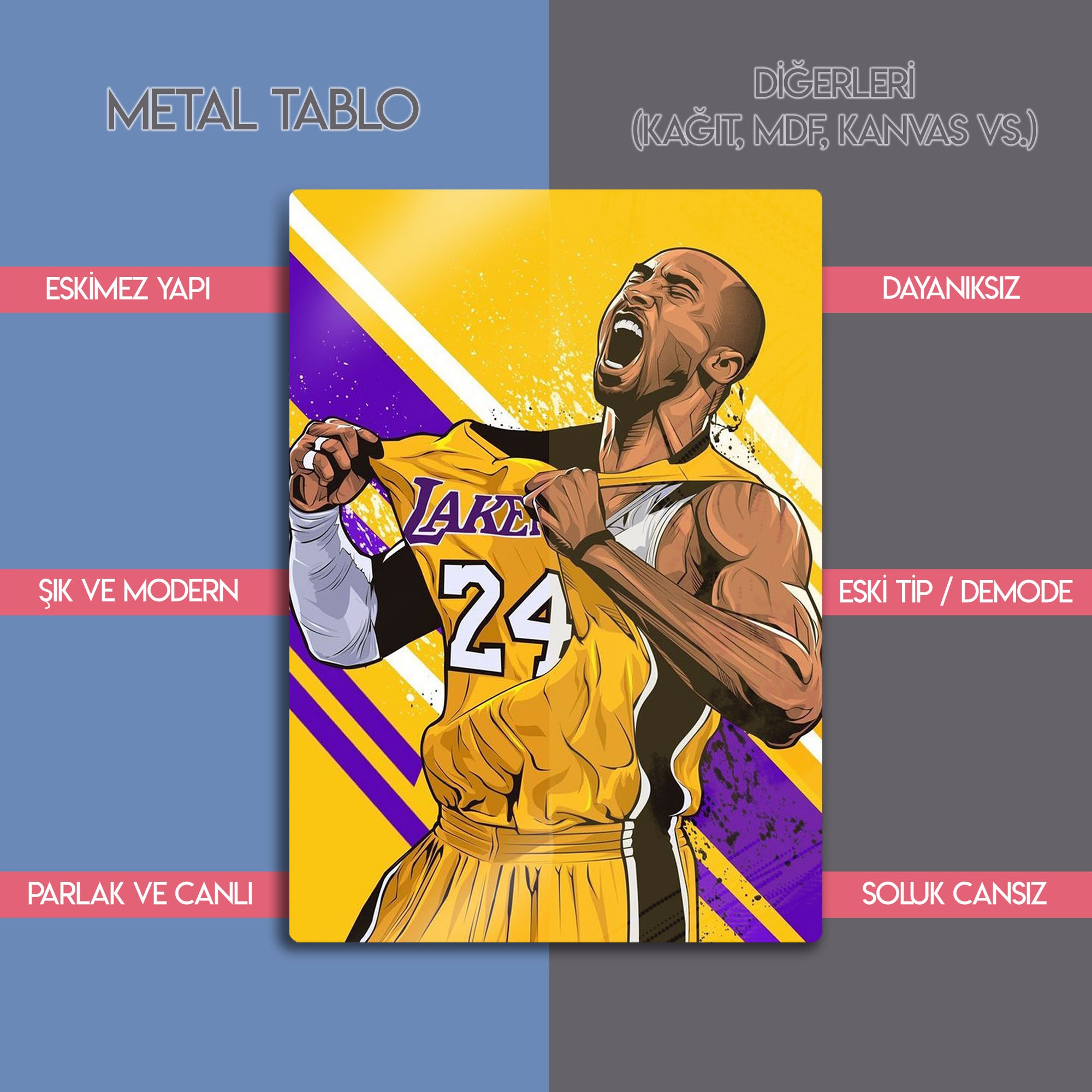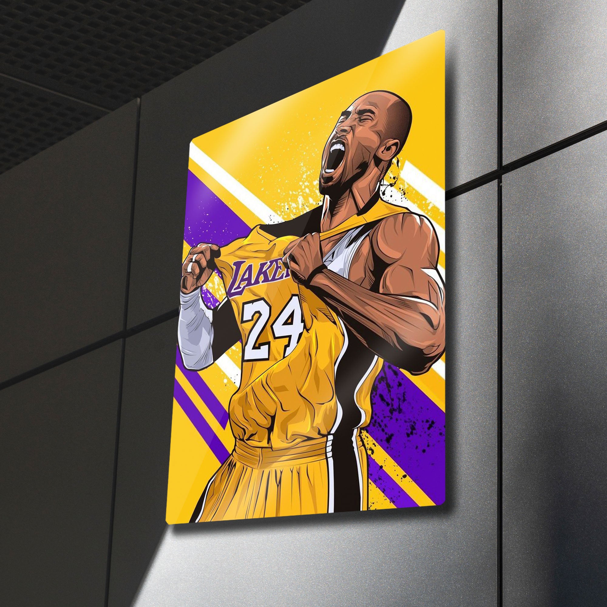 Sahadaki tutkunun, sarsılmaz hırsın ve "Mamba Zihniyeti"nin vücut bulmuş hali: Kobe Bryant! Bu eşsiz metal tablo, basketbol tarihinin en büyük efsanelerinden birinin, Los Angeles Lakers formasına olan bağlılığını ve zafer anındaki o ham tutkusunu, dinamik bir illüstrasyonla ölümsüzleştiriyor.