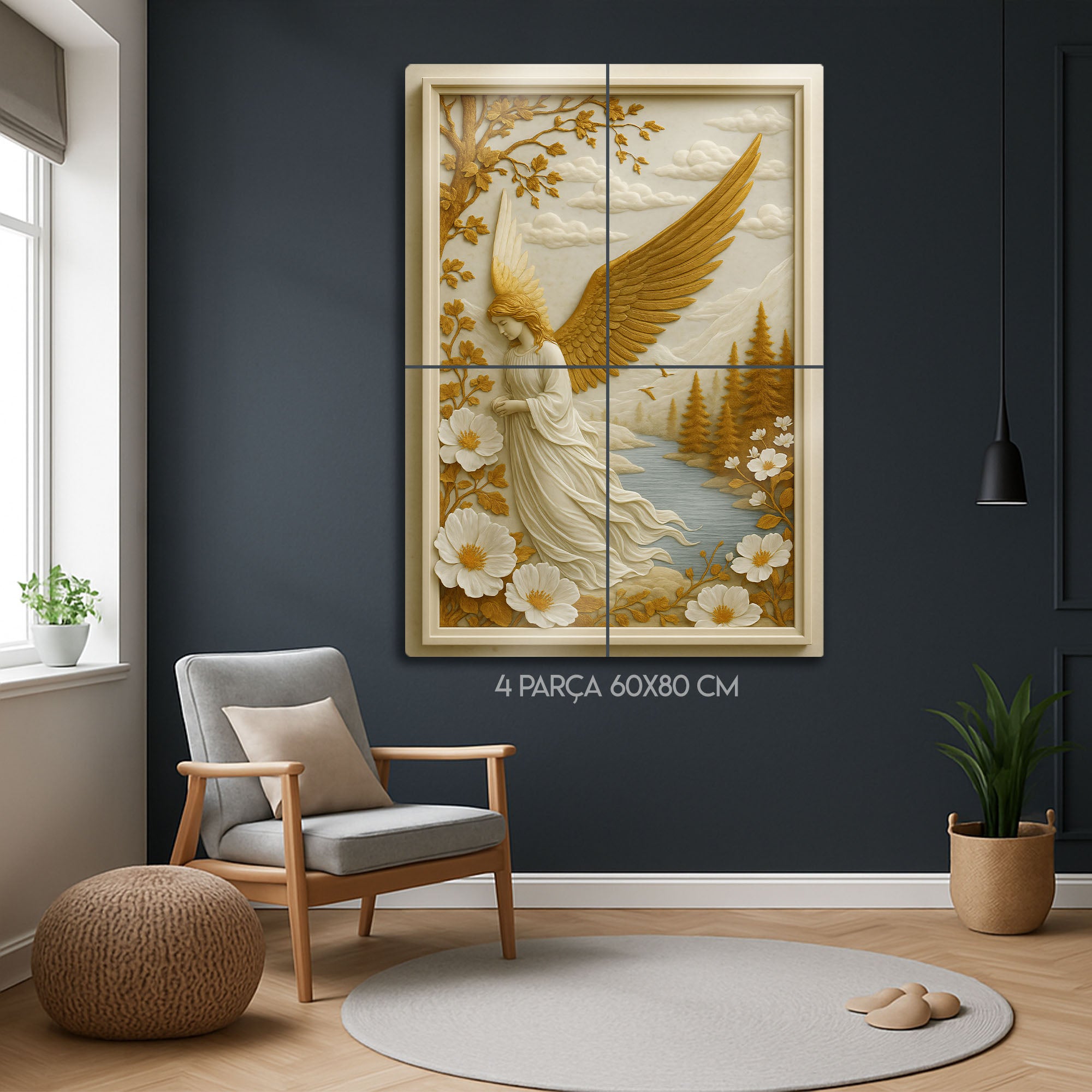 Neoklasik sanatın zarafetinden ilham alan bu tablo, meleğin altın rengi kanatlarını, akıcı elbisesini ve etrafındaki çiçekleri büyüleyici bir detay zenginliğiyle sunar. Bu sanat eseri, salon, yatak odası, dinlenme alanı veya spiritüel bir köşe gibi mekanlara anında huzur, saflık ve sanatsal bir dokunuş getirmek için tasarlanmıştır.