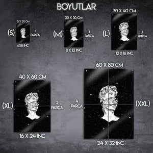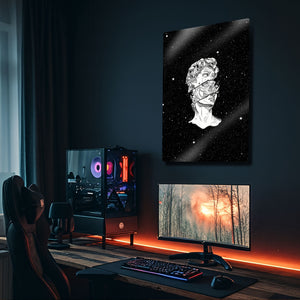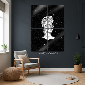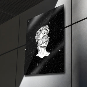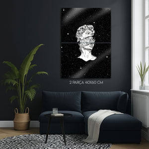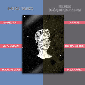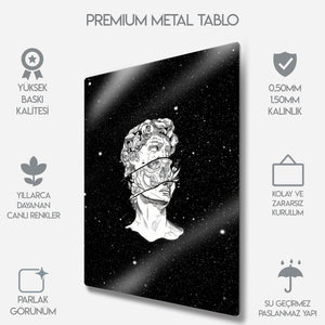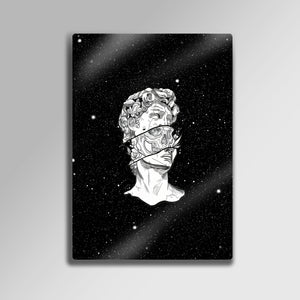 Güzelliğin, sanatın ve insanlığın ardındaki kaçınılmaz son: Ölüm. Bu olağanüstü ve düşündürücü metal tablo, Rönesans'ın başyapıtlarından Michelangelo'nun Davut heykelini, kozmik bir boşluğun ortasında, içindeki kuru kafayı ortaya çıkaracak şekilde parçalanmış bir halde tasvir ediyor.