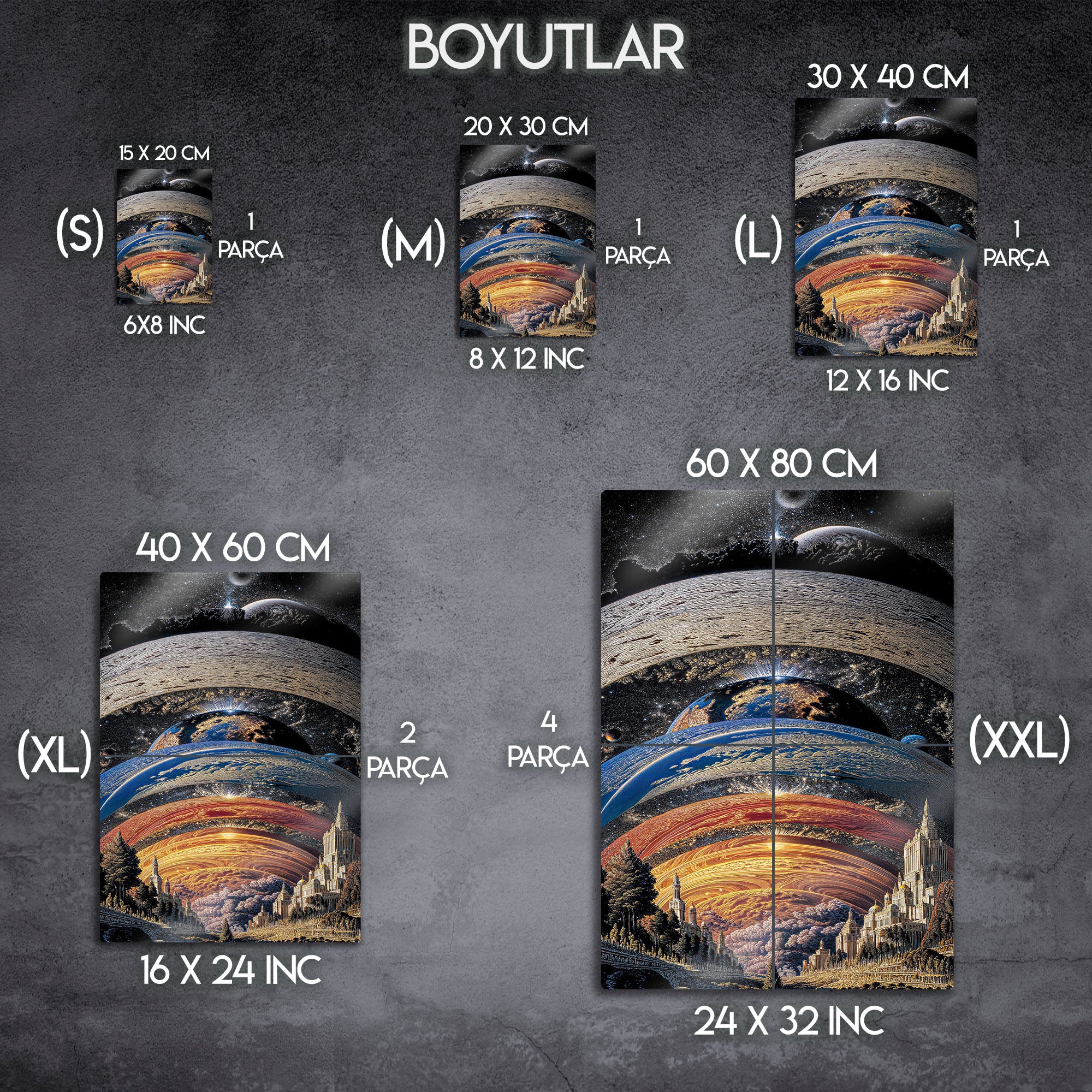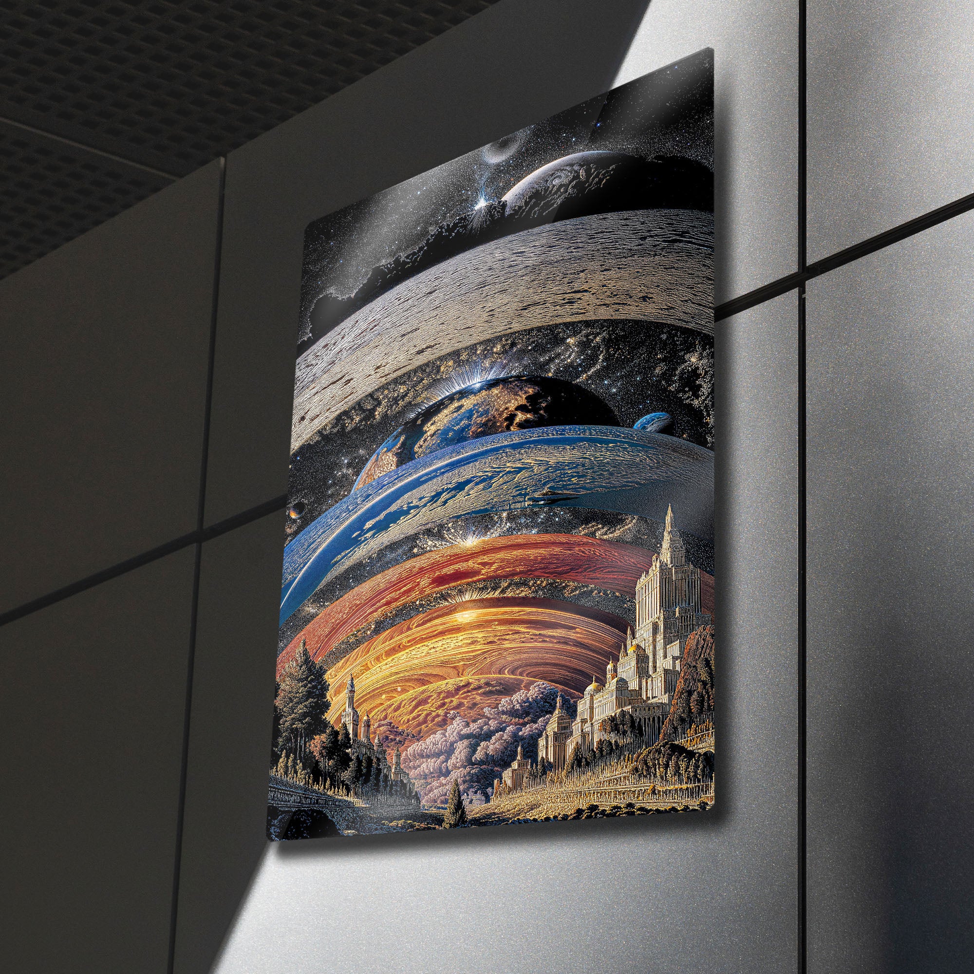 Evrenin sonsuz katmanlarında, medeniyetlerin doğuşundan yıldızların ötesine uzanan bir yolculuğa çıkın. Bu olağanüstü metal tablo, farklı dünyaları, gezegenleri ve varoluşun farklı aşamalarını, üst üste binen katmanlar halinde, nefes kesici bir sürrealizm ve detay zenginliğiyle tasvir ediyor.