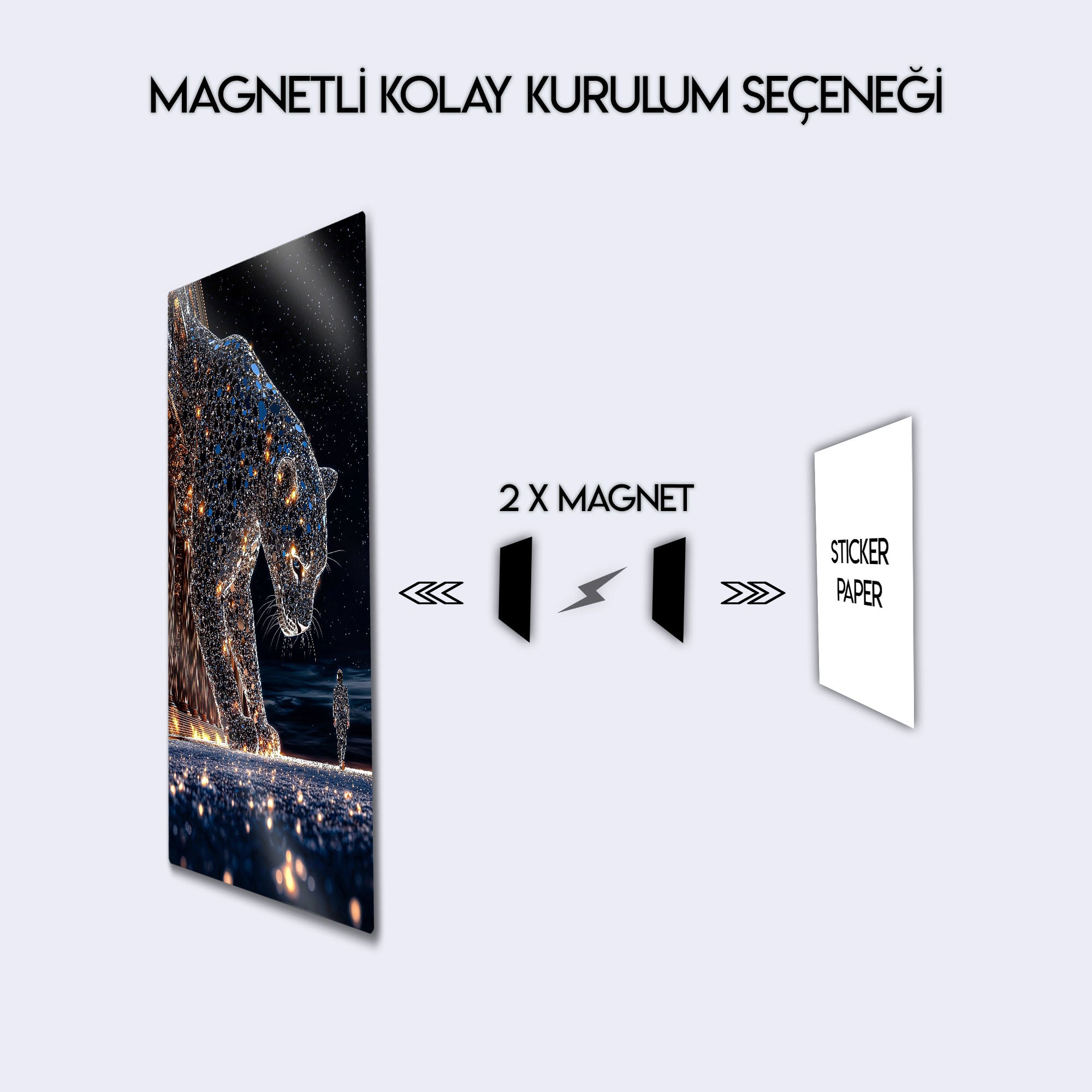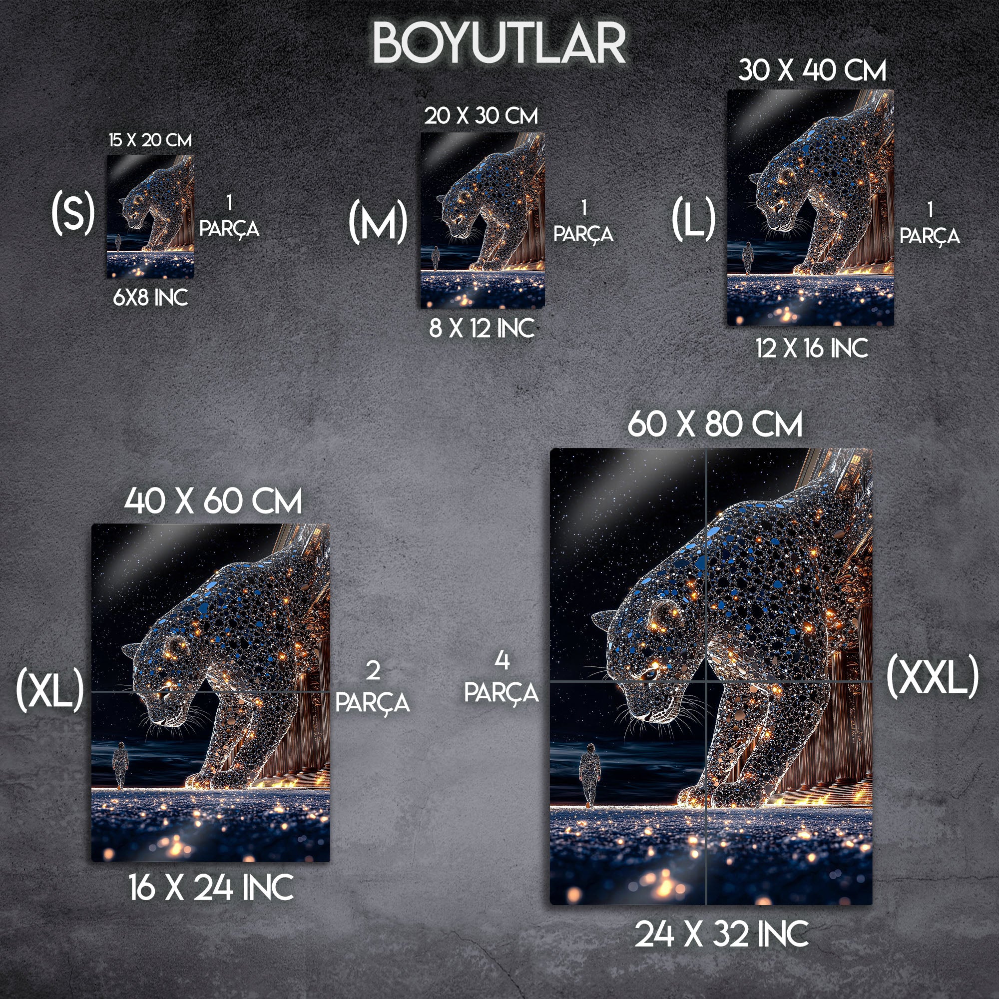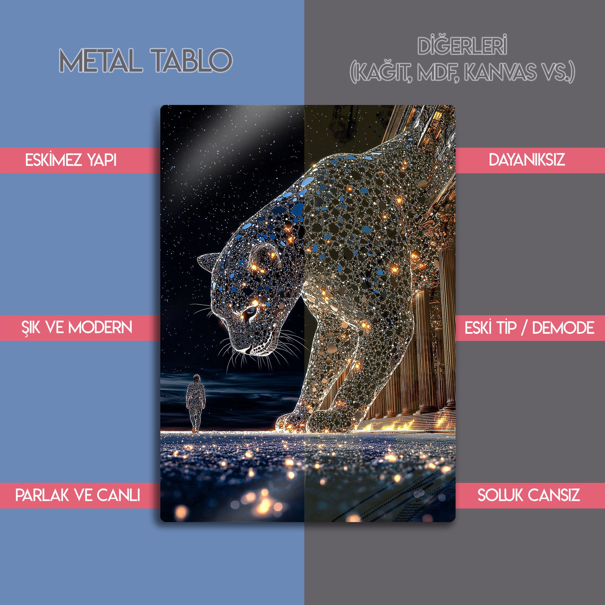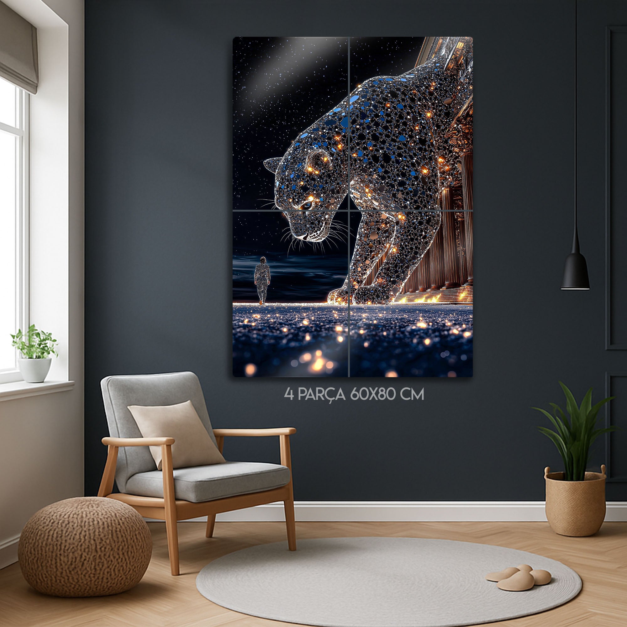 Bu eser, sadece bir dekorasyon objesi değil, aynı zamanda evrenle olan bağımız, içimizdeki güç ve varoluşun büyüklüğü üzerine derin bir felsefi sanat eseridir. Yüksek çözünürlüklü baskı kalitesi, her bir yıldızın parıltısını, panterin mozaik dokusunu ve o anın kozmik atmosferini metalin modern yüzeyinde adeta canlandırıyor. Bu tablo, salon, kütüphane, ofis, meditasyon alanı veya modern yaşam alanlarına anında bir derinlik, gizem ve entelektüel bir atmosfer katacaktır.