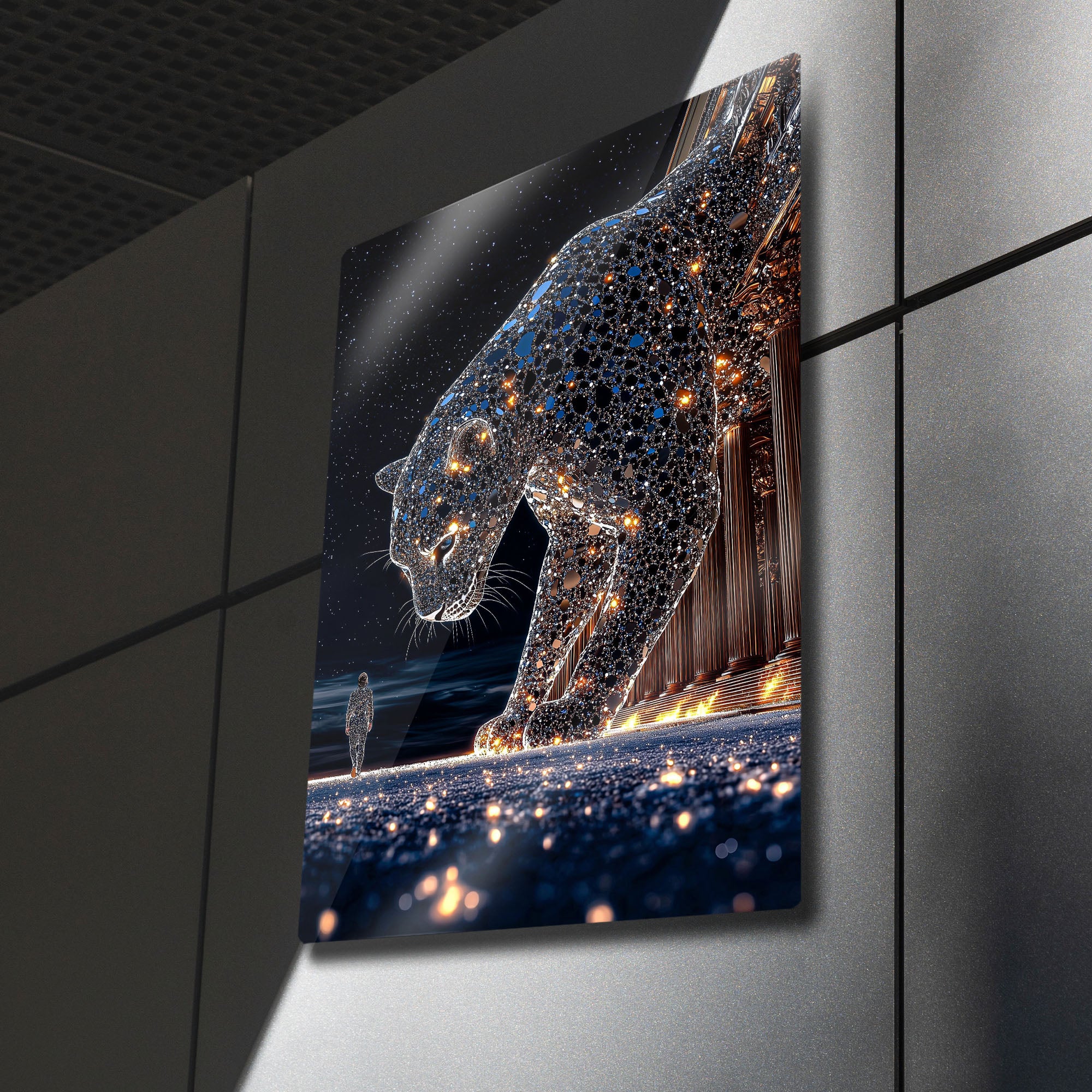 Evrenin gizemini, doğanın gücünü ve insanlığın varoluşsal yolculuğunu tek bir karede birleştiren bu başyapıtla tanışın. Bu olağanüstü metal tablo, adeta yıldız tozundan ve galaksilerden oluşmuş devasa bir panterin, aynı özden yaratılmış minyatür bir insanla karşılaştığı o anı, nefes kesici bir sürrealizmle tasvir ediyor.